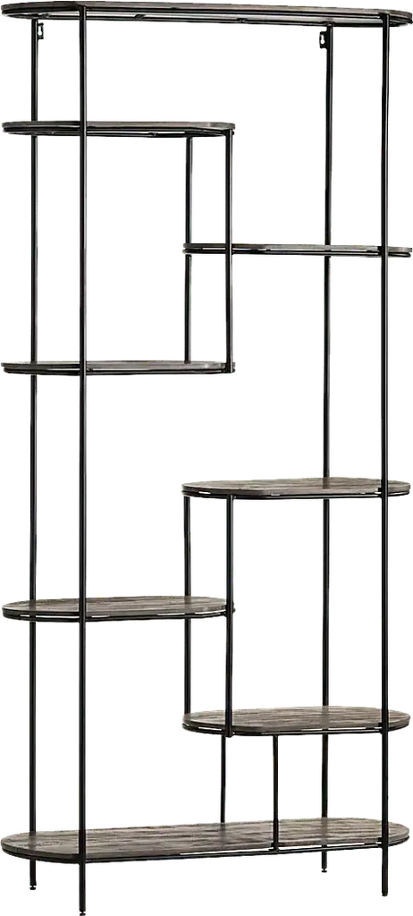 Architectural elegance and utilitarian flair come home in perfect balance with the Lorena etagere, anchoring any space by adding depth, texture, and visual intrigue. Transitional in style, this piece features a sleek black metal frame and round shaped shelves finished in a charming gray hue. The geometric design offers ample display space while creating a sophisticated accent piece.