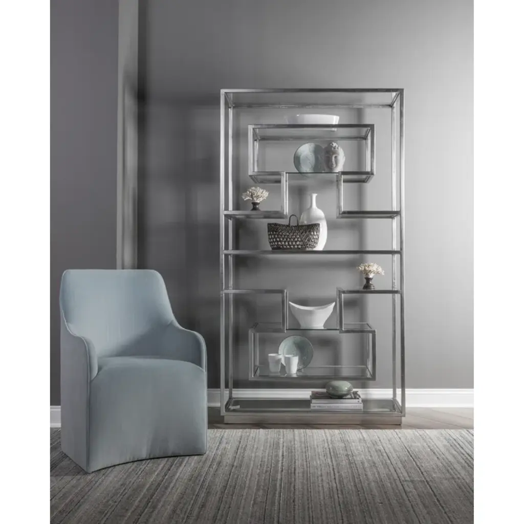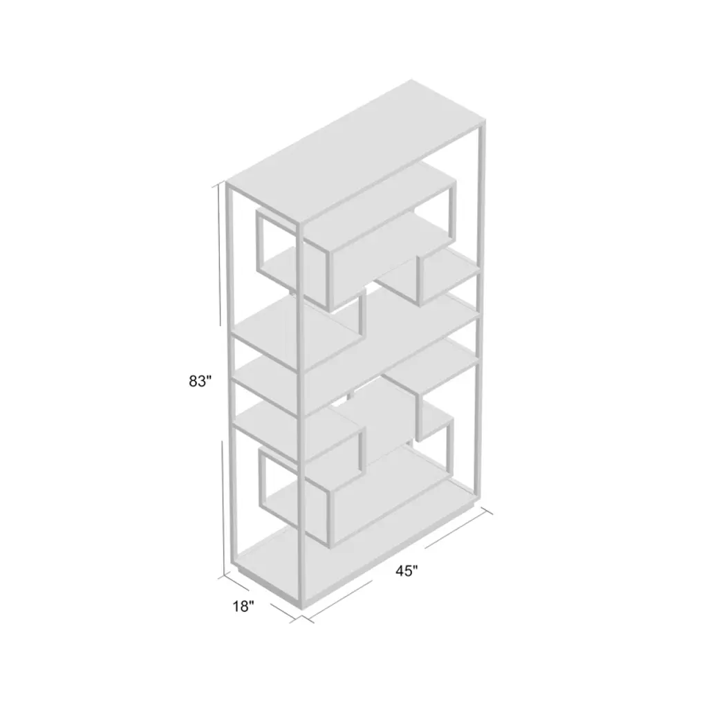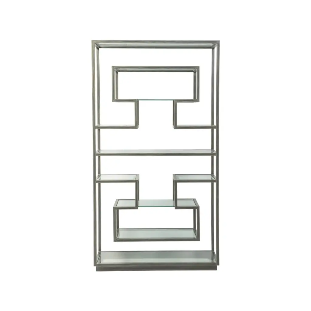 Tubular steel frame with eleven inset glass shelves, all beveled and tempered.