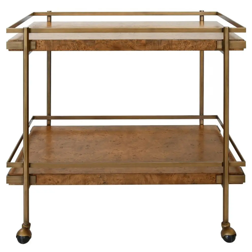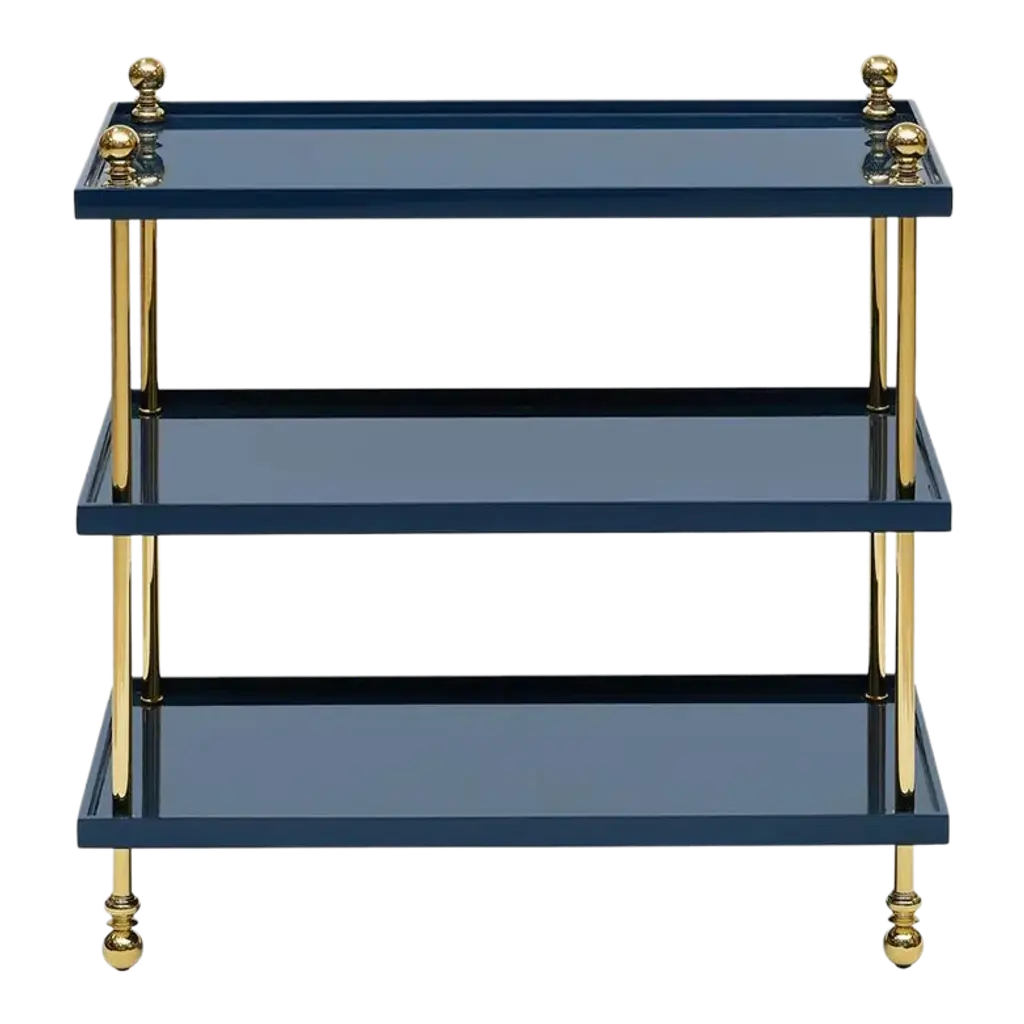 Campaign Style Etagere. A combination of a traditional English campaign style with an updated modern design. This three-tier etagere is a satisfying combination of wood and brass, it has a sophisticated, modern feel to it. Dimensions: 19.75" W x 17.75" D x 25.5" H