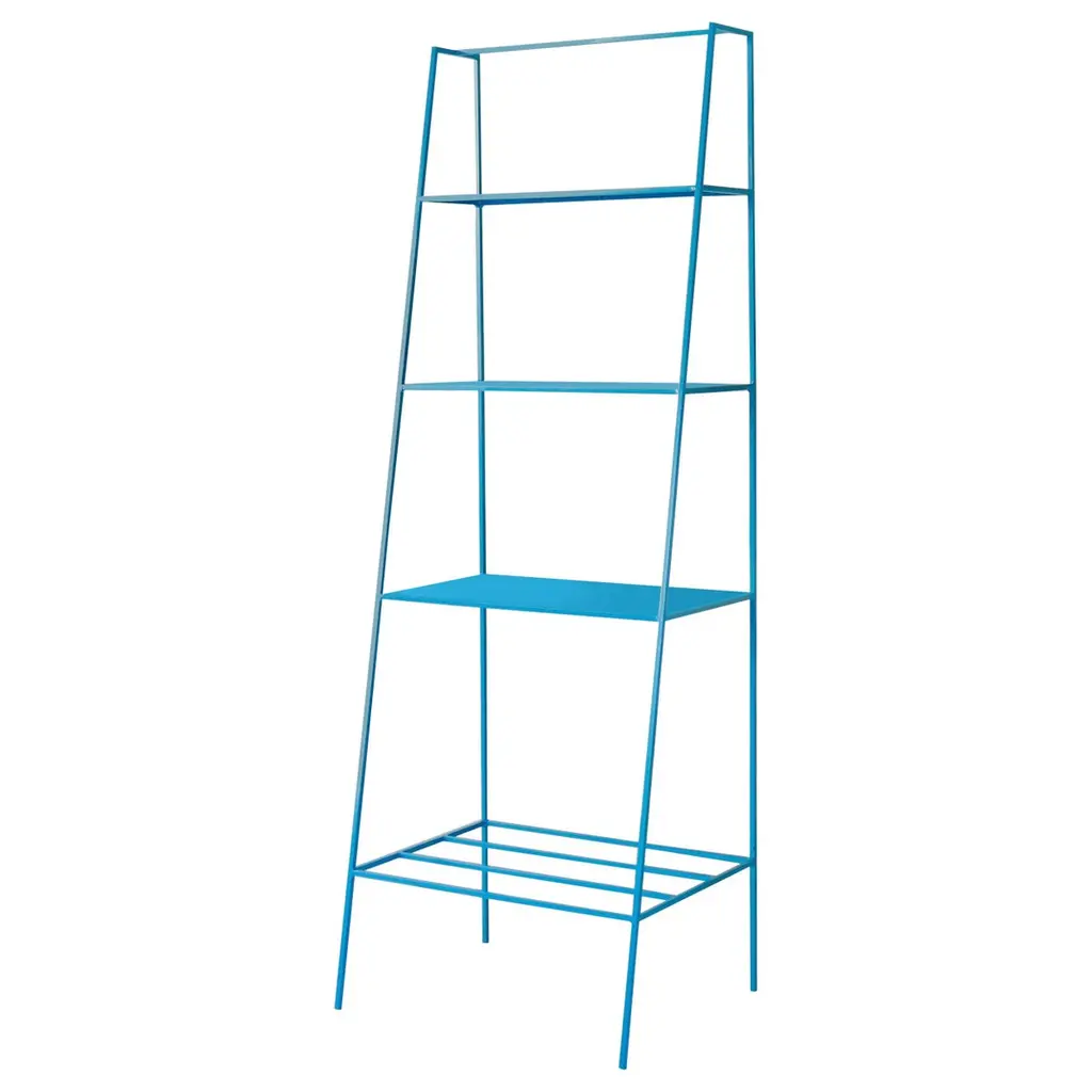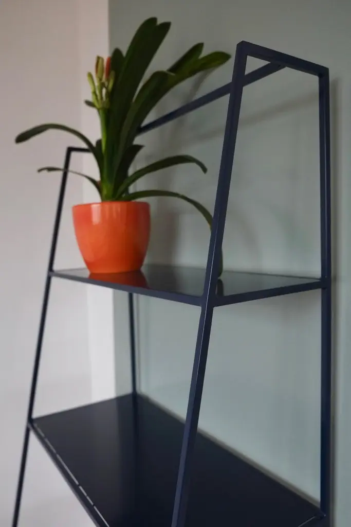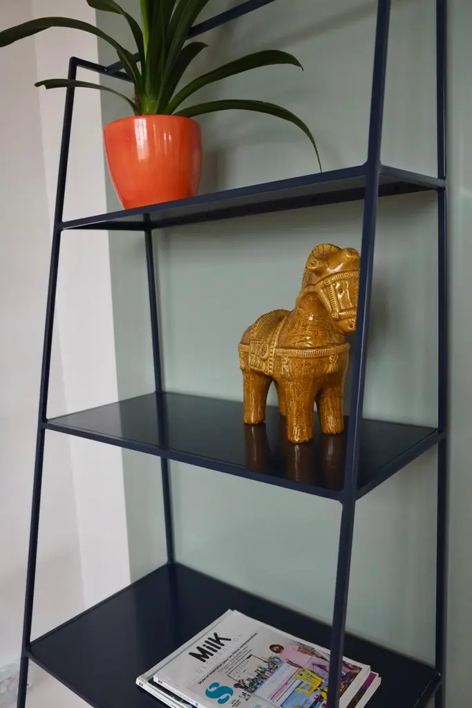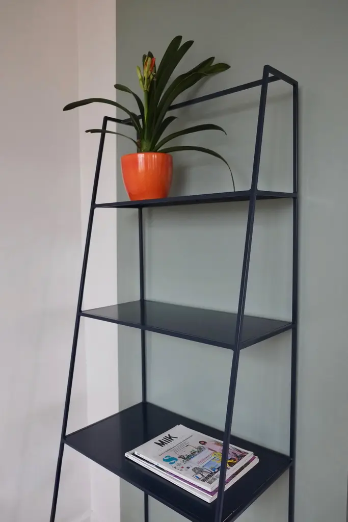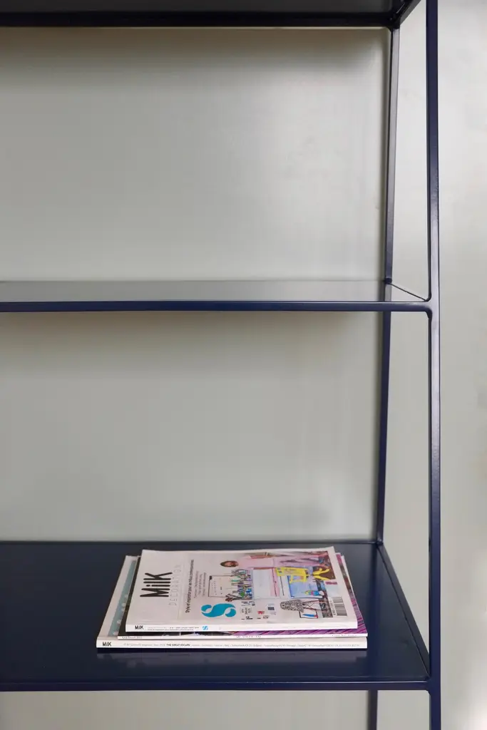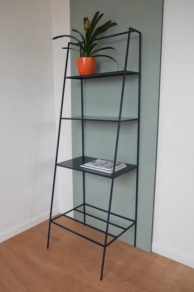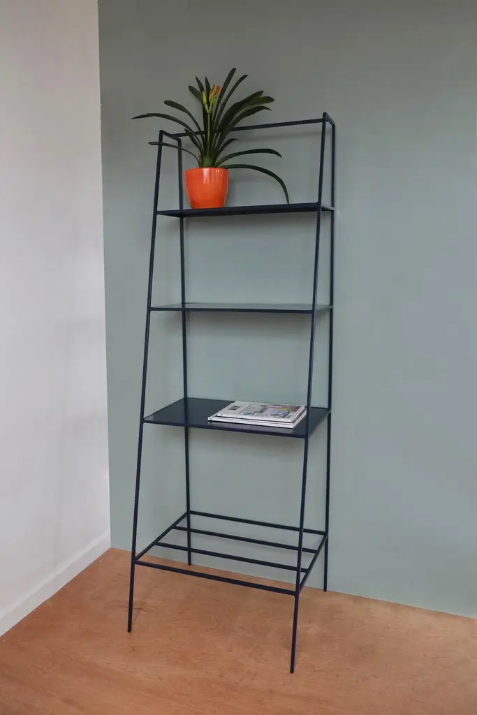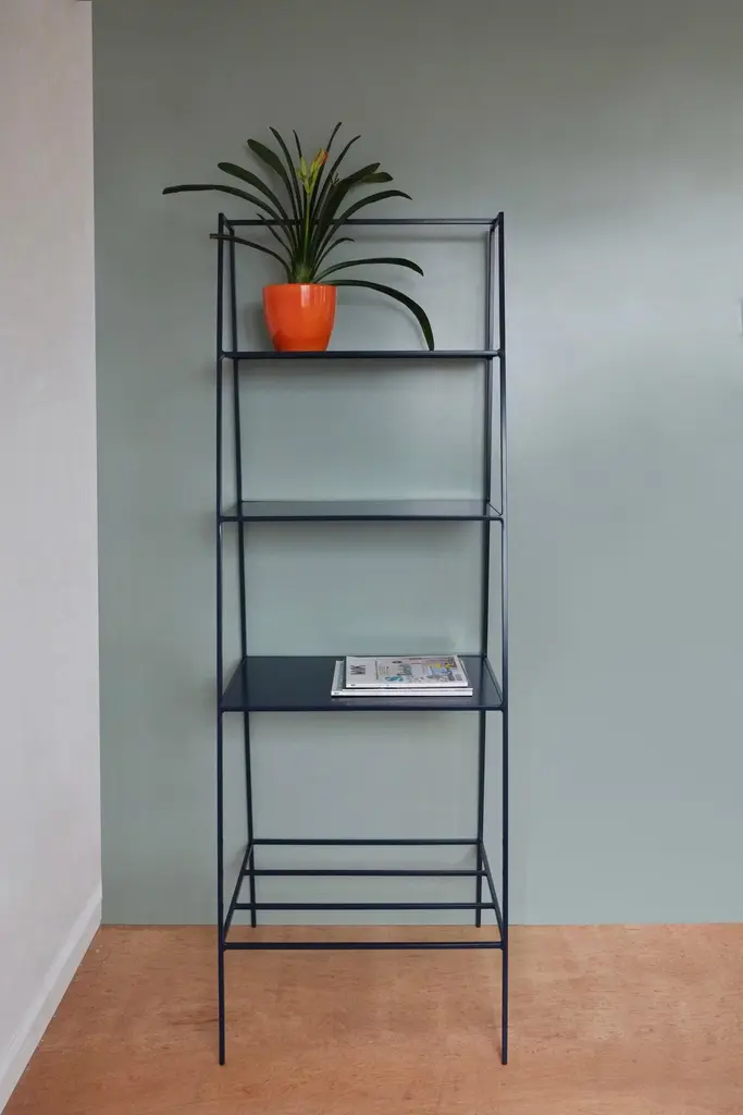 Modern freestanding shelves unit for books and plants. The shelves are designed to look delicate and airy but strong. The straight back design sits neatly against a wall or can be free standing to create a room division. The clean lines look great against period details as well as in modern spaces and the compact proportions compliment modern living. Made in solid steel, with integrated steel shelves, available in twelve powder coated colors. Handmade in UK.Colour samples available to order from our storefront - LU2894331610202 Measurements: 60cm wide, 50cm deep, 175cm tall.&New - Modern British Furniture.