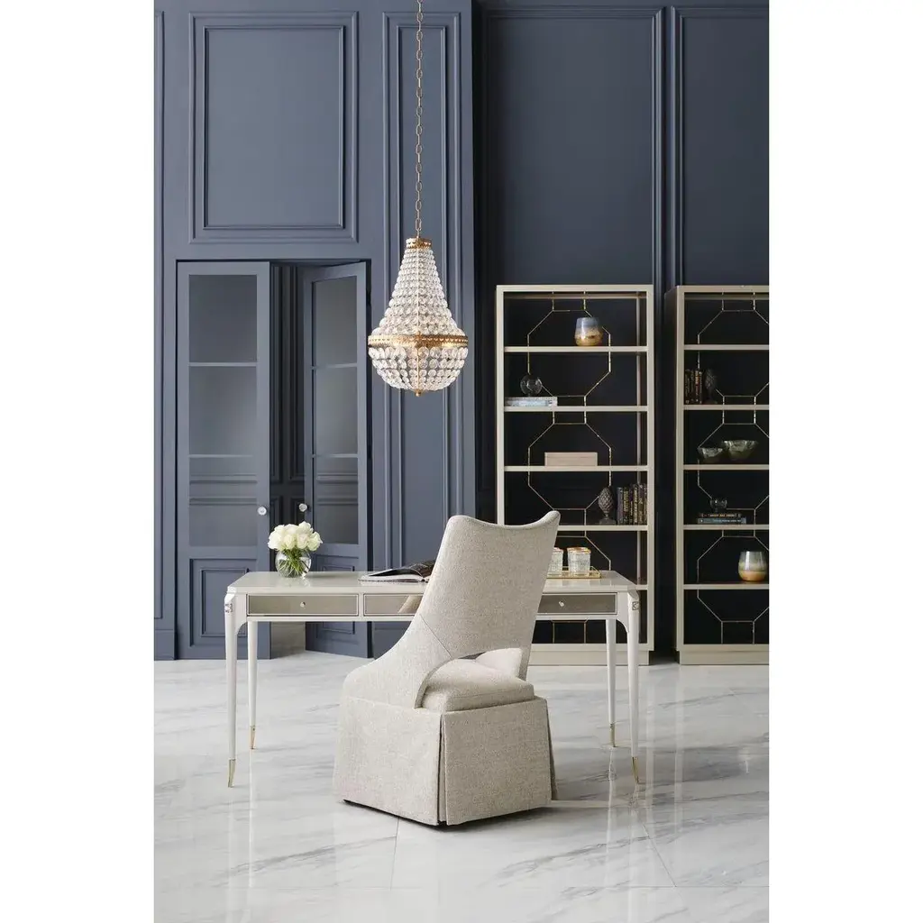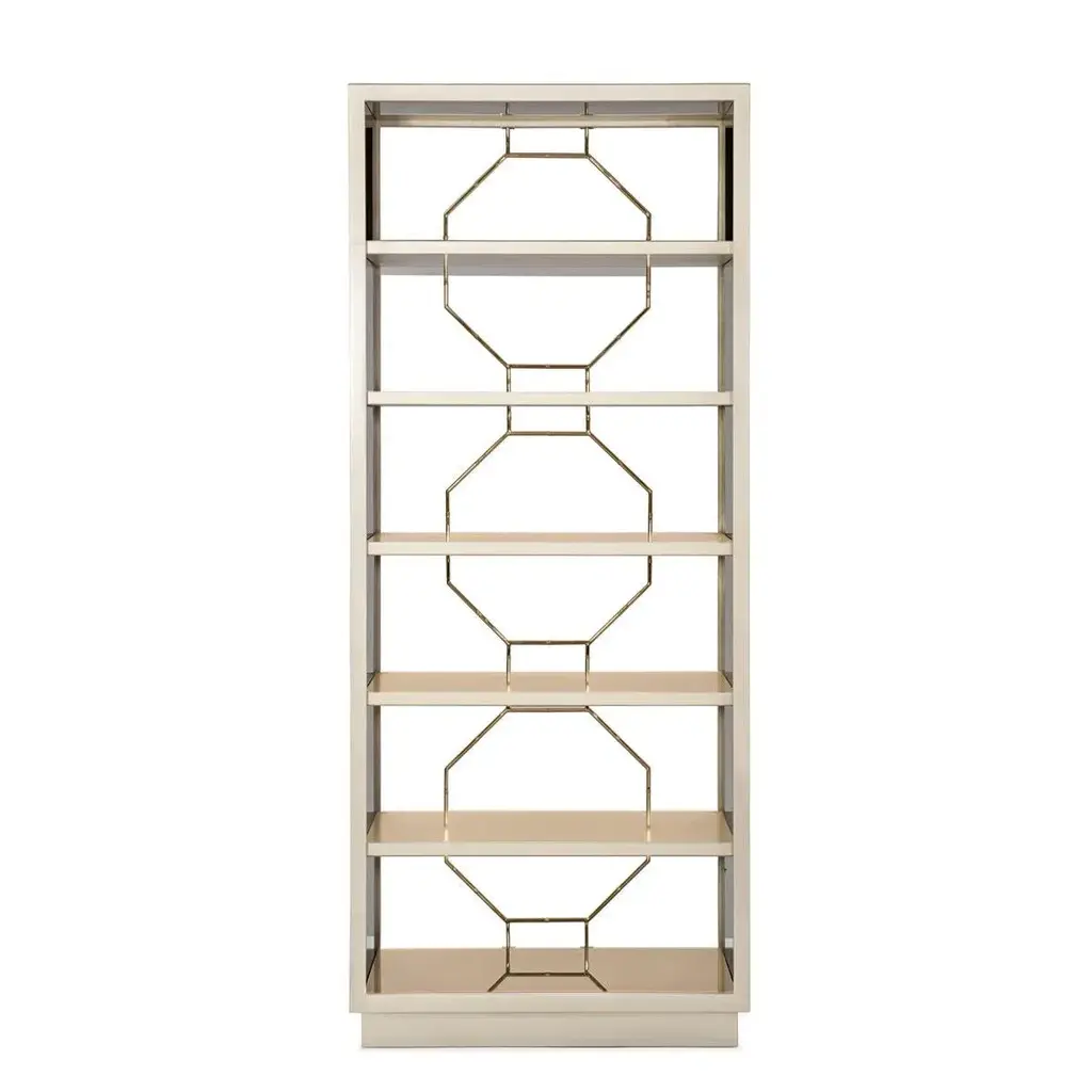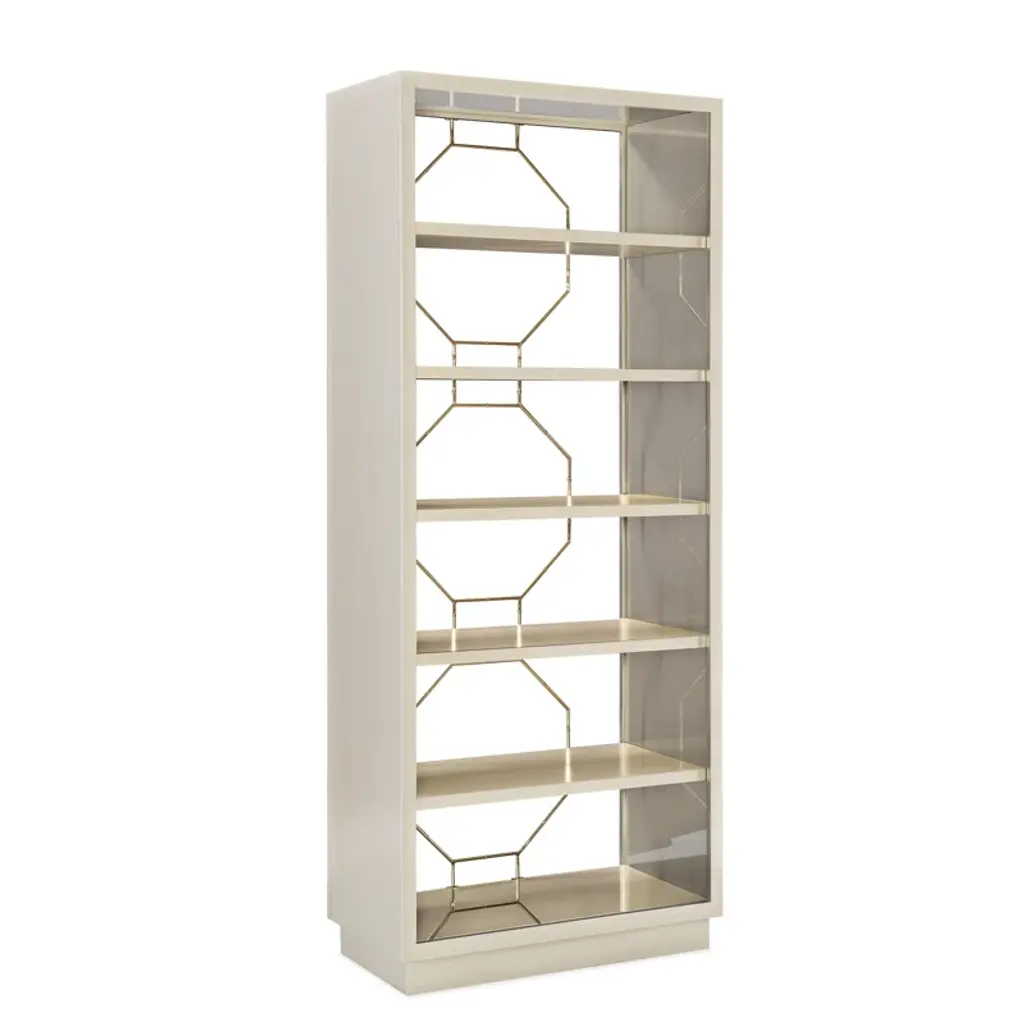 Featuring an all-over Soft Silver Paint enhanced with metal fretwork back in a bamboo motif accentuated with Whisper of Gold Finish. Back-painted glass in a Taupe Metallic distinguishes the interior of this five-shelf display piece. Drawing inspiration from classic Chippendale style, this piece can be used on its own for storage and display or bunched together to make a bold design statement. Dimensions: 36" W x 18" D x 88" H