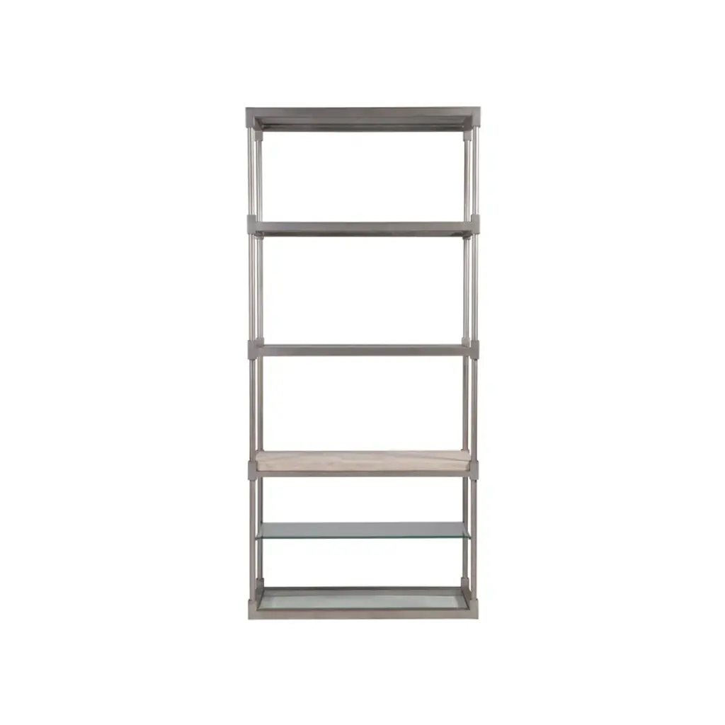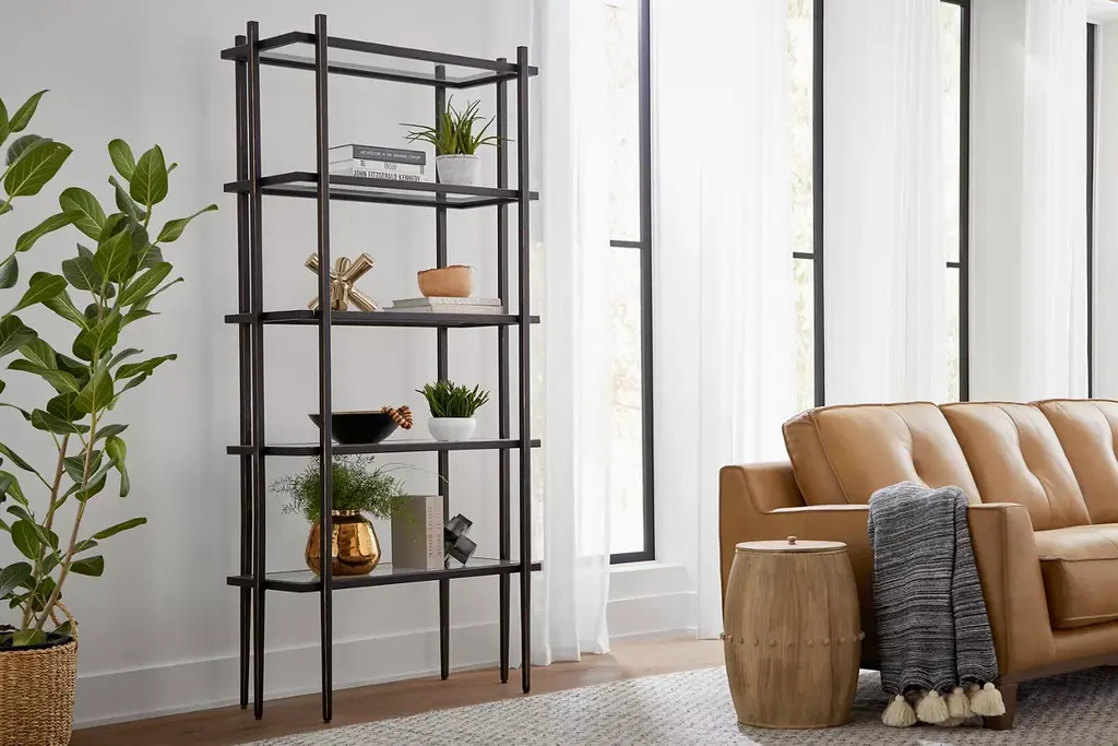 Create a stunning display in your home office or living room with our Olivia etagere. Four fixed glass shelves provide plenty of space to style your books and accessories, while the sleek, iron frame in a bronze finish with gold rub-through adds a modern, sophisticated touch.