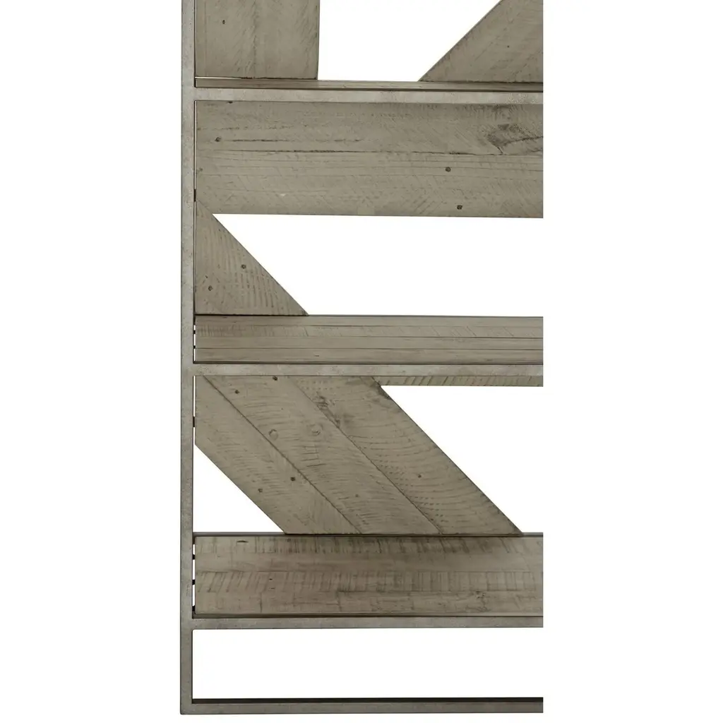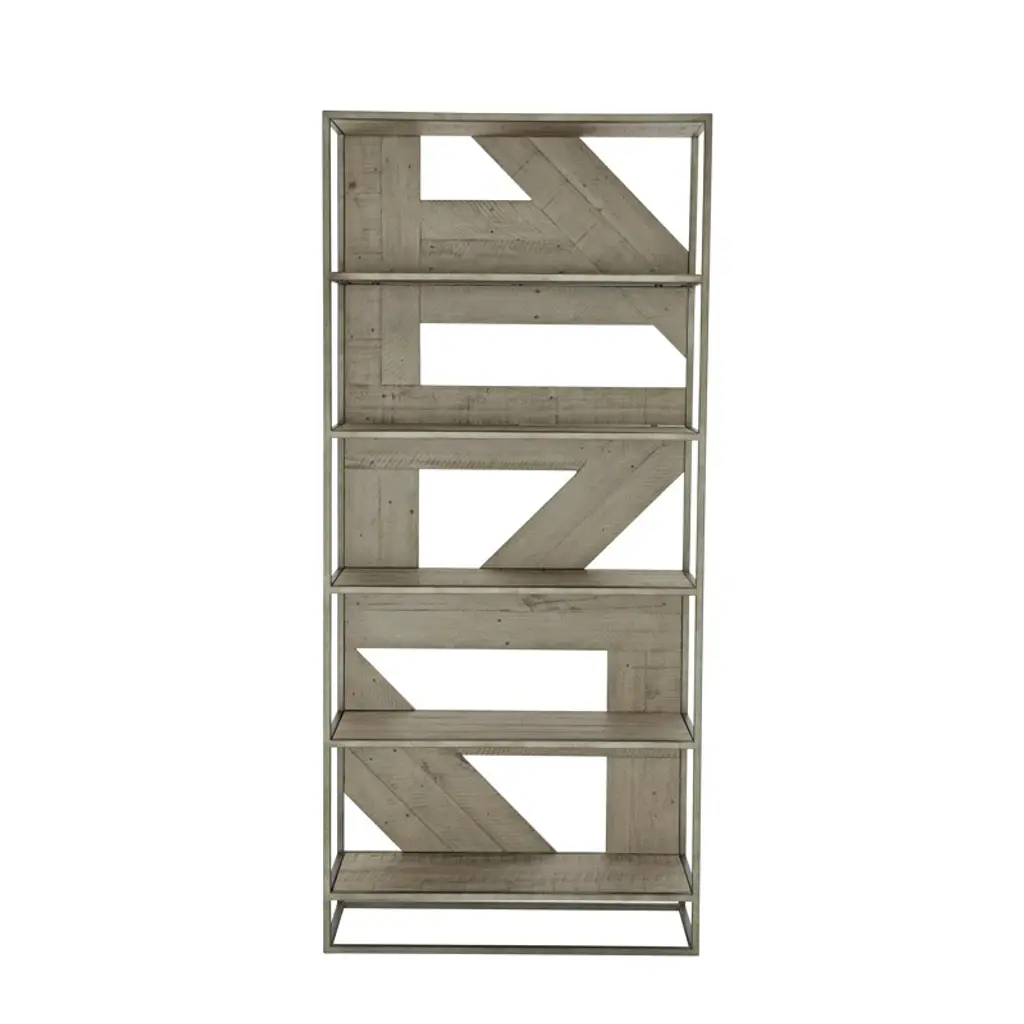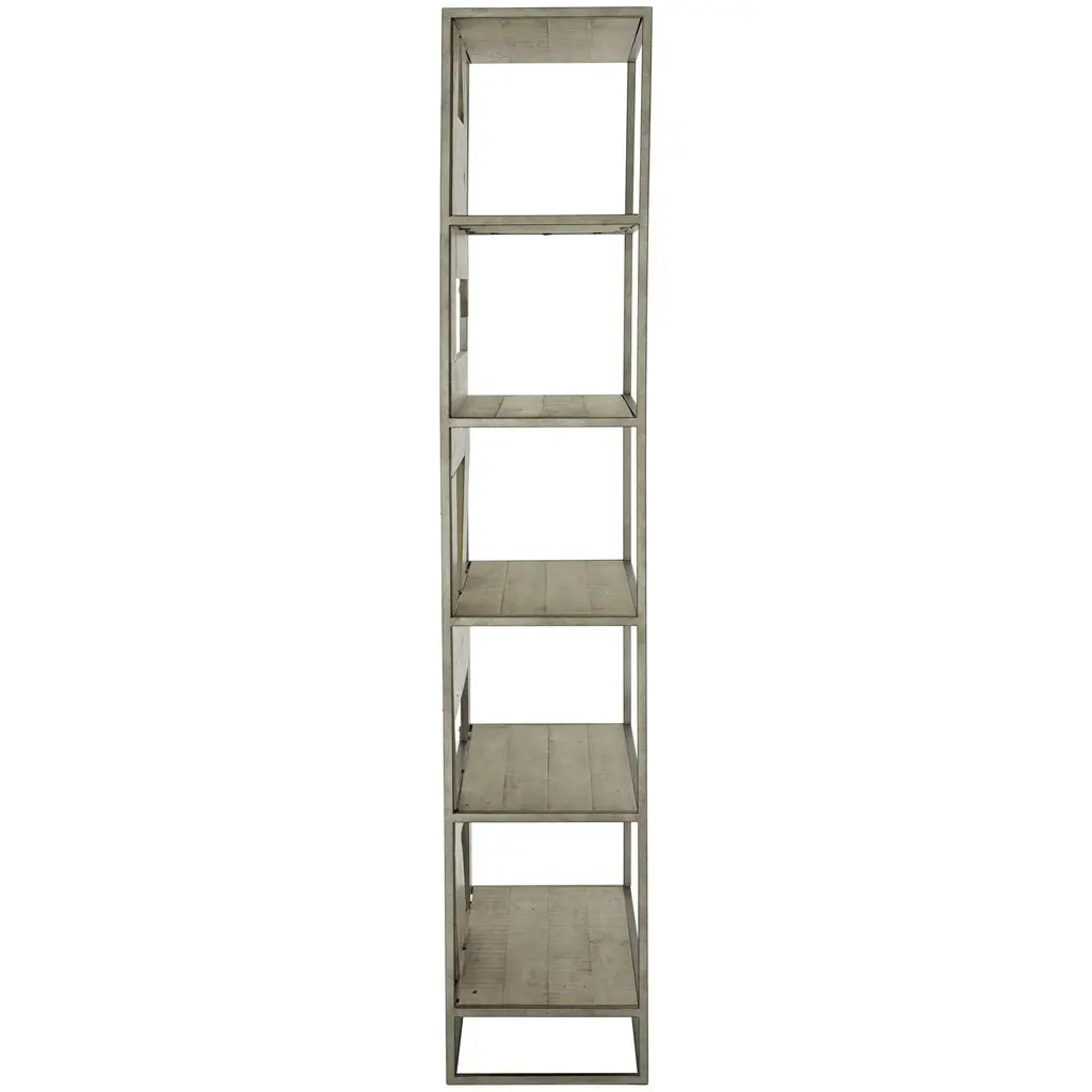 The Highland Park collection, part of Bernhardts eclectic Loft brand, blends the best features of farmhouse and mid-century design, with a one-of-a kind appeal and laid-back vibe. The Polk Etagere, combining a tubular steel frame with rustic planked wood shelving, lends a shabby chic look to your living room or bedroom. Its open shelving is perfect for showcasing heirloom pieces or can simply be used for storage. The wood back in an open geometric pattern gives this bookcase a unique touch. From the Manufacturer Tubular steel frame in Glazed Silver finish Planked wood top and five shelves in Morel finish Back panel consists of both open areas and planked solids in Morel finish Adjustable glides Anti-tip kit