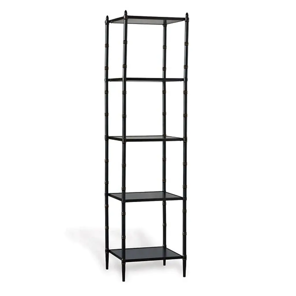 The Doheny bronze etagere by Port 68 is a timeless classic for any room. Used as pairs in the living or dining room, or in the master bath with thick towels stacked--- the etagere is a designer basic with its accents of bamboo. The trim and bamboo supports are made of steel and finished in an antiqued bronze finish. The MDF insert shelves secure to the metal shelf frame and are finished in gloss black. Ever so chic! Please note: the etagere is shipped knocked down. Minor assembly is required with easy assembly instructions. Our shelves may also attach to the wall for extra stability if required with a metal L clip. All instructions and hardware included. Shelf unit includes adjustable nylon glide feet. Material: Steel, MDF Finish: Antique Bronze Dimensions: 20" W x 78" H x 18" D Weight: 51 lbs. Ships Via: UPS Free shipping in the U.S.