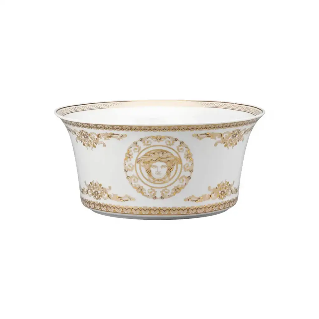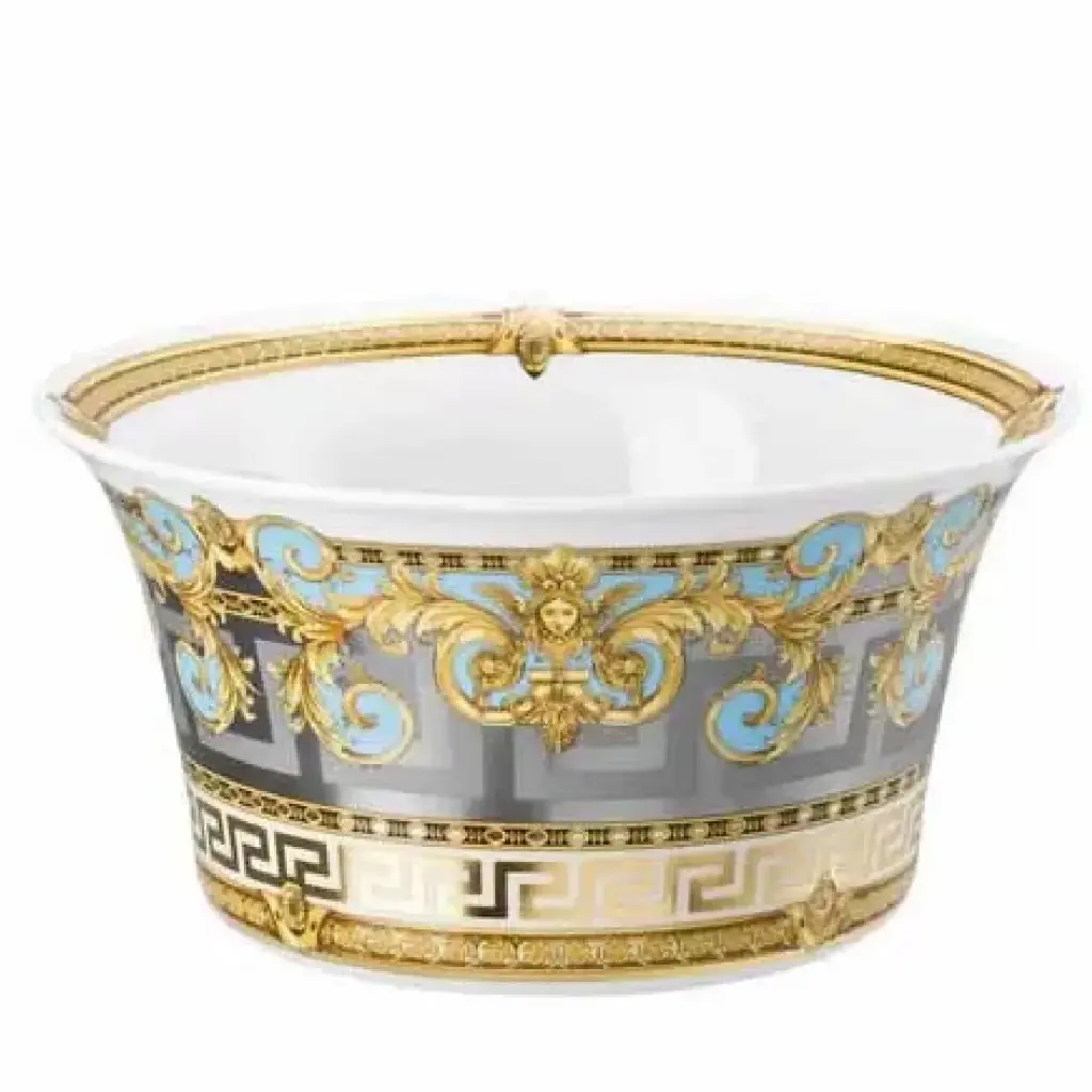 This exquisite Versace dinnerware is called Prestige Gala Le Bleu. It is produced using the finest porcelain creating a style that is best described as luxurious and glamorous. Lavish ornaments decorate this piece and make it a 'must have' for everyone in love with opulent design. With this decor the colors are melted into the glaze at 1000 degrees C. Here the glaze softens and the decor sinks into it, thus making color and luminosity indestructible. It is scratch- and wear-resistant. However, gold decors are not totally scratch resistant by virtue of their natural material properties. This decor was tested by the Rosenthal Institute for Material Technology (IWT).