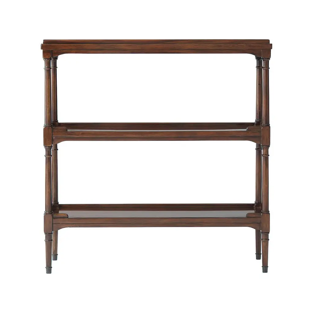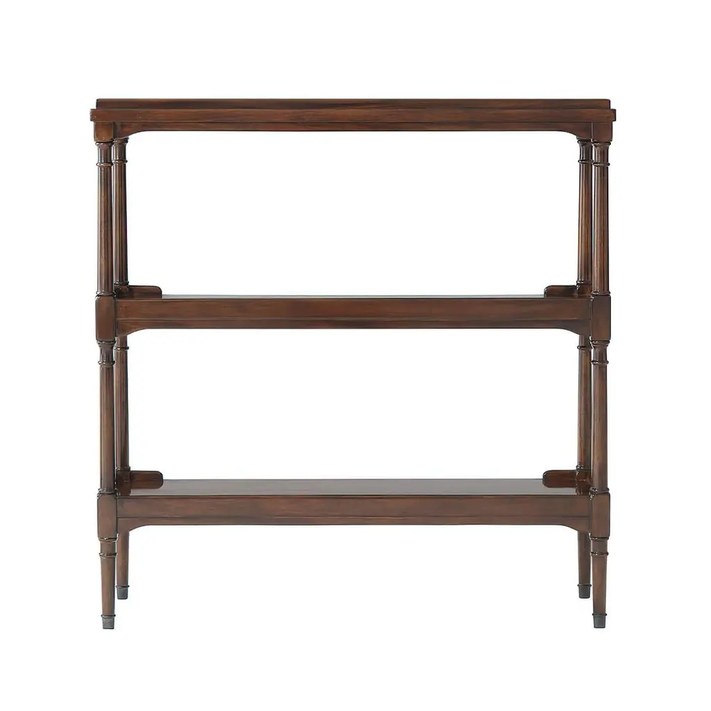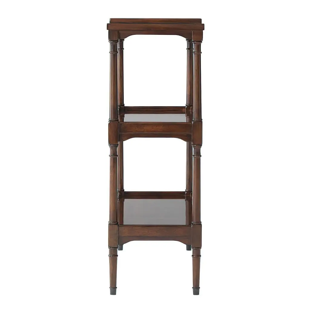 A Regency-style mahogany three-tier console table or étagère, with dished tiers, turned supports on verdigris brass cappings. Dimensions: 31" W x 11" D x 31.75" H.