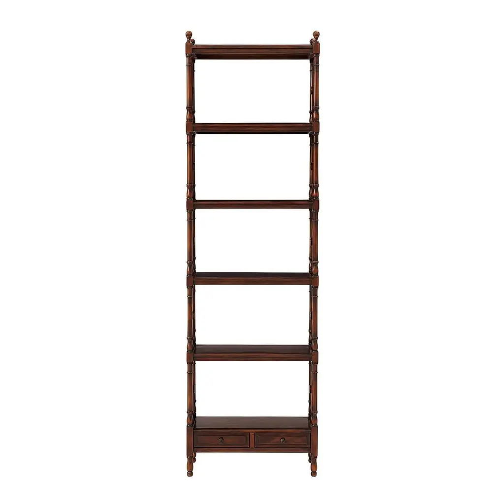 A Regency style six tier etagere bookcase with X frame supports, carved finials and a lower two drawer shelf.Dimensions: 22" W x 10" D x 73.5" H.