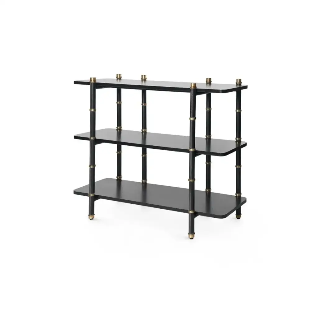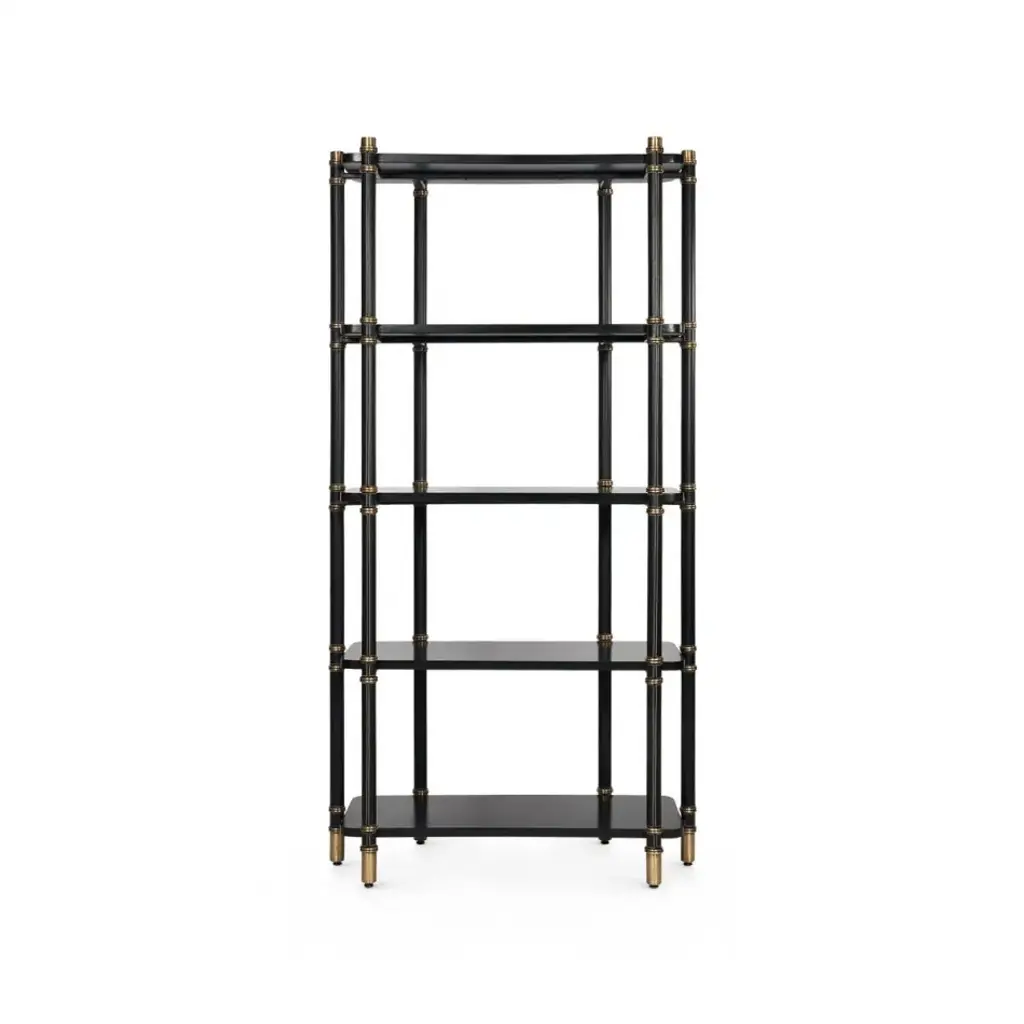 The Reneau Collection is a captivating reinterpretation of modern French furniture. Featuring five tiers of elegant shelving, this piece is a testament to refined craftsmanship. The corner posts are fully wrapped in leather with contrast stitching and accented by rings of antique brass to create a captivating visual appeal that mimics bamboo. The sleek lacquered shelves feature gracefully rounded edges and offer both style and durability. With its versatile charm, the Reneau Etagere effortlessly enhances any room, from dining rooms to living spaces.