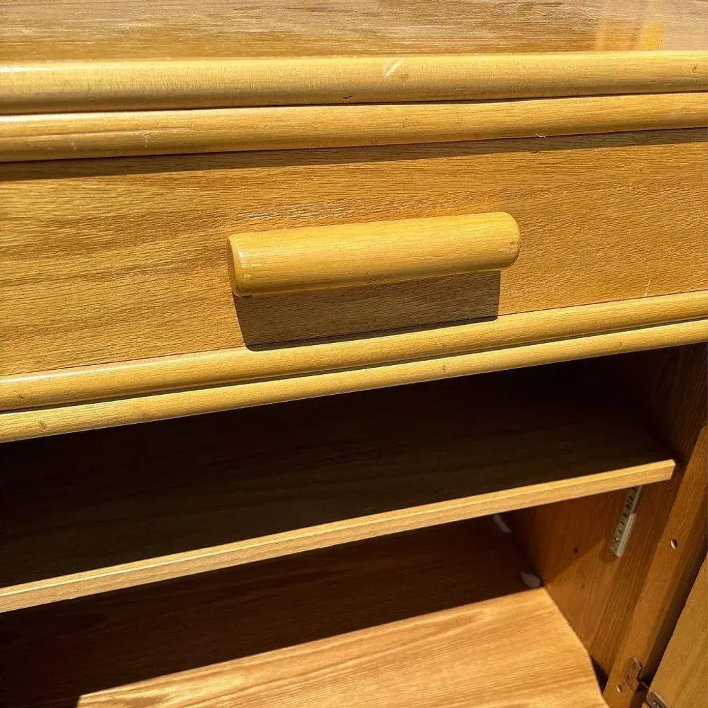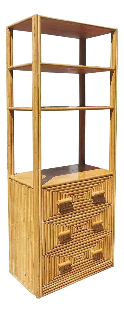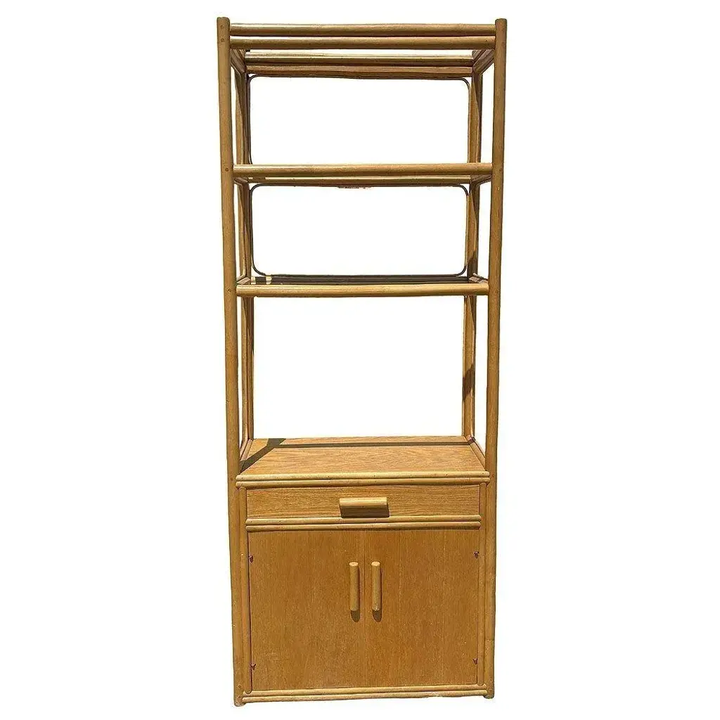 Restored high-style rattan etagères showcase featuring 3 glass shelves, a center drawer, and a breakfront cabinet underneath. The natural tone of the rattan frame and mahogany bring a warm, organic feel to this modernist piece. It is ideal for adding Mid-century design with a Hawaiian flair. Dimensions: 82" Height x 33" Width x 16" Depth" 2 Available United States, 1950s