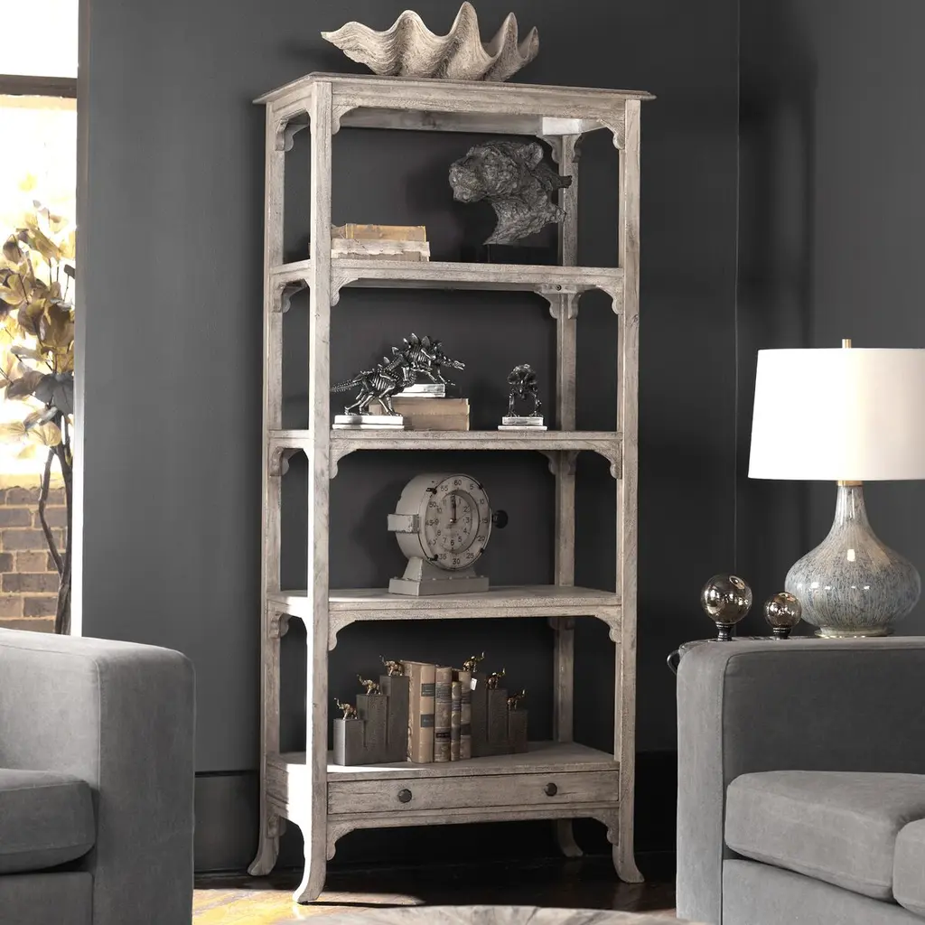 The Rosalind Etagere is a timeless piece that exudes elegance and charm. Crafted from plantation-grown mango wood, it boasts a solid, carved, and dovetail construction that speaks to its durability and craftsmanship. The deep-grained mindi veneer adds a touch of sophistication, while the aged finish enhances its vintage allure. Antique drawer pulls complete the look, offering a hint of nostalgia and romance. This etagere is not just a piece of furniture; it's a statement of style and grace, perfect for those who appreciate the finer things in life.
