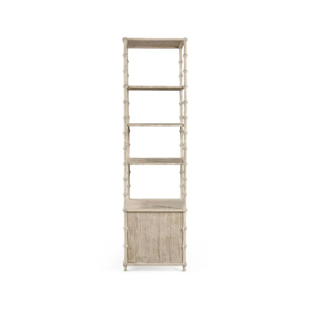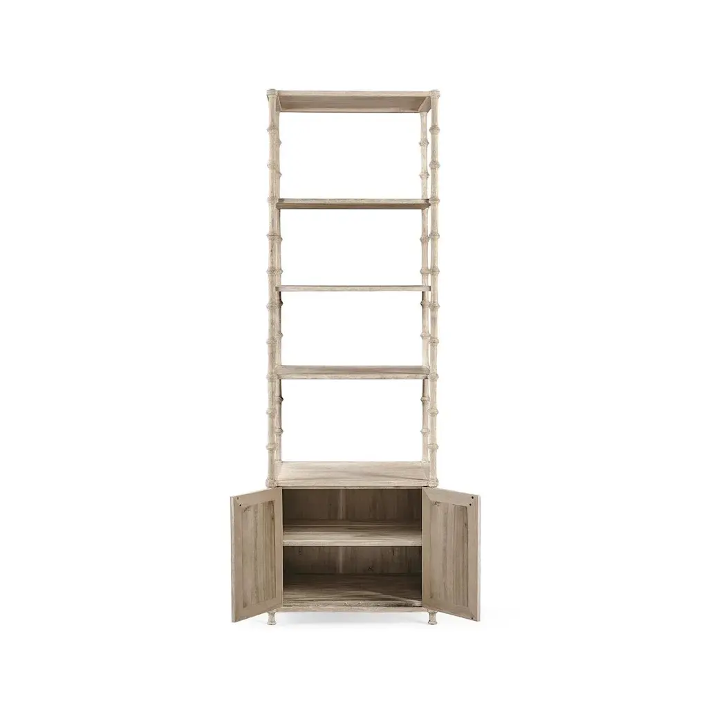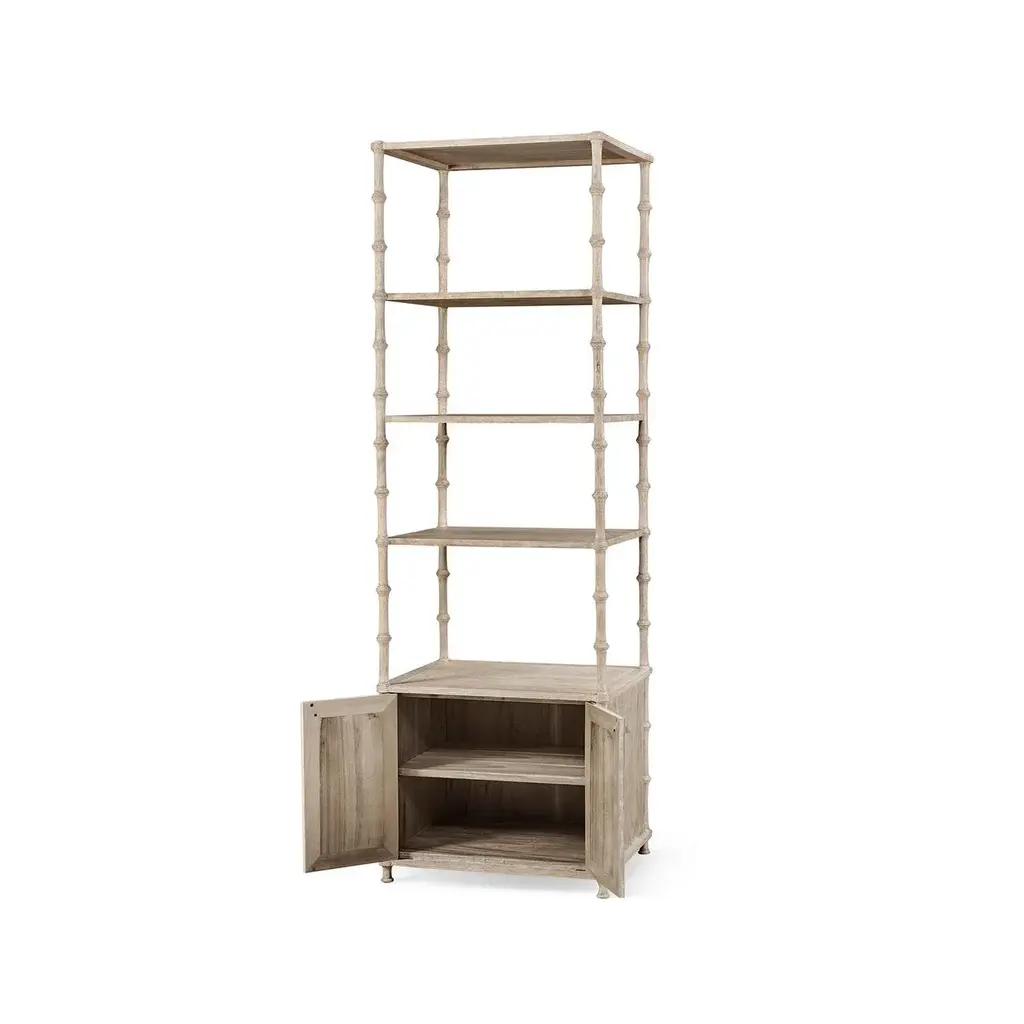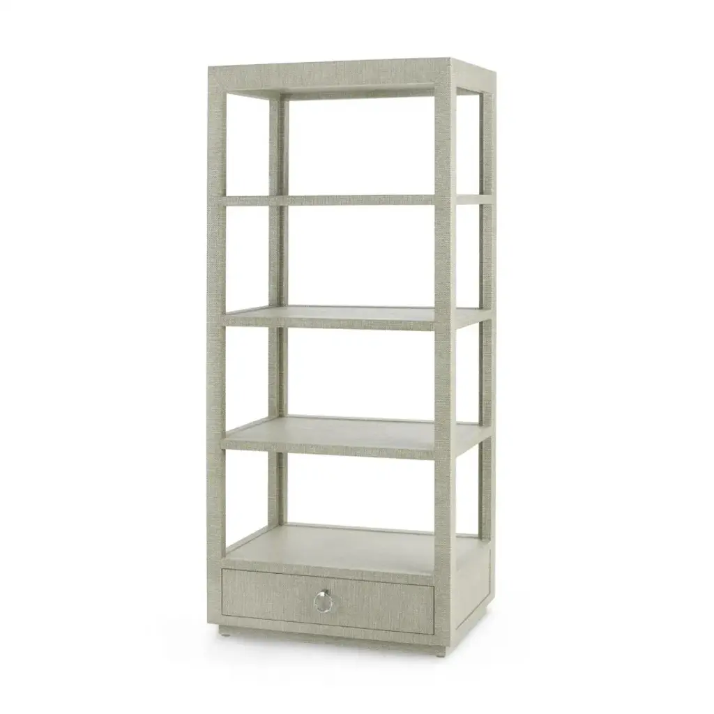 Crafted with a patchwork of acacia wood, the tier tops offer a modern twist on traditional parquet flooring, providing a unique and stylish solution for your books and cherished objects. Perfectly suited for grouping in twos or threes, this etagere enhances any space with its timeless design and functional beauty. Dimensions: 28" W x 24" D x 86 5/8" H