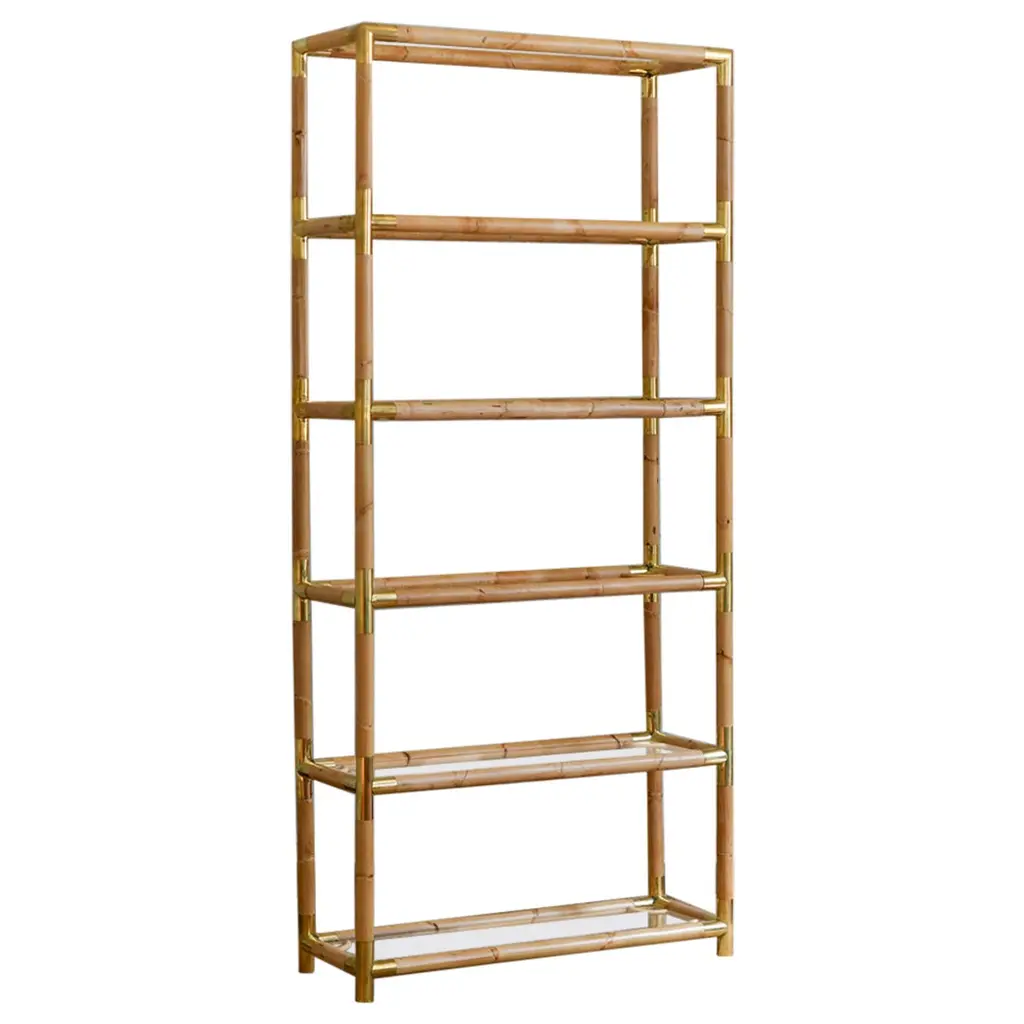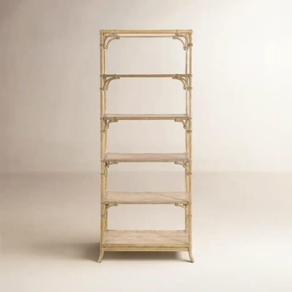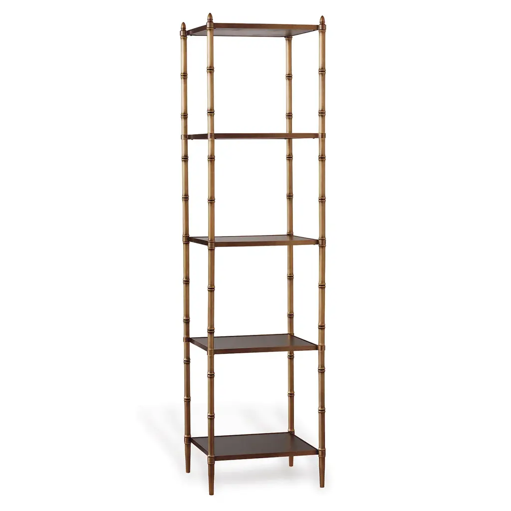Light, airy designs in solid iron finished in antiqued gold leaf. This slender, shallow form features a single quartz-like Grano de Sal marble shelf and five tempered glass shelves.