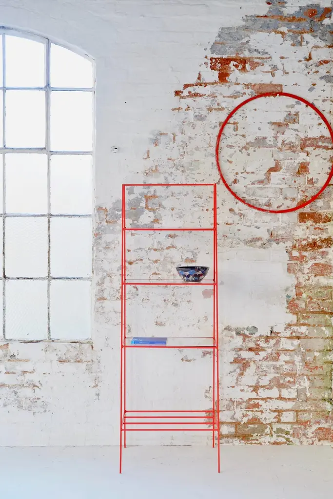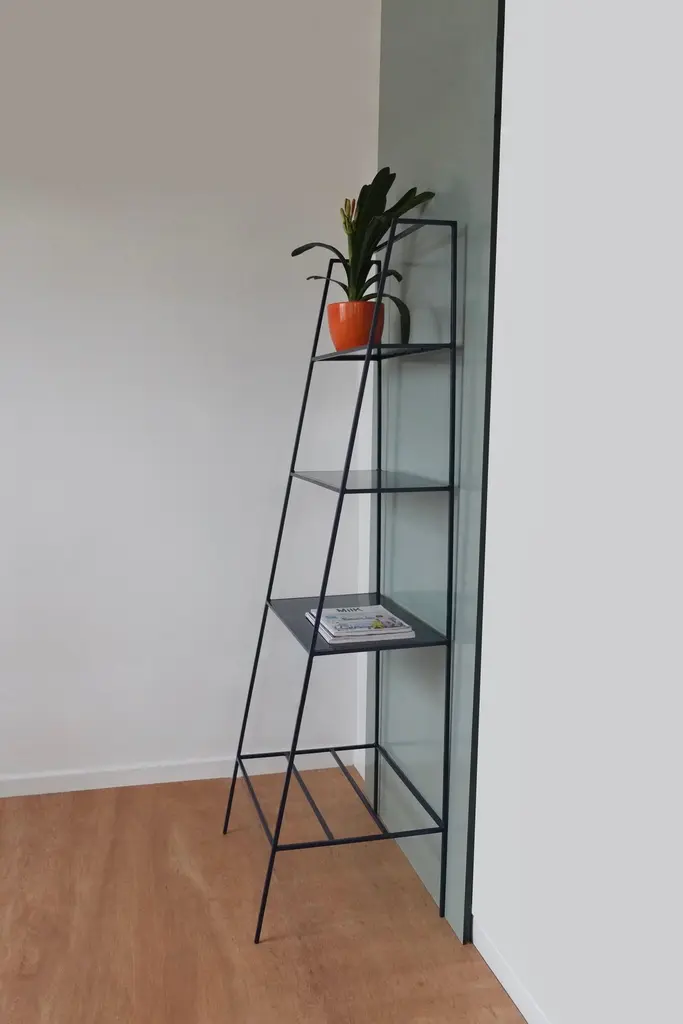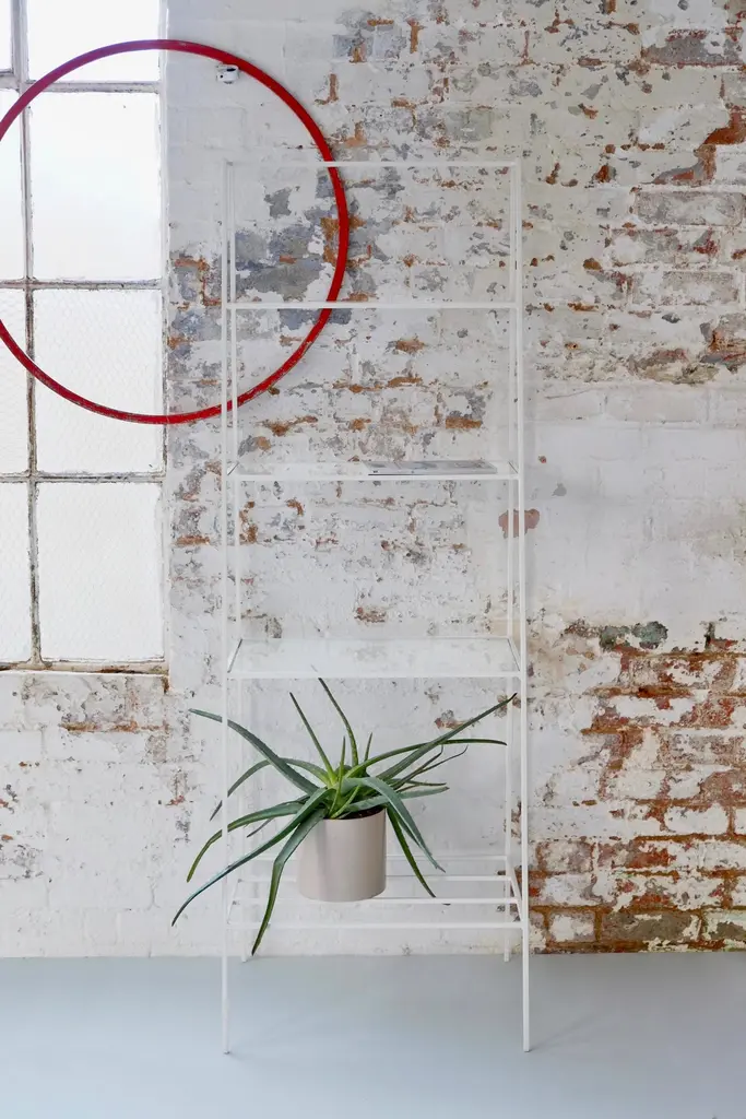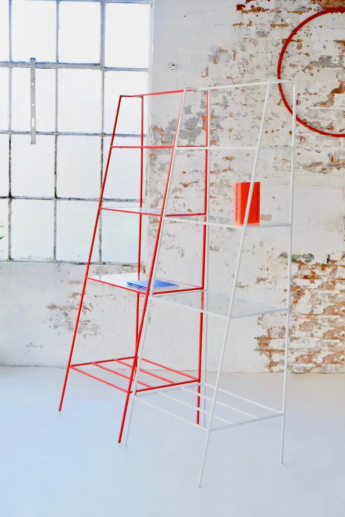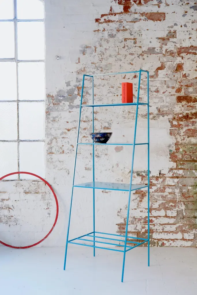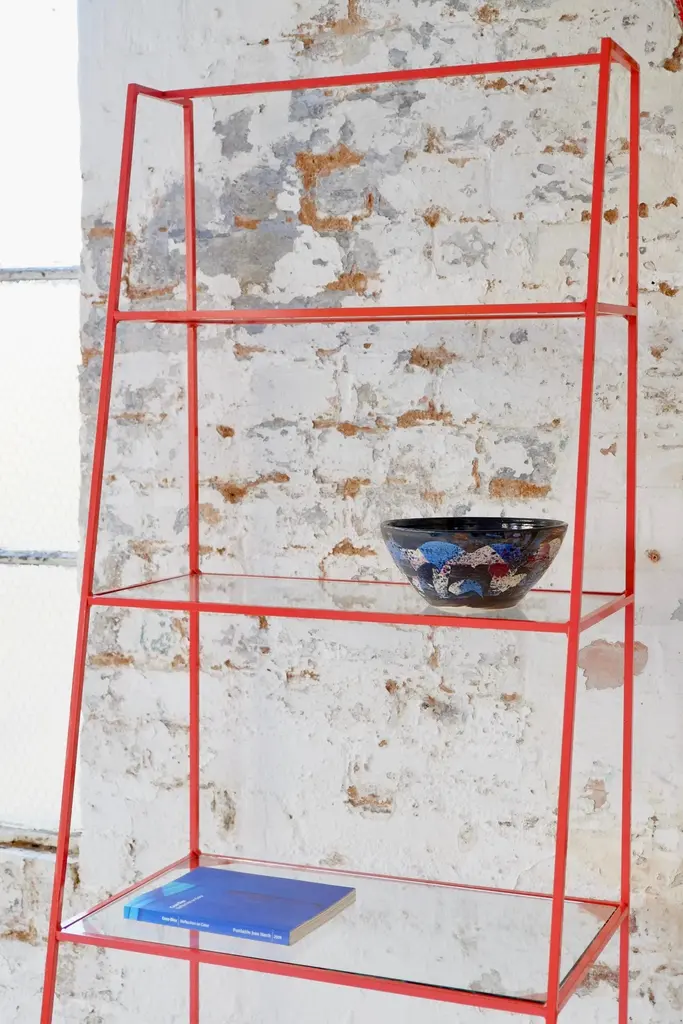 Modern freestanding shelf unit for books, objects, and plants. The shelves are designed to look delicate and airy but strong. The straight-back design sits neatly against a wall or can be free-standing to create a room division. The clean lines look great against period details as well as in modern spaces and the compact proportions compliment modern living. The shelves can stand together to create larger shelving or used individually. Made in solid steel, with a choice of glass or integrated steel shelves. Please contact us for choice. The shelves are available in fifteen powder-coated colors. Handmade in England.This listing is for the metal shelves Colour samples available to order from our storefront - LU2894331610202 Each unit measurements: 60cm wide, 50cm deep, 175cm tall. Available in any custom size. &New - Modern British Furniture.