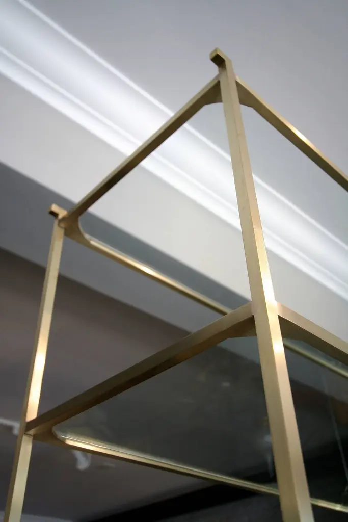 Tall custom brass etagere with seven glass shelves. Handmade in solid brass in Los Angeles by Adesso Imports. Can be made in custom size and finish. Priced individually, not as a pair.
