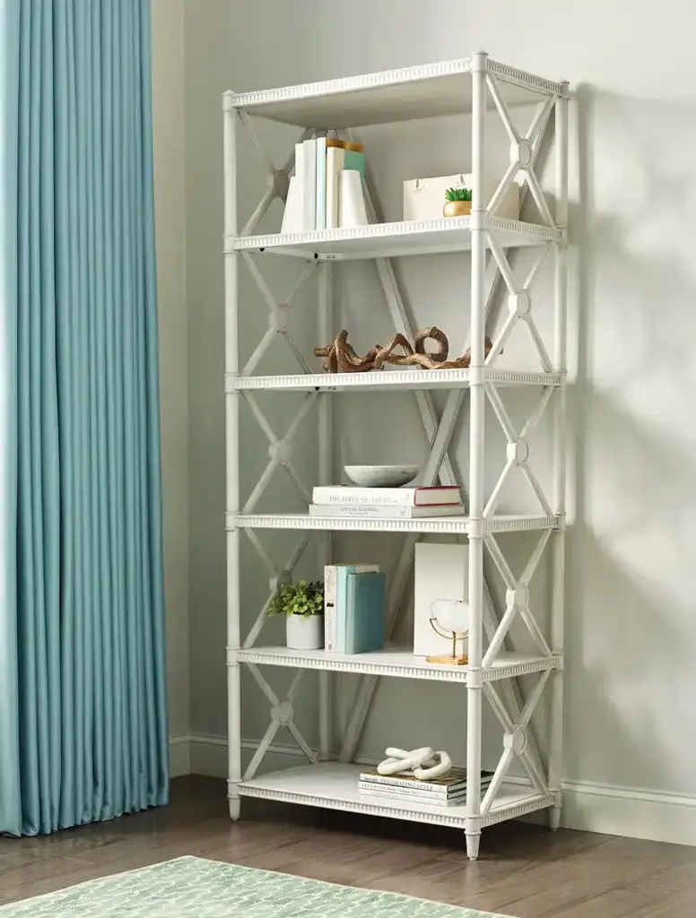 Introducing the Terrace Etagere, an exquisite blend of historical elegance and modern functionality. Inspired by the refined aesthetics of French and Swedish furniture from the Louis XVI era, this stunning piece features a lovely Meringue finish that adds a touch of sophistication to any room. With five spacious shelves, it provides ample space for displaying your favorite books, decorative items, or cherished collectibles. The Terrace Etagere's timeless design and graceful lines make it a perfect addition to any home, effortlessly enhancing your living space with a nod to classic European charm.