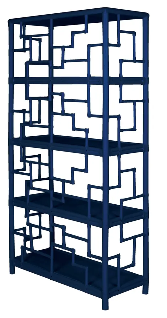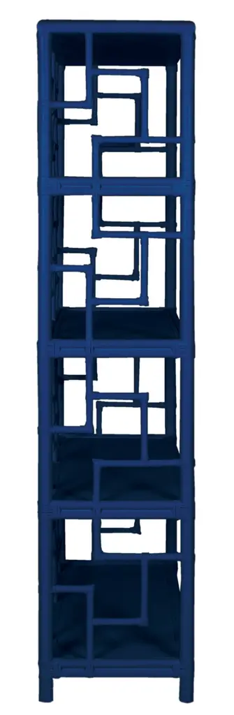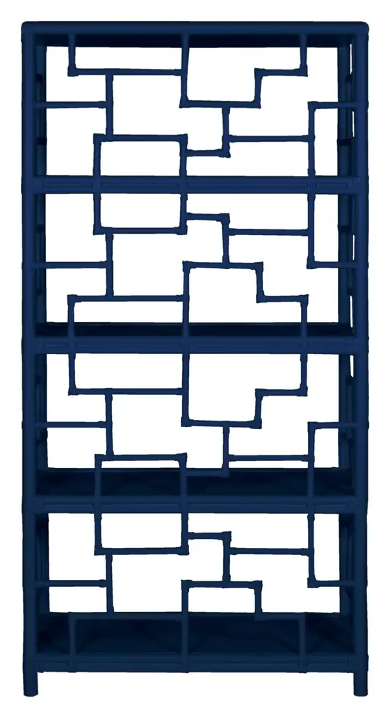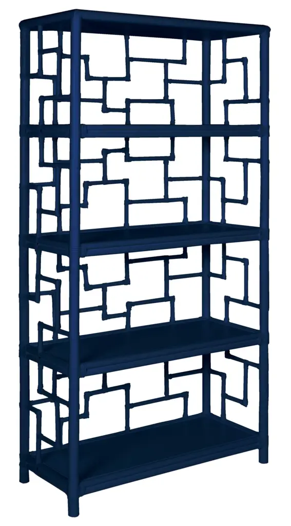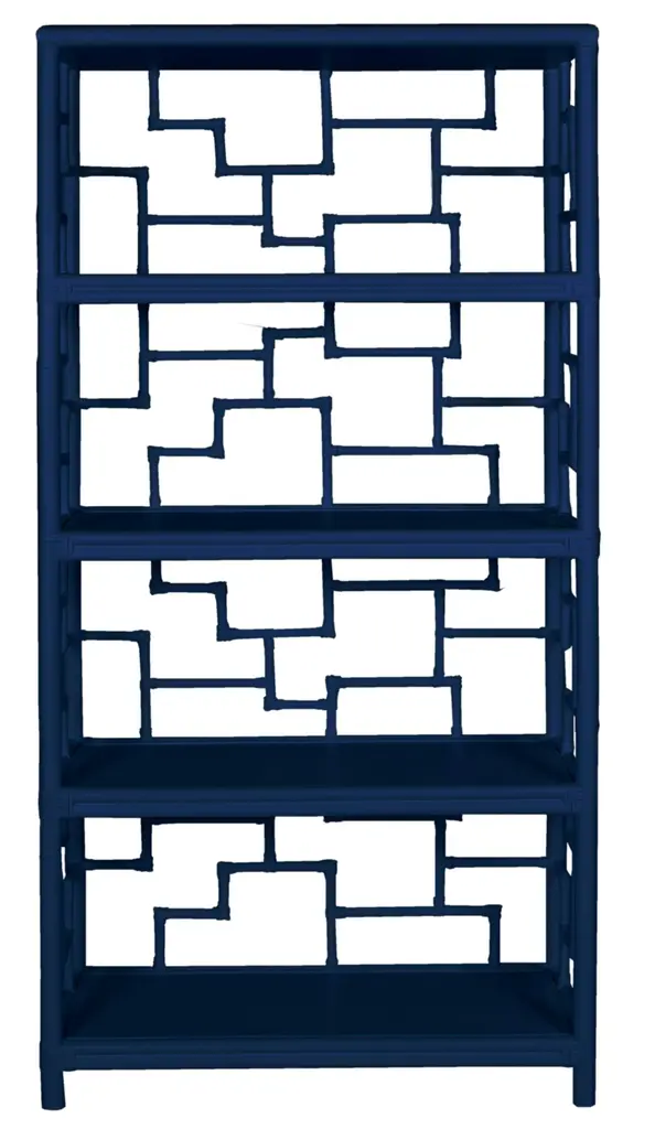 Elegantly designed, this étagère features a rattan frame, rawhide bindings and four wood shelves. The intricate rattan detail is applied and bound by hand. This etagere will instantly add character and charm to any space. This is a beautiful piece for a an office, living room, bedroom or entryway. Each David Francis etagere is hand-painted to order in the USA, please allow time for delivery.