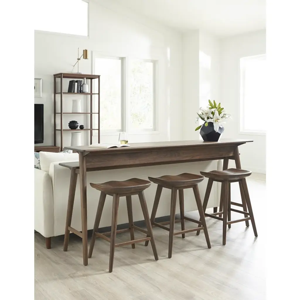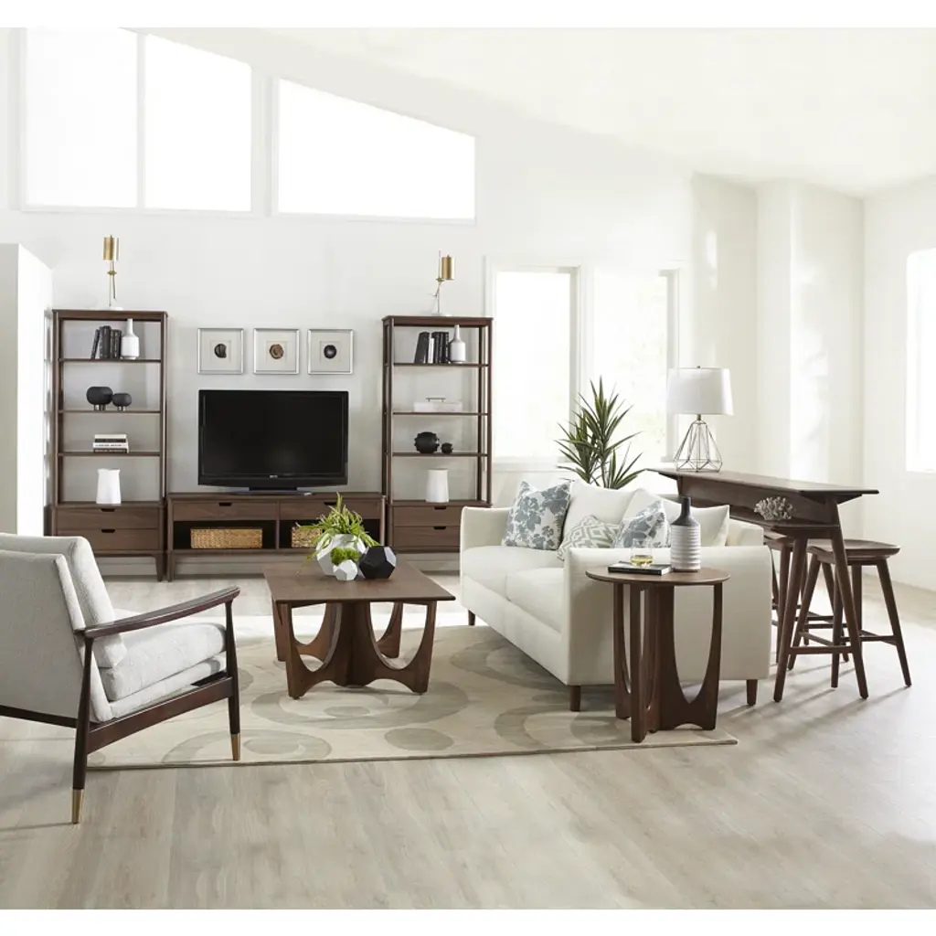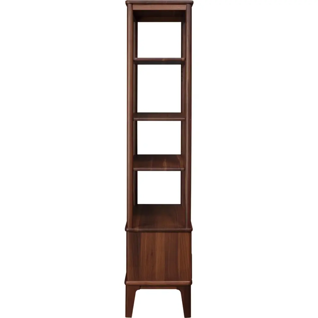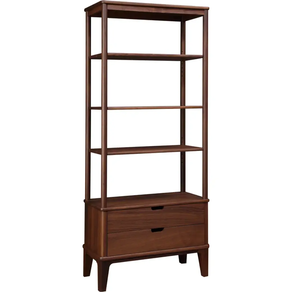 Beautifully rounded walnut supports hold three floating and one stationary shelf. In addition to more than ten feet of the display area, the Walnut Grove bookcase also offers two drawers for storage.