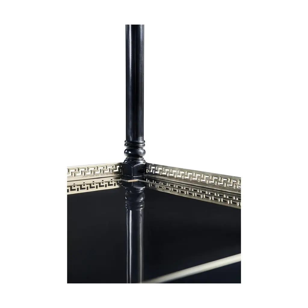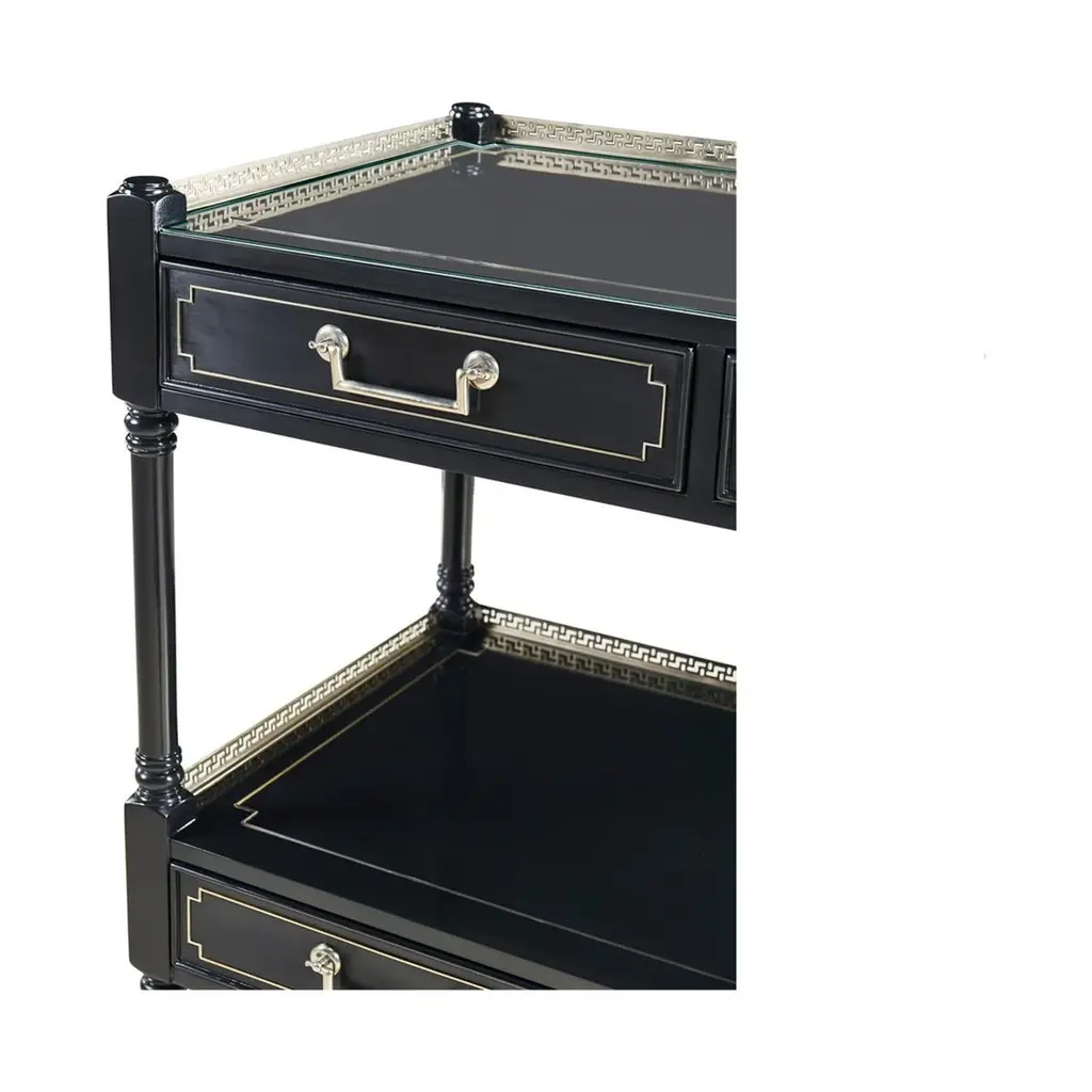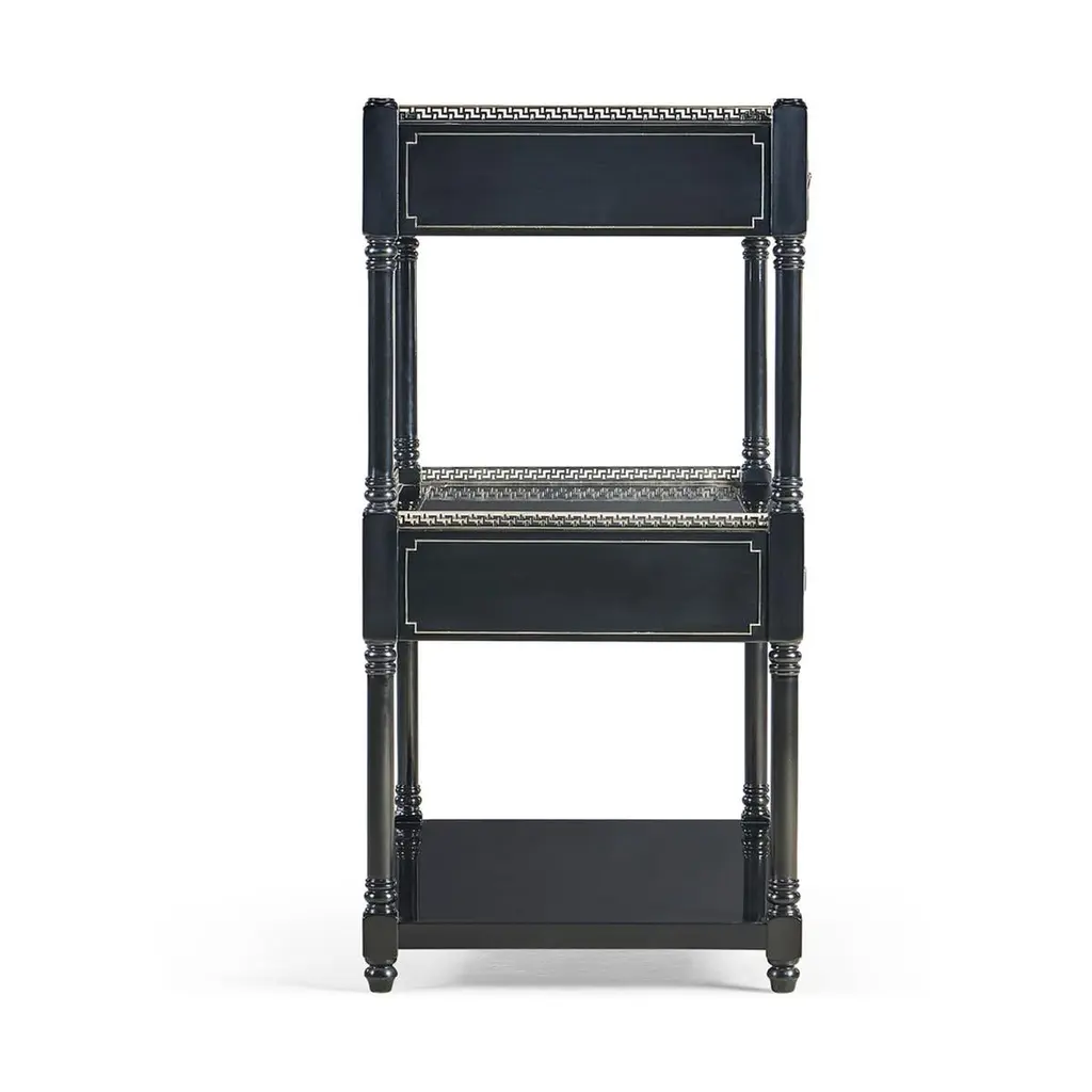 English Regency style three-tier wide painted etagere, capturing the essence of old-world drama and modern luxury. Black lacquered, the solid hardwood case features two double drawer shelves with white brass accents and gallery that beg to be laden with a decanter set and fine bottles of exquisite spirits. A floor shelf provides extra storage for oversized items.Dimensions: 33 1/8" W x 18 7/8" D x 38.5" H.