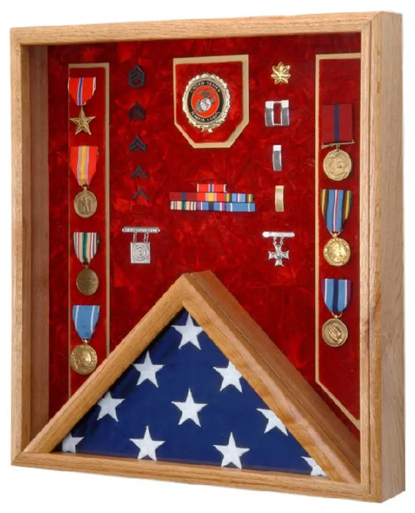 Combination Flag and Medal Shadow Box. Double Strength Glass Front. Solid Oak wood. Holds 3x5 ft. flag and up to 8 full size military medals on the 2 side raised mounting surfaces. Highest quality Red crushed velvet on a laminate backing with USMC Emblem. 100% made in the USA! *Flag and Medals not included.*