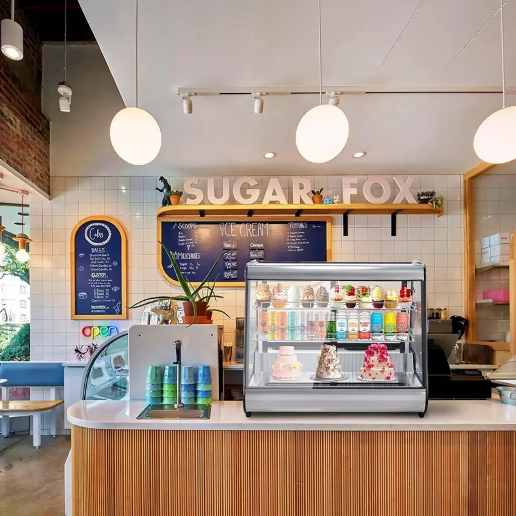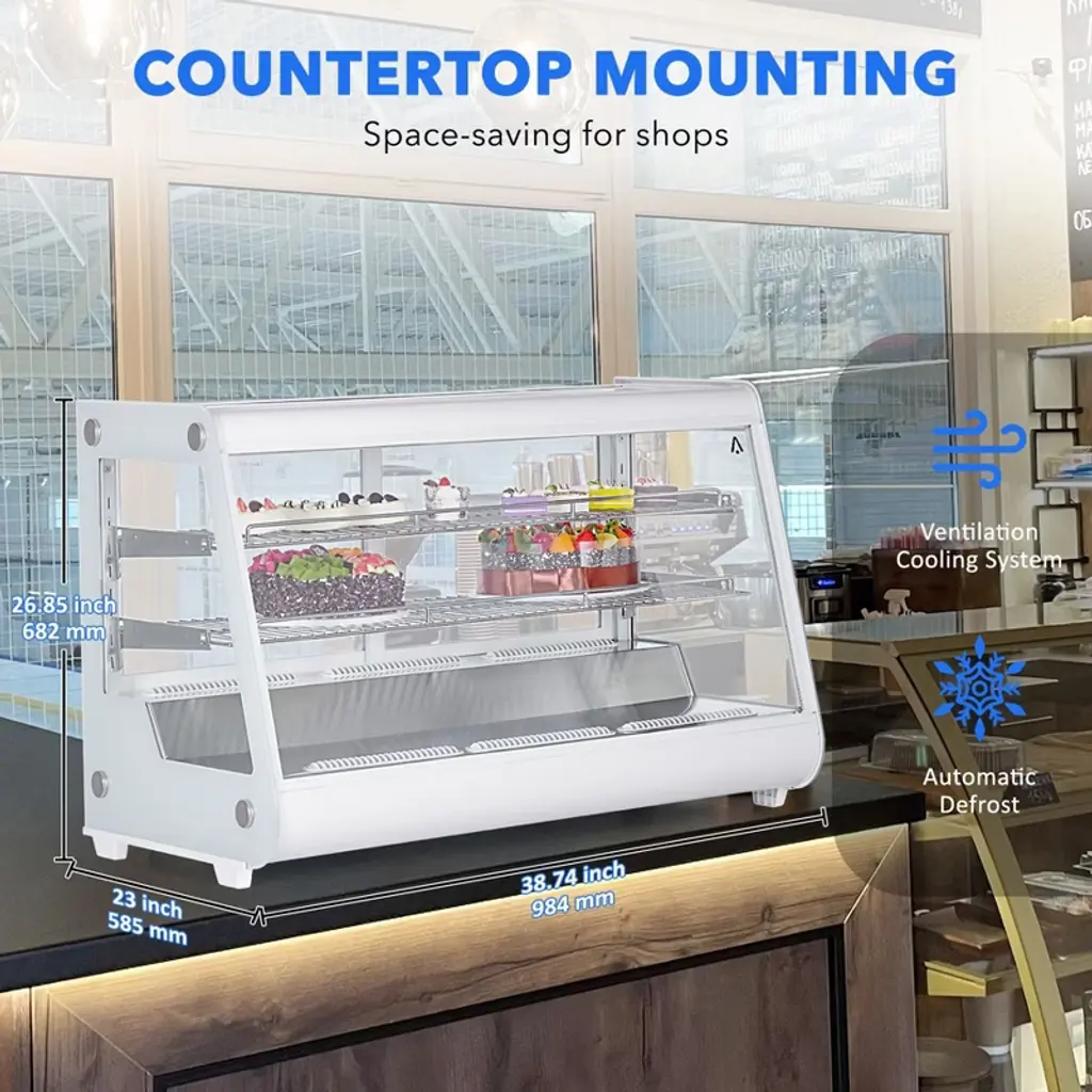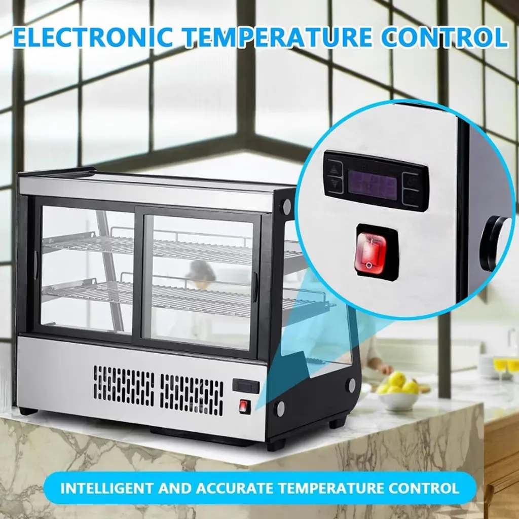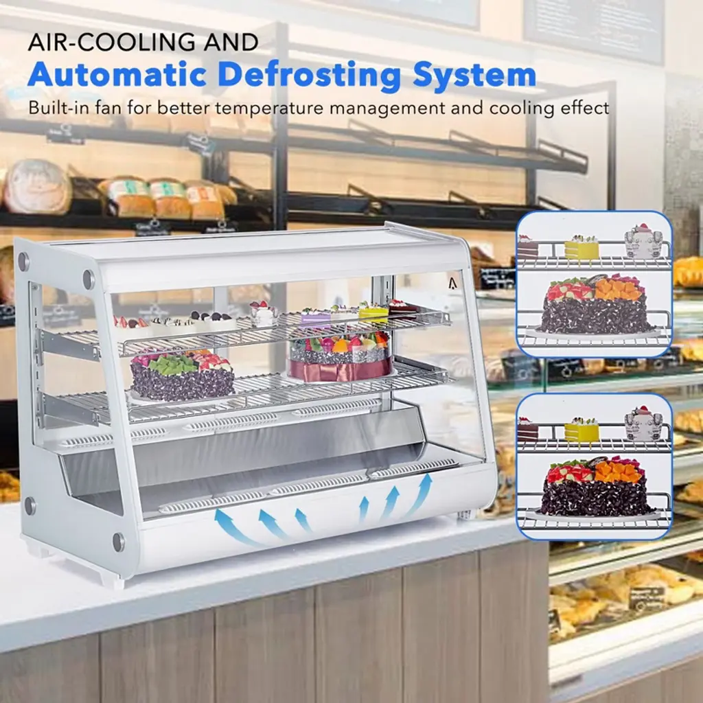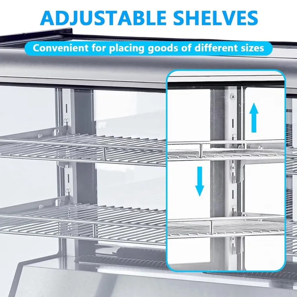 Maximize your space and highlight your display potential with our Commercial Display Refrigerator! Whether in a bakery, restaurant, supermarket, or snack bar, our merchandiser refrigerated display case is the premier choice for keeping everything from pastries to beverages perfectly chilled and irresistibly fresh. Rapid Cooling & Freshness Preservation - With a robust compressor, this bakery display case ensures swift cooling, energy efficiency, and minimal noise. The circulation of cold air maintains consistent cooling, keeping temperatures between 35.6-53.6°F, and prolonging the freshness of food items. Vibrant Illumination & Anti-fogging - Featuring LED lighting on all four sides and the top, the display refrigerator's interior provides clear and bright illumination for showcased items. Dual-sided ventilation holes effectively prevent condensation on the glass, ensuring optimal visibility. Precise Control Panel - With a thermostatic temperature of 35.6-53.6 ℉ and an easy-to-read LED display, you can select and monitor the most suitable temperature for the different foods you want to display. Easily control temperature and LED lighting with electronic buttons for seamless operation. High-Quality Construction - Boasting four-sided double-layer tempered glass, this refrigerator offers superior heat insulation and visibility. The corrosion-resistant and durable ABS plastic frame, along with adjustable shelves, provides ample space for displaying a variety of foods. Wide-Ranging Use - The display refrigerator cabinet, equipped with rear sliding doors, is ideal for cafes, bakeries, markets, convenience stores, and various commercial settings. Showcase an array of desserts, pastries, beverages, yogurts, fruits, and more, enhancing the appeal of your storefront.