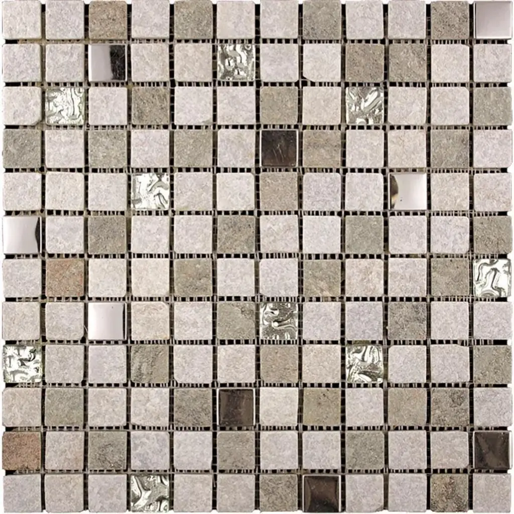 Elevate your design into a sublime level of luxe with this unique glass, resin and stone mix mosaic tile. High gloss glass and resin tiles paired with the authentic stone tiles in a striking interlocking pattern that is laid in a mesh sheet for fast and easy installation. This unique mosaic tile radiates with a soft reflection to give your space the extra shine it needs with a truly modern appeal. Wrapped around a shower, kitchen or bathroom, this decorative mosaic tile takes your walls and floors to a whole new level. Great for adding subtle shimmer detail to a neutral room, this patterned mosaic tile makes a bold pattern statement in any living room, entryway or commercial design. Set the mood for entertaining using it as a striking bar backsplash or use it as your kitchen backsplash to elevate your cooking space with pattern and charm.