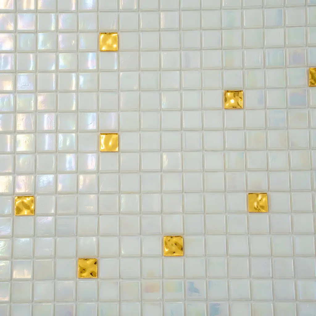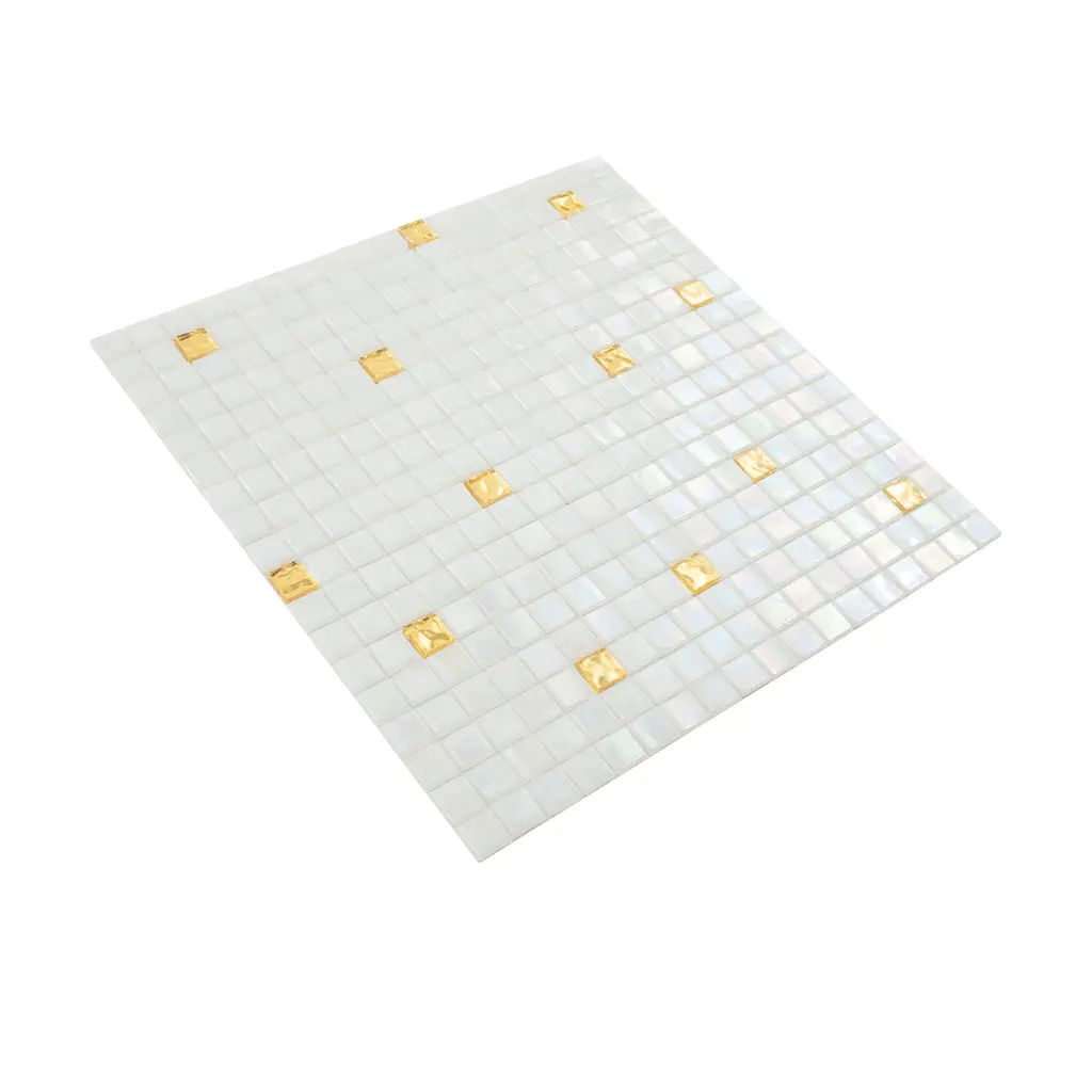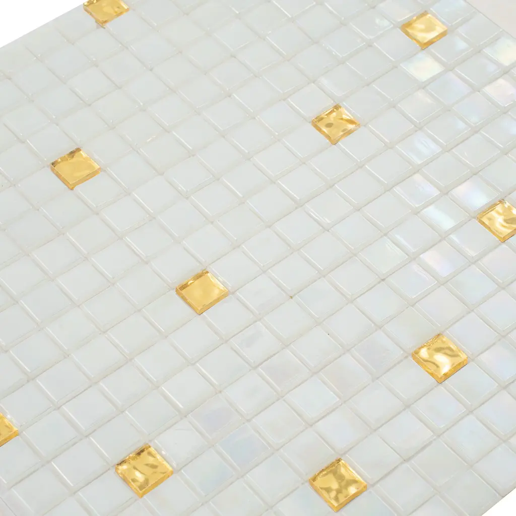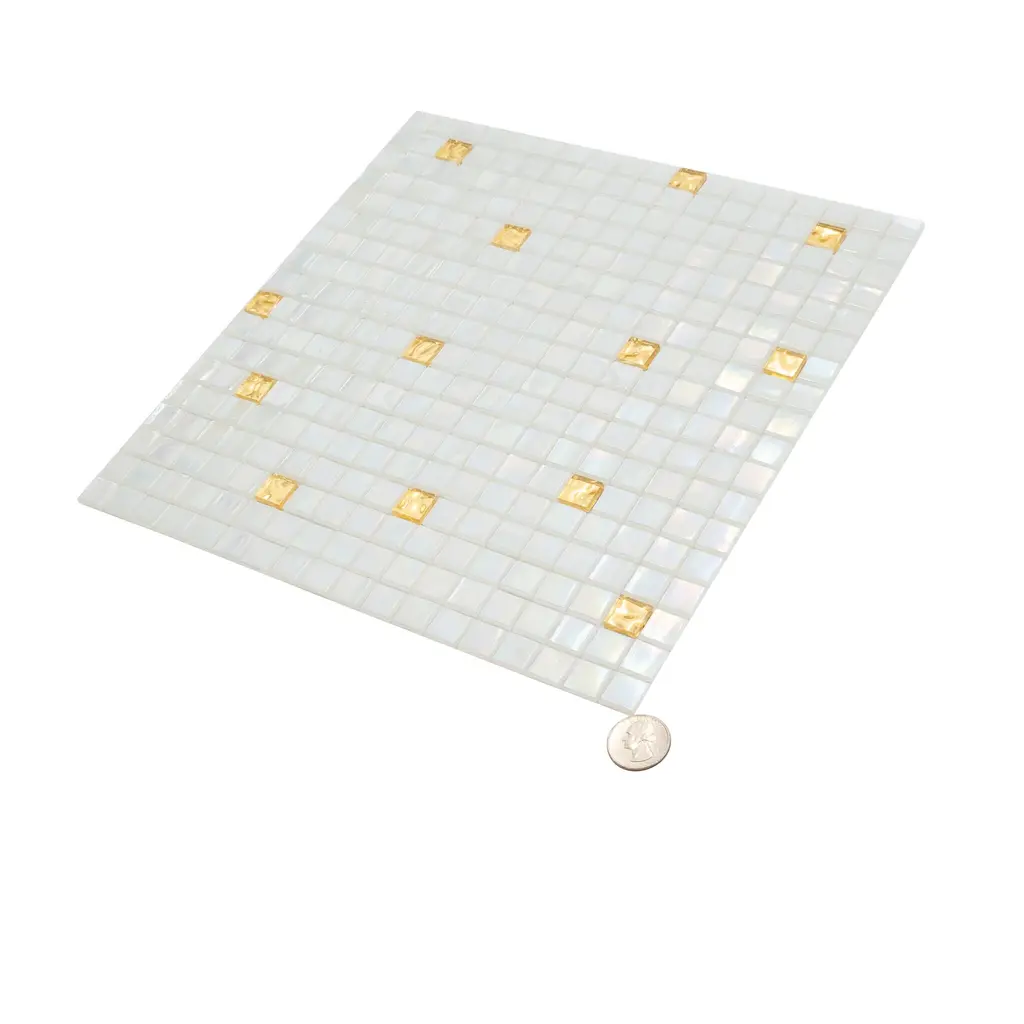 Neutral decor is elegant, lavish, and totally modern with this white glass mosaic tile with gold accents. Use this polished tile to make a modern trendy statement on the walls of your interior design or exterior settings. Perfect to add a gentle sheen to a modern kitchen backsplash, minimalist bath or contemporary living room, this white mosaic can be your next wall or low-traffic floor tile. Are you ready to give your space a clean and modern upgrade? This classic square mosaic tile is simple with its color palette, yet creates a soft glow thanks to its reflective accents found in its layout. This helps you give movement even to the plainest rooms while keeping your scheme bright and airy. The neutral shades of this white glass tile is versatile, timeless and stylish - perfect for a harmonious background that can easily fit your current scheme. Disclaimers & Disclosures: Please be aware that if you order more than 151 pounds of tile or flooring, the order may need to be shipped by a freight carrier. If so, our Oversized Item Delivery and Return policy will apply.