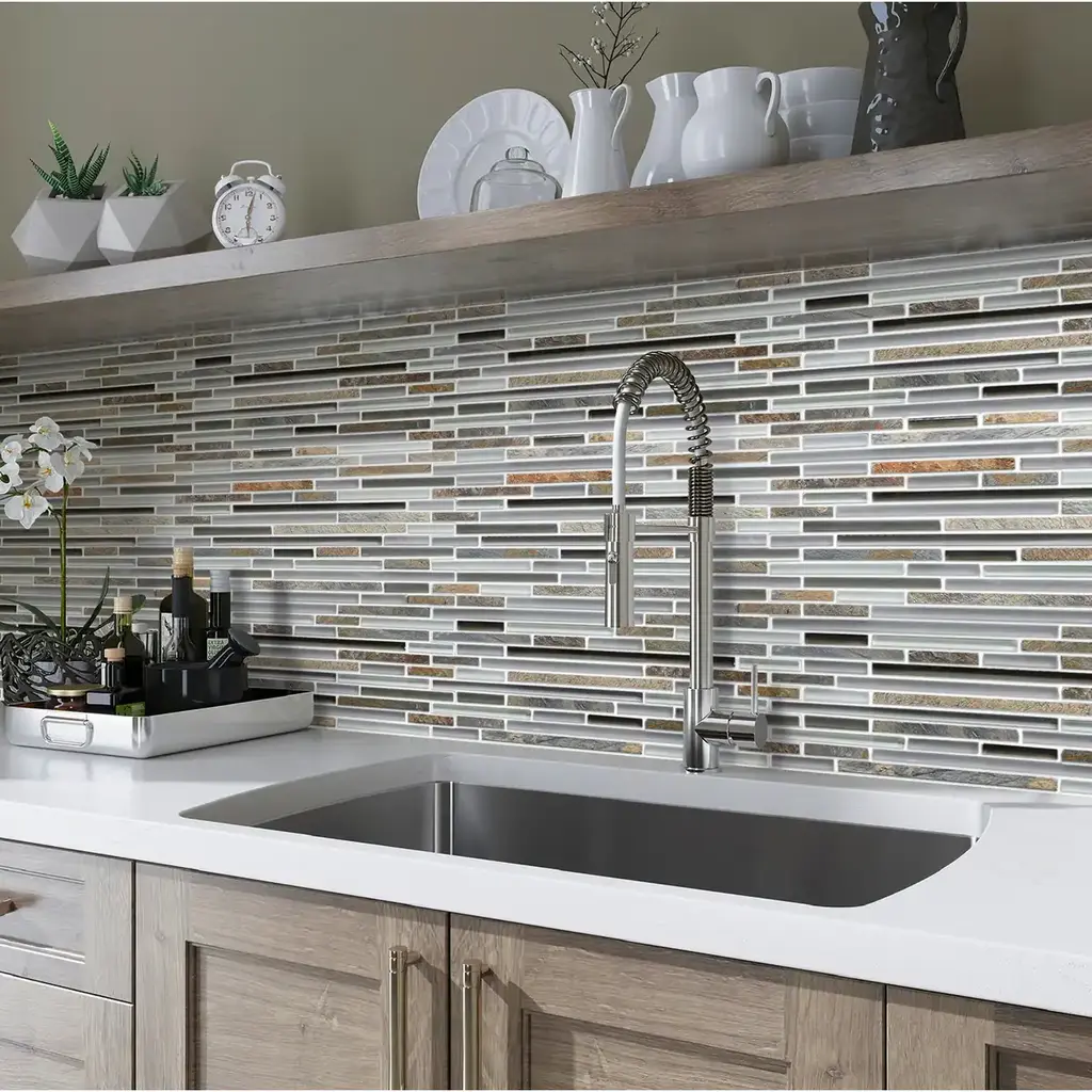 There's a reason why this mosaic tile is one of the favorites in neutral design. Its delightfully neutral palette layers varying shades of neutral tones in a set of tiny tile strips creates a unique look. This mosaic tile is visually calm yet charming, with a sleek linear pattern made of glass and stone that strikes the perfect balance between classic and modern. Laid on a mesh sheet, this mosaic tile can easily be cut into pieces and used as a decorative accent for a backsplash, shower or flooring design. The range of contrasting neutral tones in varying materials makes this mosaic tile a gorgeous choice for a variety of design projects. From adding a unique detail to a shower to creating accent walls with a waterfall effect, this glass and marble tile is a charming option as a vanity or tub surround as well as flooring designs mixed with other glass or stone tiles.