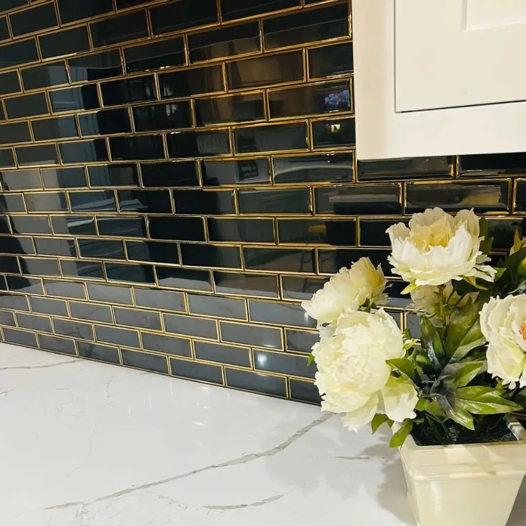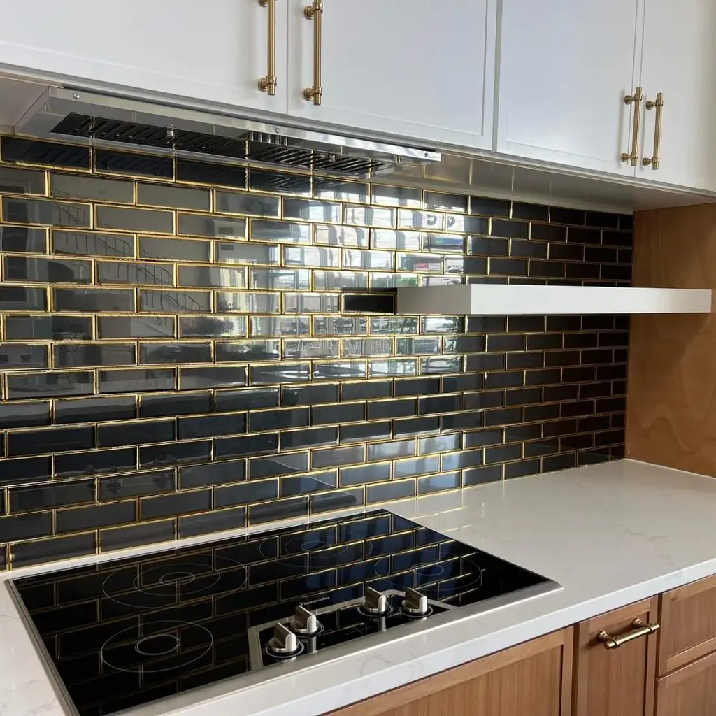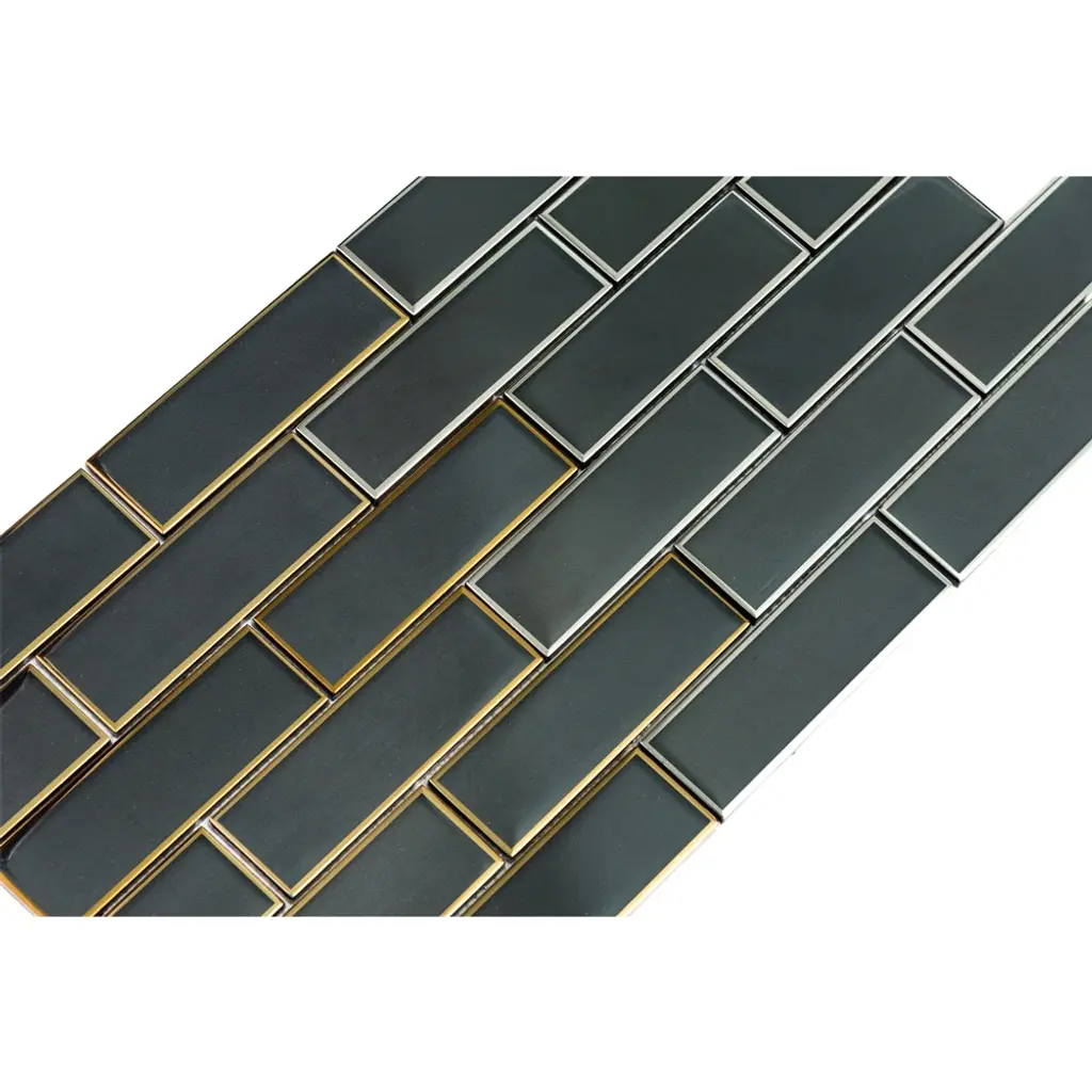 Not for the faint of heart, The Tile Life's Athena collection makes a bold statement with its metallic trim and sleek modern colors. This 2 inches x 6 inches glass mosaic tile will be a seamless backsplash for contemporary kitchens and bathroom walls. The Tile Life Athena Glass Wall Tile is perfect for backsplashes, bathrooms, showers, kitchens, and accent walls. Approved for residential and commercial indoor wall installations, Athena 2 inches x 6 inches Brick Glass Mosaic Backsplash Wall Tile is available in two striking color options: Black/Gold and Black/Silver. FEATURES: DIMENSIONS: