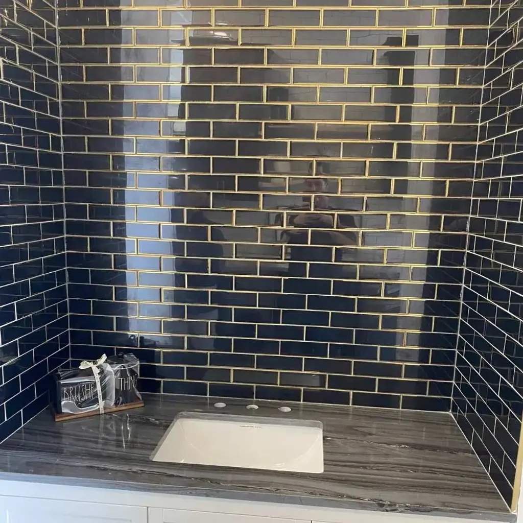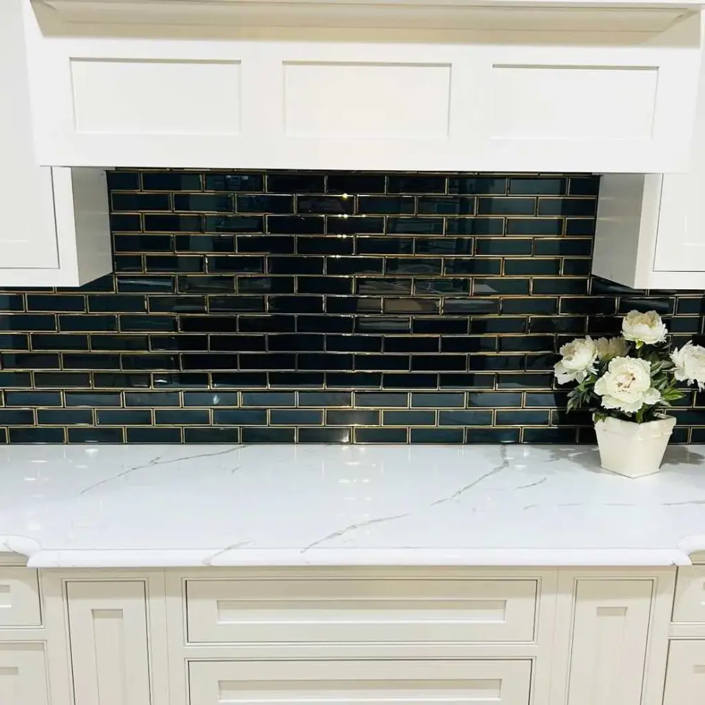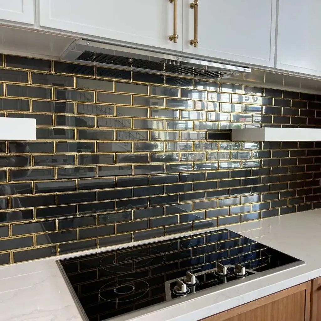 Not for the faint of heart, The Tile Life's Athena collection makes a bold statement with its metallic trim and sleek modern colors. This 2 inches x 6 inches glass mosaic tile will be a seamless backsplash for contemporary kitchens and bathroom walls. The Tile Life Athena Glass Wall Tile is perfect for backsplashes, bathrooms, showers, kitchens, and accent walls. Approved for residential and commercial indoor wall installations, Athena 2 inches x 6 inches Brick Glass Mosaic Backsplash Wall Tile is available in two striking color options: Black/Gold and Black/Silver. FEATURES: DIMENSIONS: