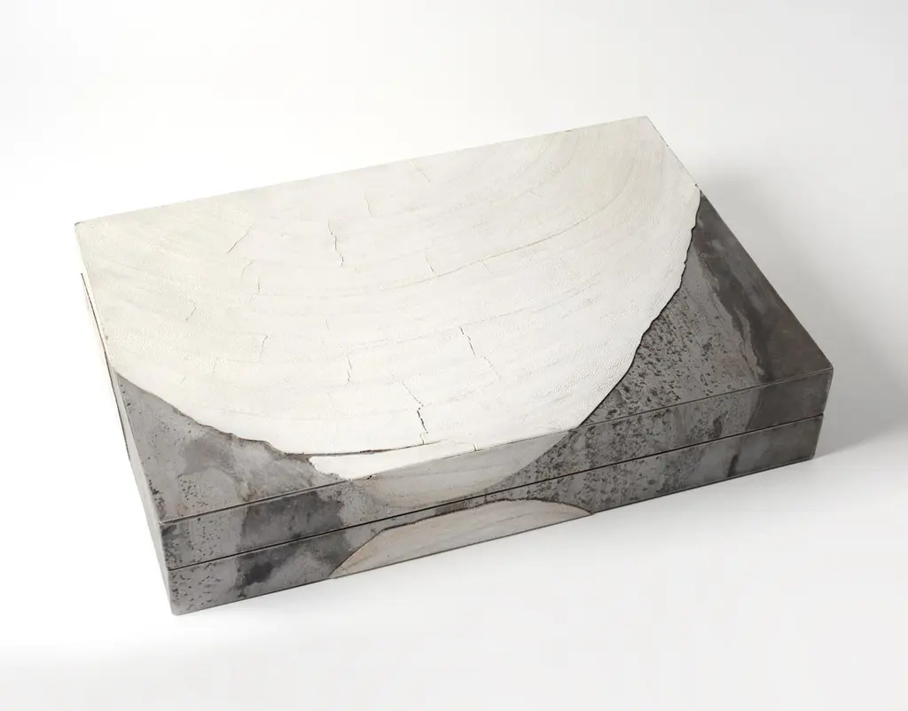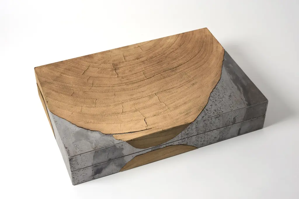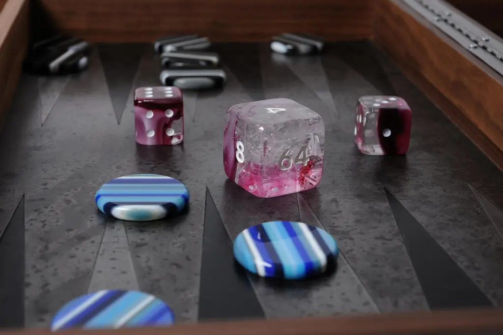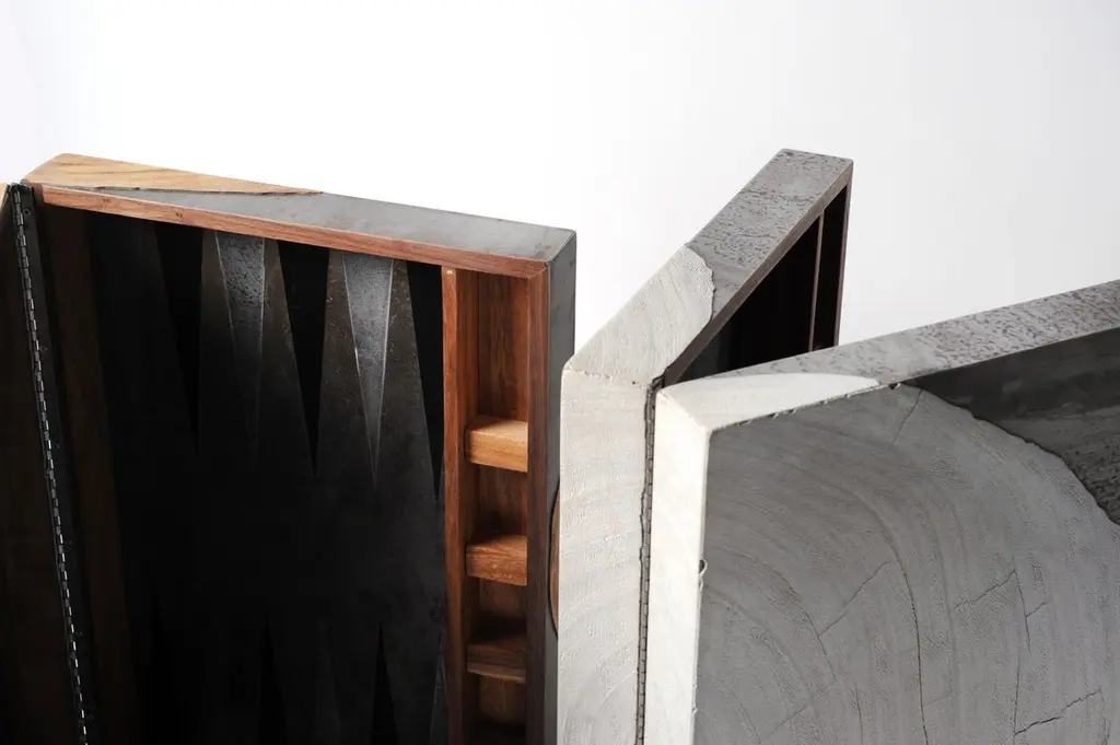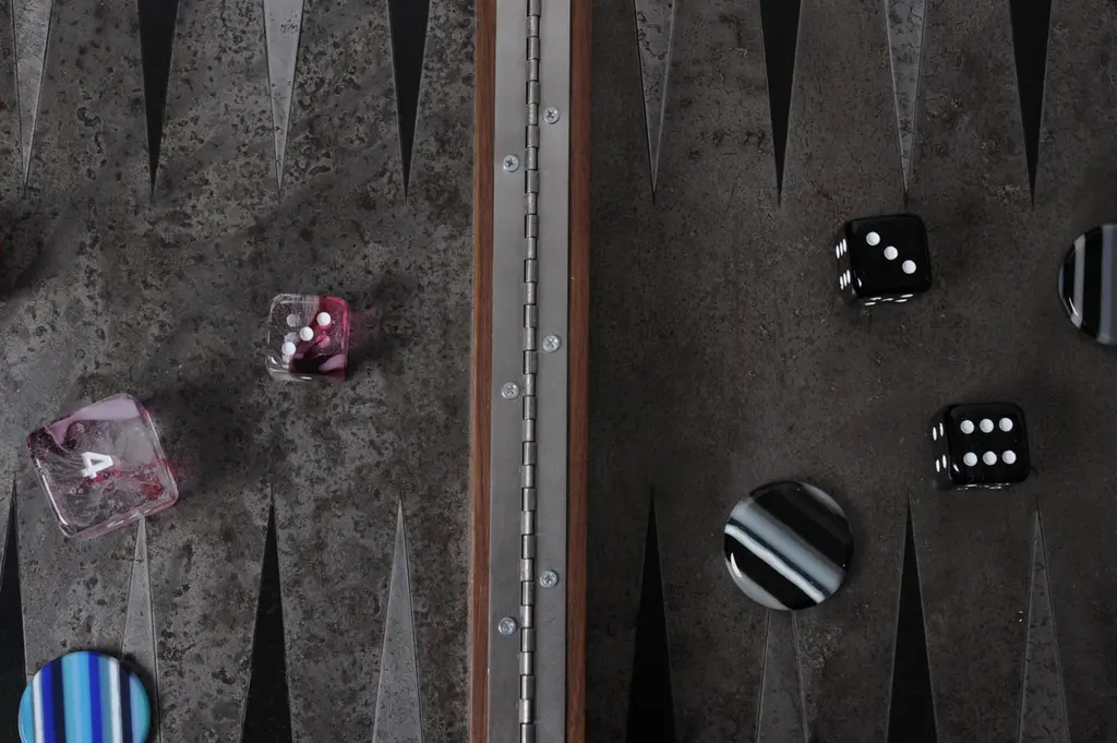 Backgammon is a very old strategic board game, from which its origin is still undefined. A true Classic game about tactics and luck played around the globe.Taking this Classic as inspiration, Orfeo collaboration joined skills to create a board game with stimulating materials and astounding chips.Shined a spotlight on to the raw materials used to create it. The exterior of the board is composed of two elements, a metalic box and a thinly sliced oyster cut veneer of parota wood. The oysters are sourced from reclaimed branches of these gigantic trees; a material that is commonly discarded as fire wood given the difficulties of processing it. Underneath the wood they have used a single sheet of meticulously oxidized metal that is laser cut to size, then assembled into a box by one of their master craftsmen. Opening the chest you’ll find a treasure of glass checkers and dice handmade by Orfeo Quagliata’s artisans.Orfeo takes his most interesting glass techniques to apply them to all the chips in the game. The checkers are manufactured in two different processes. The "Barcodes" technique is a fine linear design with schemes of different colors that contrast between one competitor and another.Thin strips of different colored glass are placed next to each other and then fused into a single piece, from which circular pieces are drilled, ground and hand polished to form the chip.The more sober and bitone "Roarshax" technique presents an electrifying texture on the top of a transparent body.Meanwhile the dice are solid glass cubes manufactured under the layered or boiled technique, which recreates an effect of colored ink in water captured inside the piece or elegant layers of color. This dance of color and transparencies adds a unique visual value to the Backgammon, not only a simple board, but a fully functional artistic piece rich in materials and textures.The beauty of this collaboration is the duality of a closed box as an objet d’art in and of itself, upon its opening you discover the exquisite detail of the metallic shimmer with the glowing dice and precious checkers that makes this backgammon a double down winner.