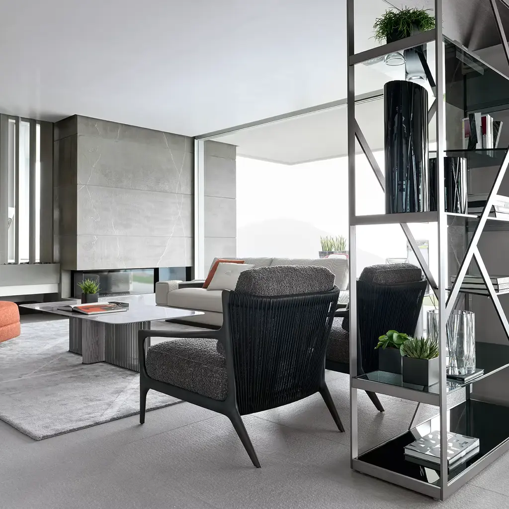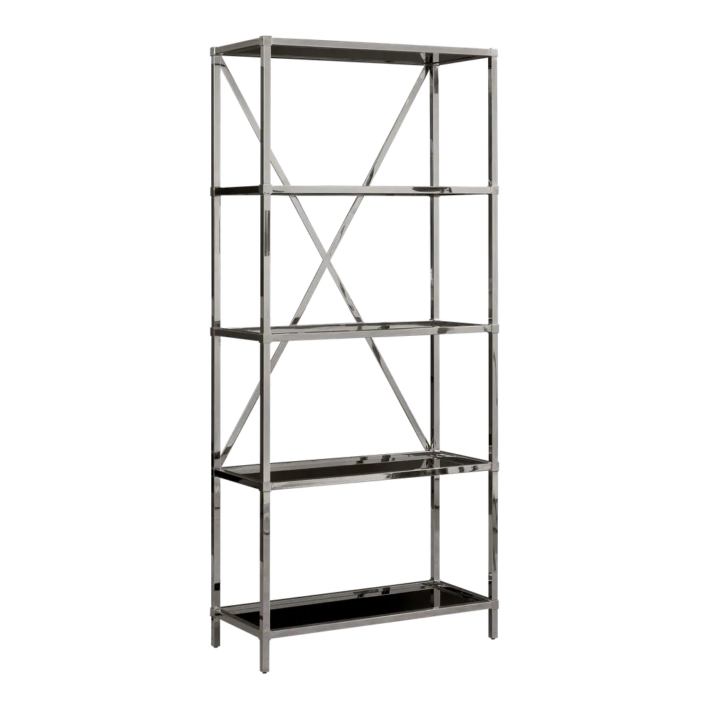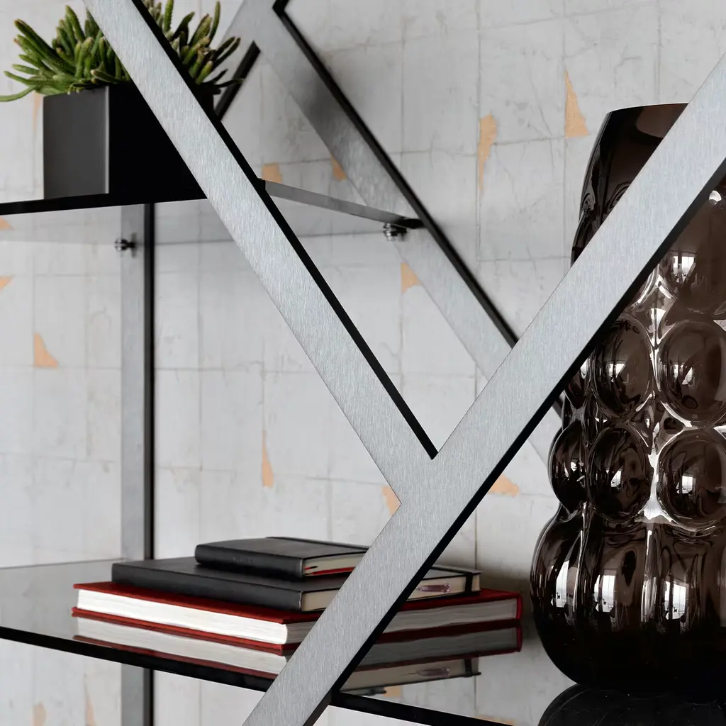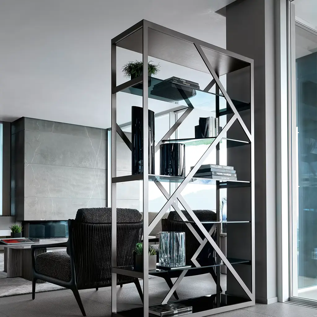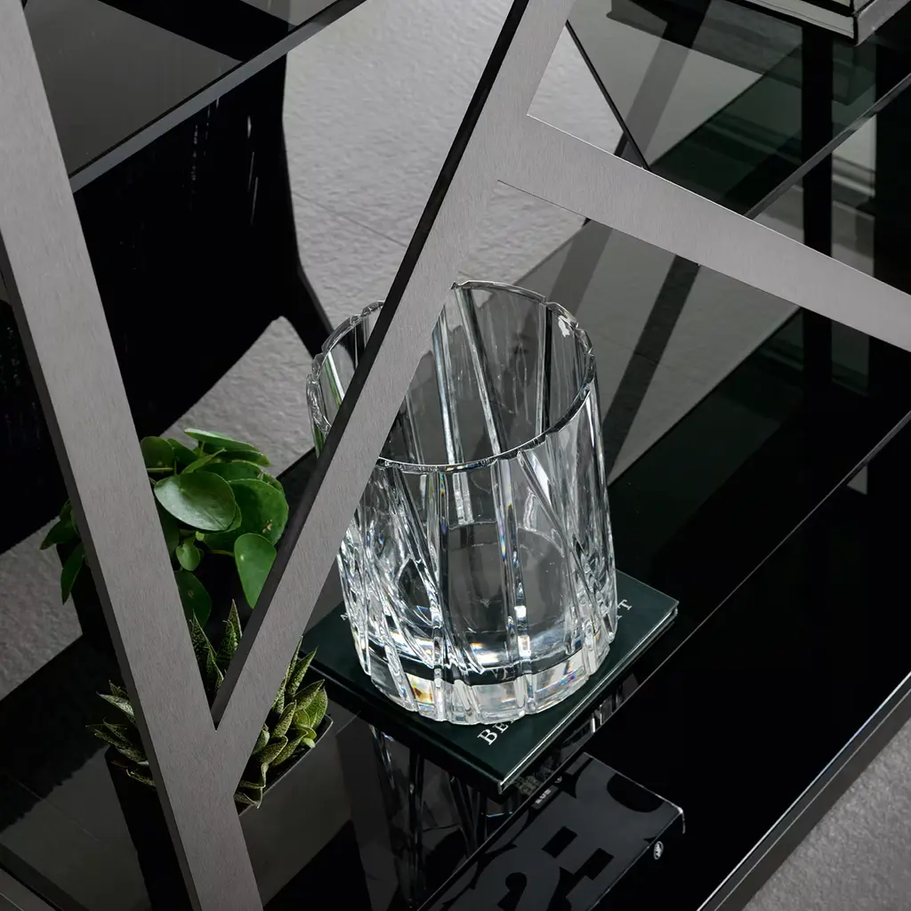 Discover this bifacial showcase in satin grey nickel stainless steel. Composed of 5 tempered fixed smoked glass shelves. Please, ask the Concierge service for further information.