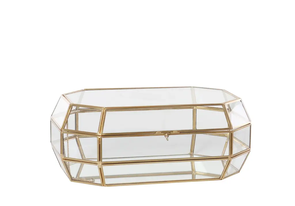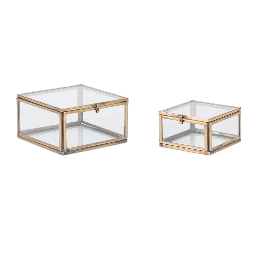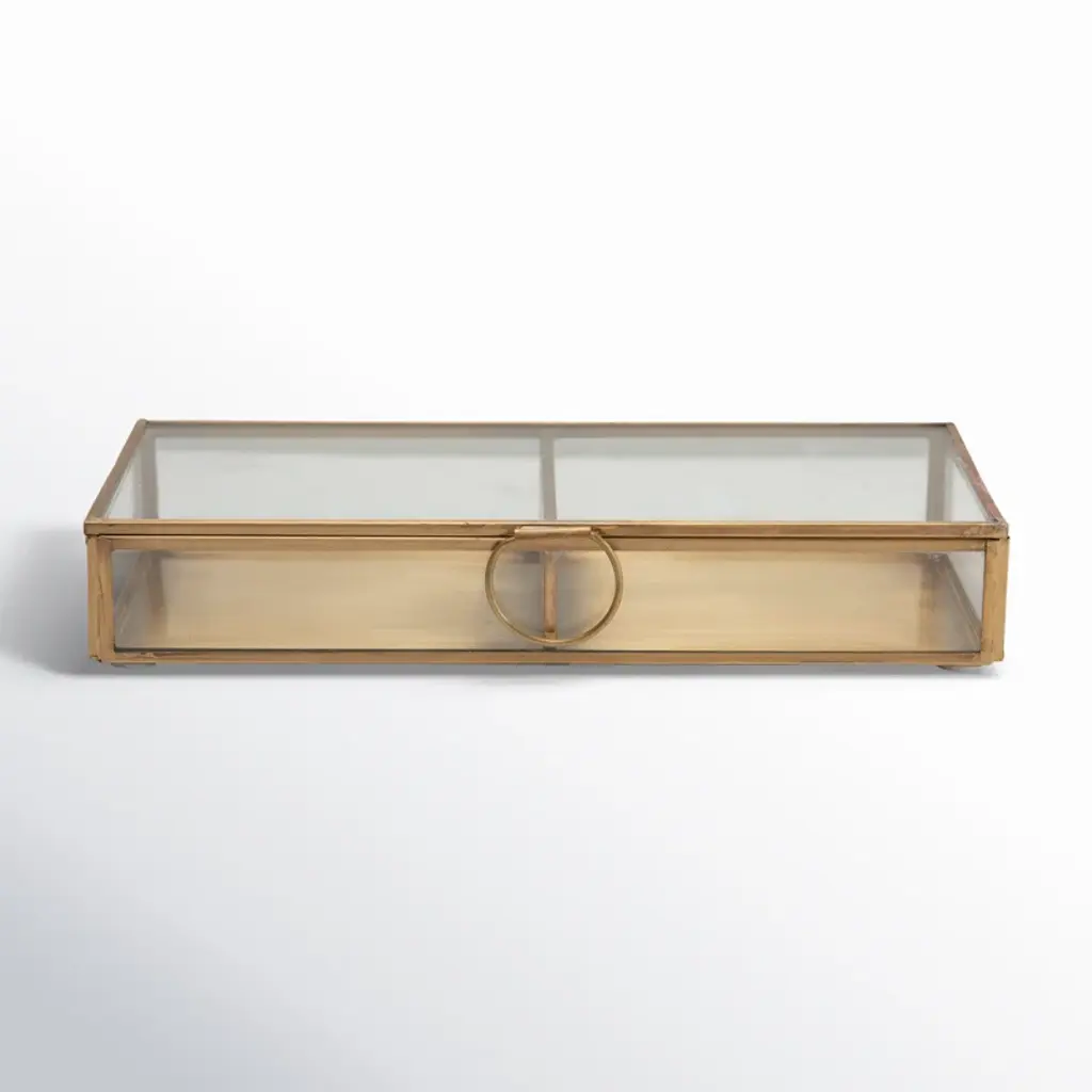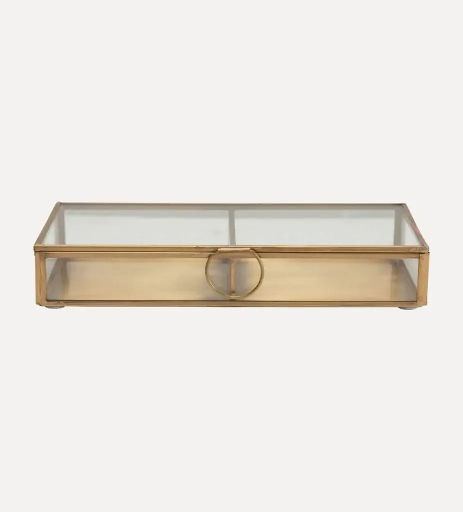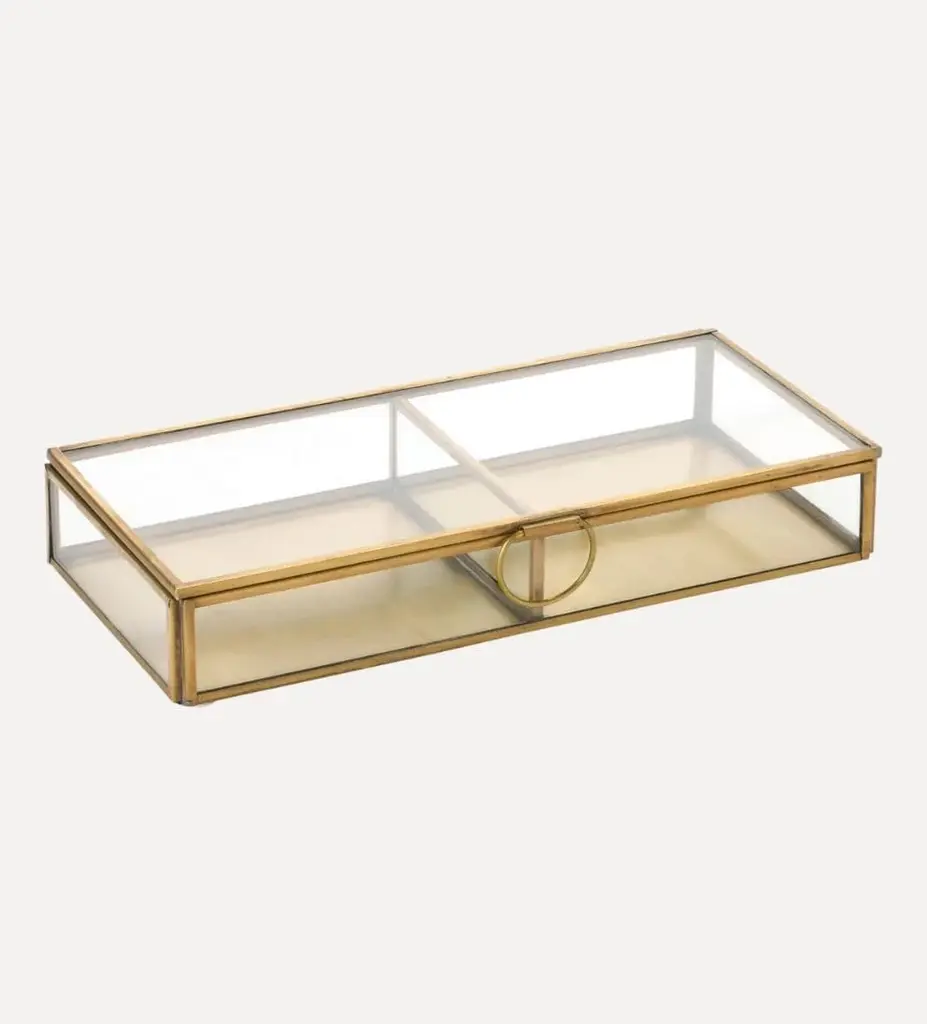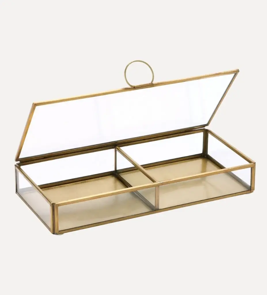 Show off your treasures in style with our Brass and Glass Display Box! This sleek box features two compartments, perfect for organizing and displaying your favorite items. Add a touch of elegance to your decor with this unique display box. Dimensions: 9"L x 4-1/4"W x 1-1/2"H