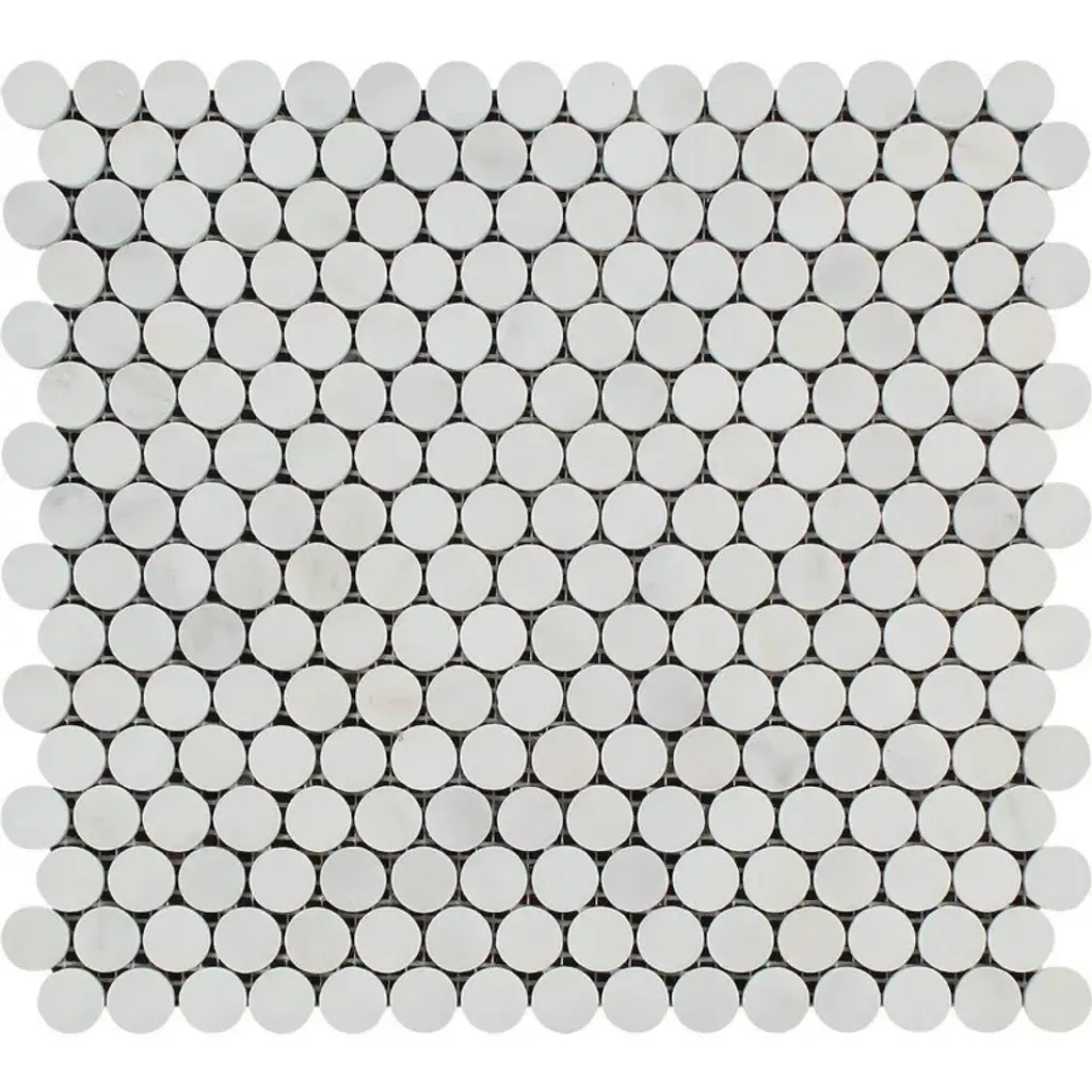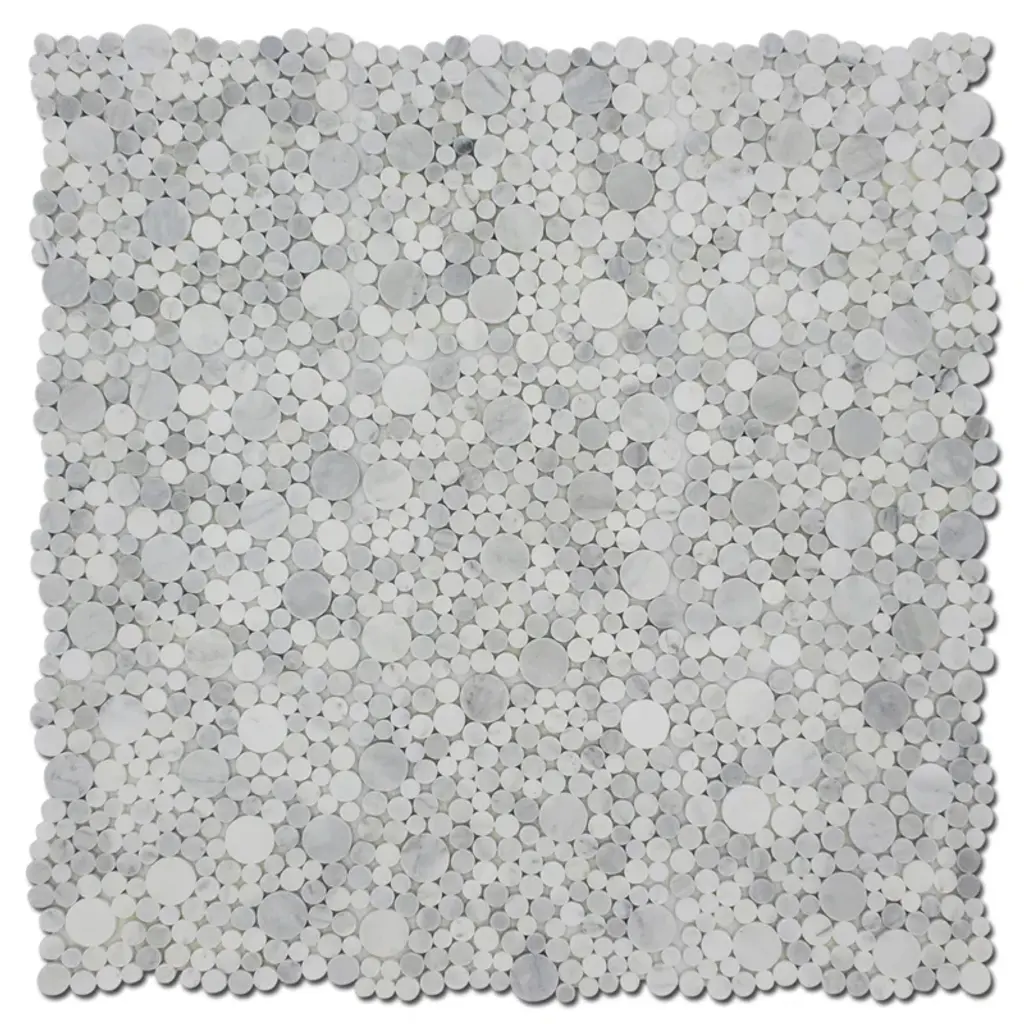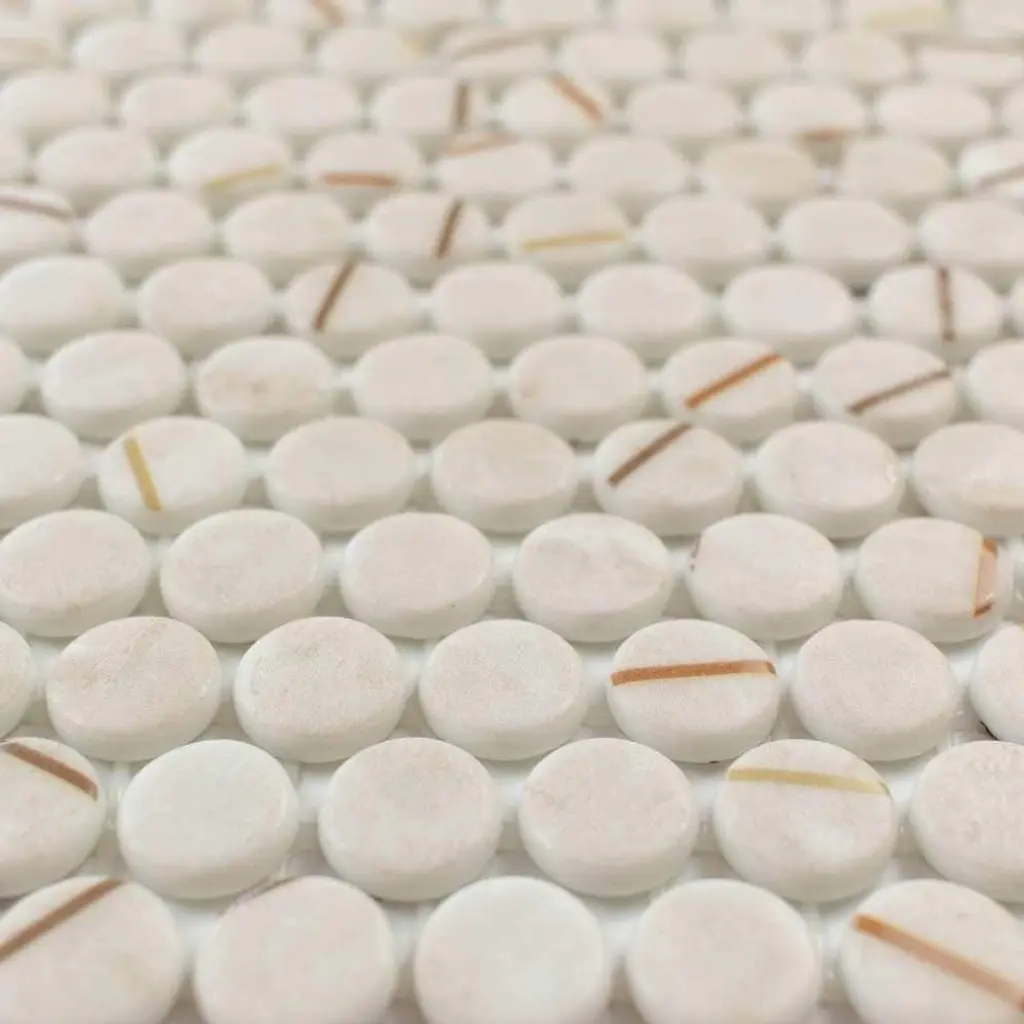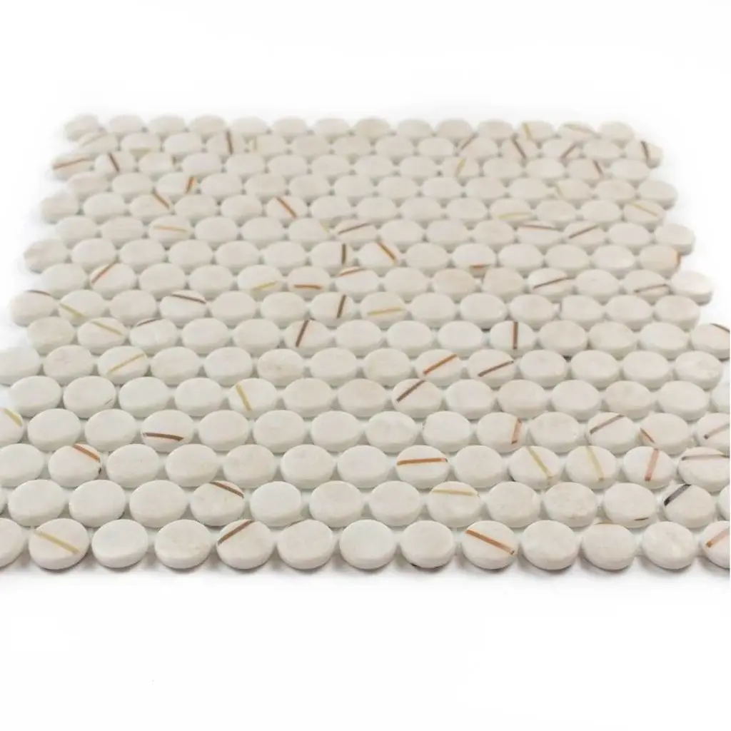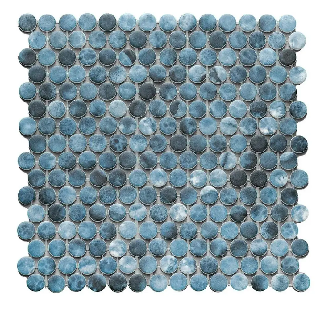 Carefully designed combinations of a timeless penny in neutral tones and subtle details designed to enhance any residential project while maintaining its originality. Our Eterna Penny Mosaic is produced from the highest quality recycled glass to create a high-end look. Made and designed in Spain, this 98% recycled sustainable mosaic is meant for both floor/ wall applications and is suitable for dry/pool/wet areas. These easy-to-install 12" x 12" decorative penny round glass mosaic tiles are perfect for a wide range of applications, they're ideal for backsplashes, bathrooms, showers, kitchens, pools, fireplace surrounds, countertops, floors, and walls—both indoors and out. Designed for use in dry or wet areas, these versatile glass mosaics are approved for residential and commercial installations, offering a stylish and durable solution for nearly any surface. FEATURES:DIMENSIONS: