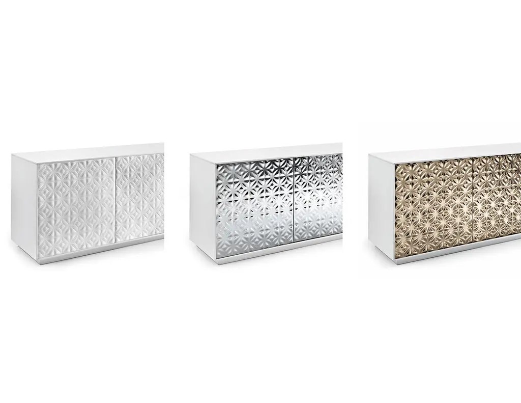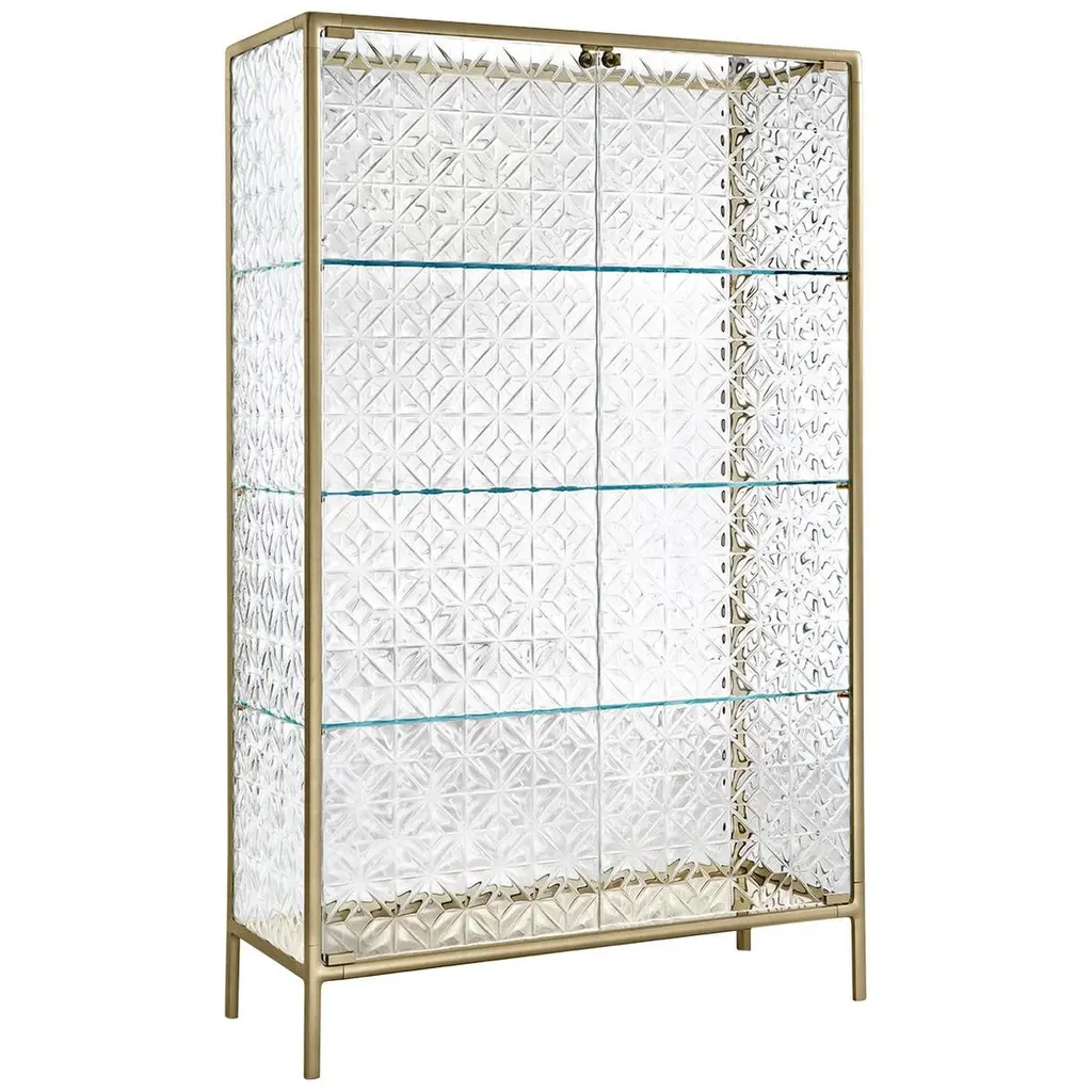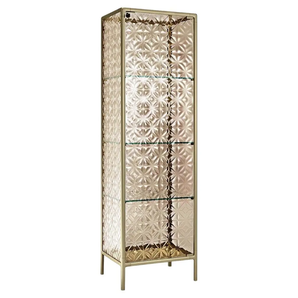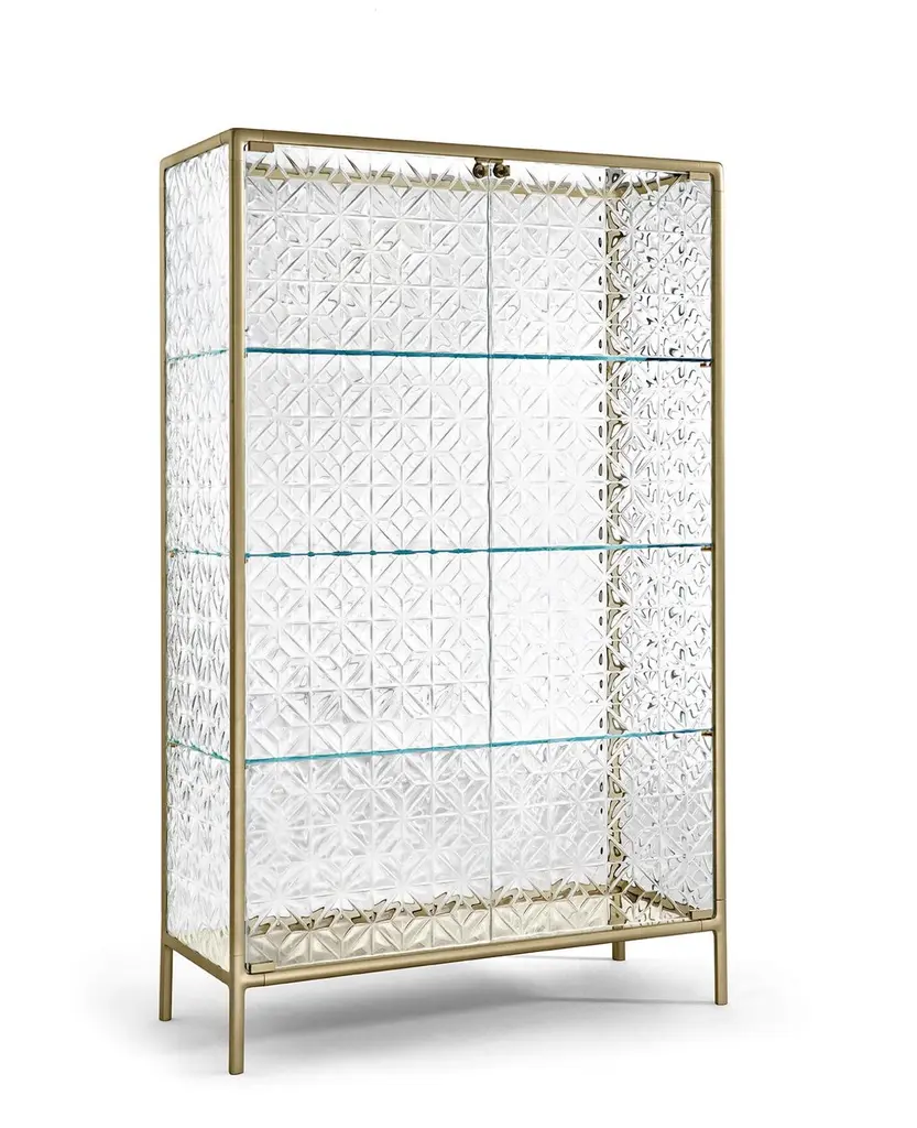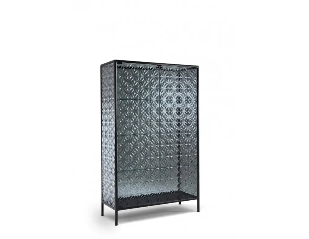 Showcase with varnished aluminum profiles, available in metalized champagne or Vulcan grey finishes. Base in 6 mm thick tempered and back lacquered extra light glass of the same profiles color; relevant glass structure and doors in 6 mm thick extra light, smoke or bronze tempered and fused glass; inner shelves in 8 mm thick extra light tempered glass. The showcase is also available in float (non fused) glass and in semi-reflecting glass. LED lighting system integrated in the structure frontal pillars (optional).load capacity on each shelf: 20 kg load capacity on the top: 30 kg.