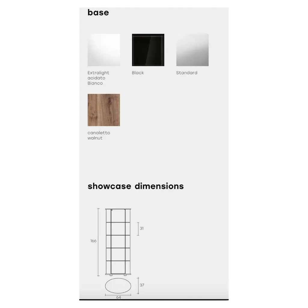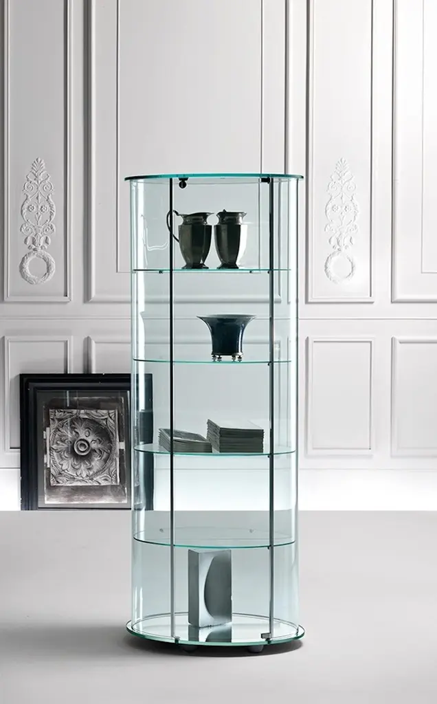 Wired showcase in 6 mm-thick curved glass, with four 6 mm-thick glass shelves (L 58 cm, W 31 cm), 12 mm thick glass top, door with lock. Profiles in brushed aluminium glossy finish. The optional lights can also be placed under the top.