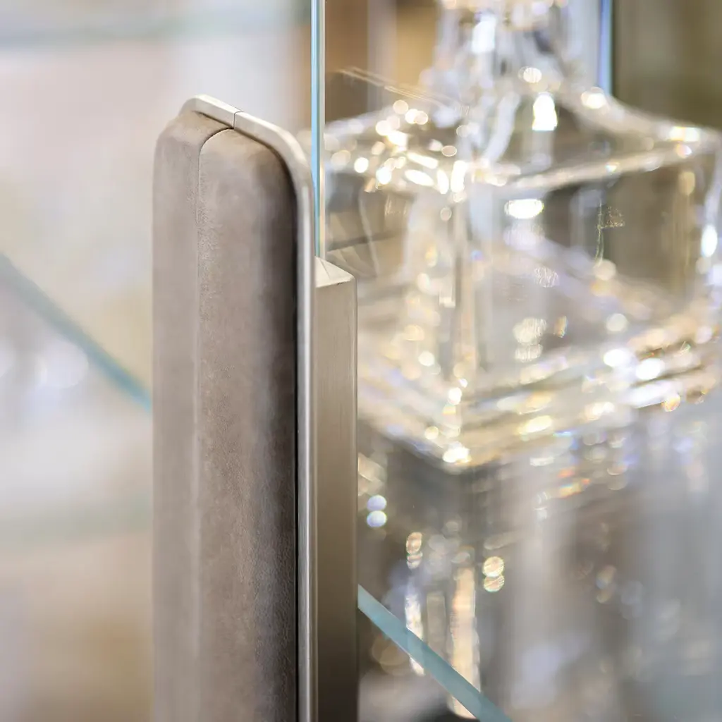 This elegant display case is crafted from solid wood, distinguished by a polyester Pearl Champagne matte lacquered finish. Enhanced with satin gold metal details, the Hanami Urban Chic Display Case features two large glass doors with metal and nubuck handles. Complete with a faux nubuck leather back for a refined finish.