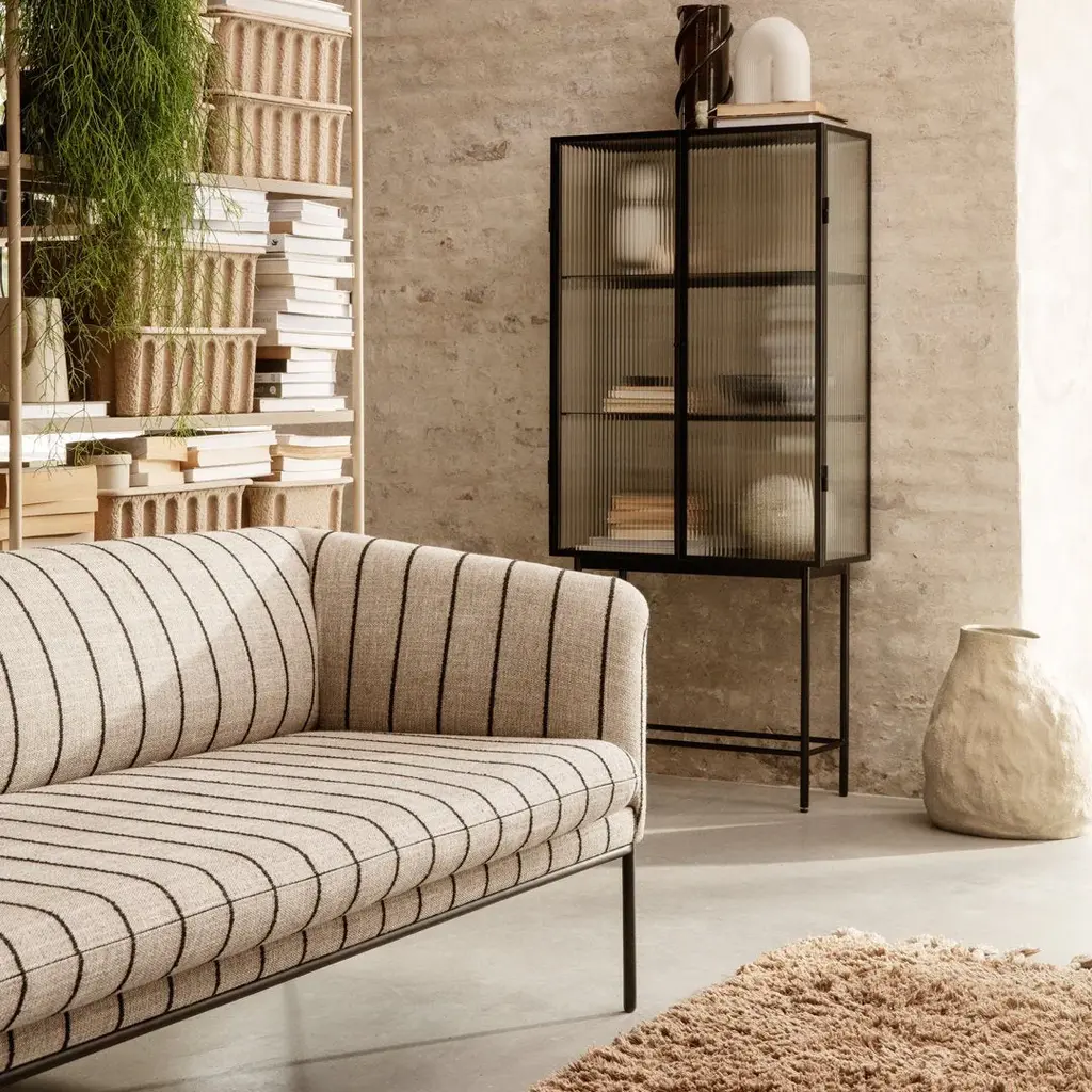 Opposites attract on this cabinet, crafted from sleek powder coated metal in soft, creamy color and corrugated glass. The glass doors close seamlessly and quietly thanks to magnets, and open to reveal two powder coated metal shelves. Use in the bathroom to stylishly store beauty essentials or as a modern focal point in your dining room to store dinnerware and more.