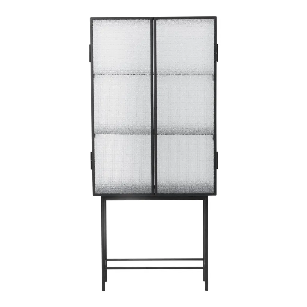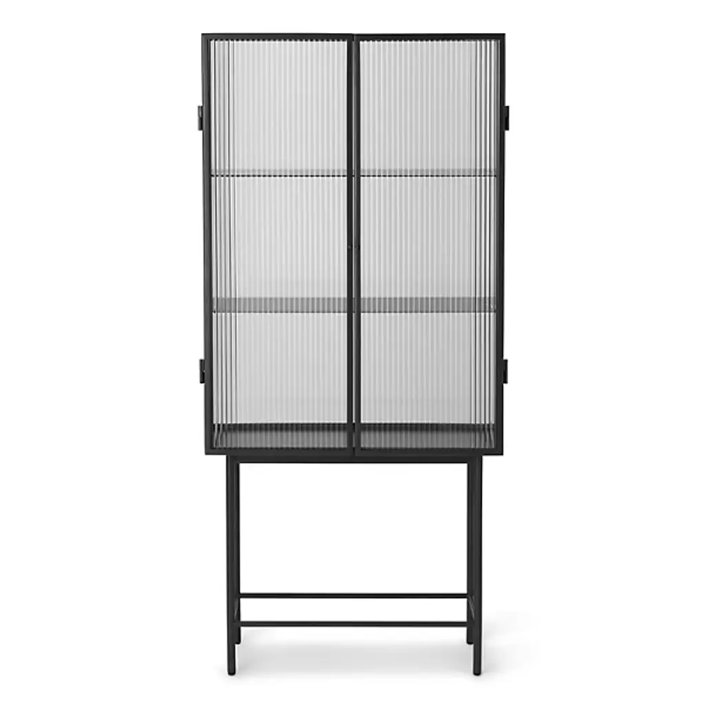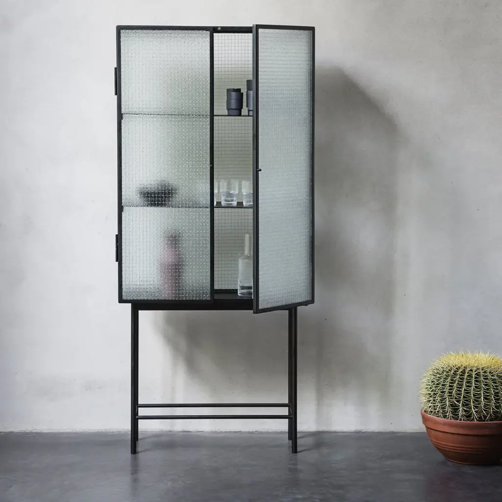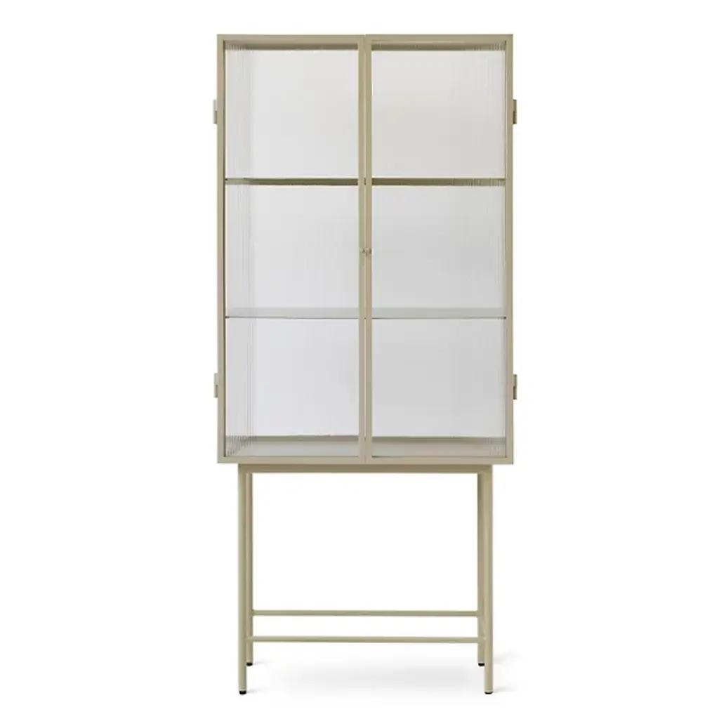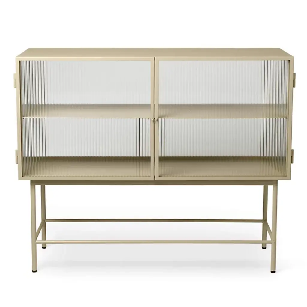 Opposites attract on this cabinet, crafted from sleek powder coated metal in soft, creamy color and corrugated glass. The glass doors close seamlessly and quietly thanks to magnets, and open to reveal two powder coated metal shelves. Use in the bathroom to stylishly store beauty essentials or as a modern focal point in your dining room to store dinnerware and more.