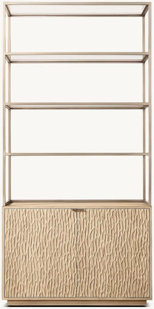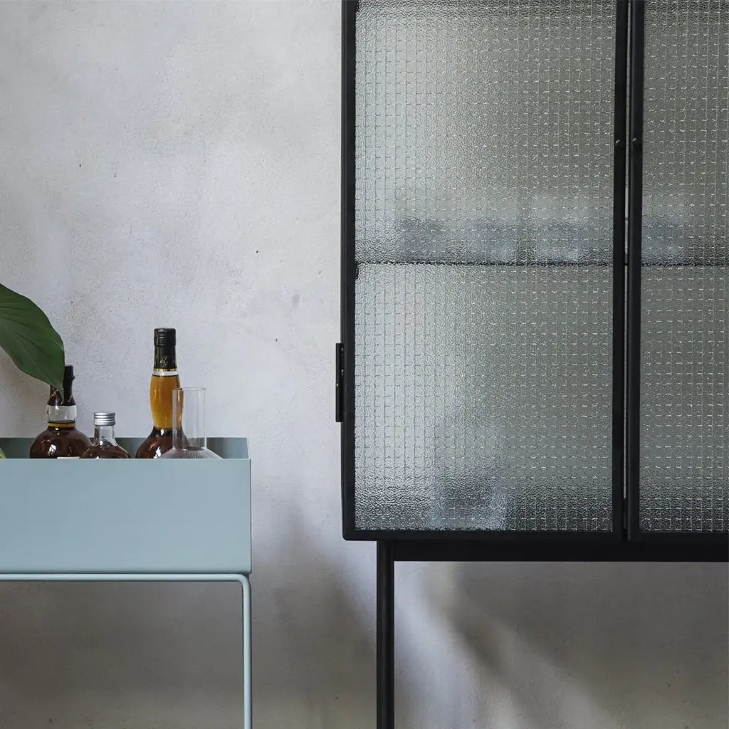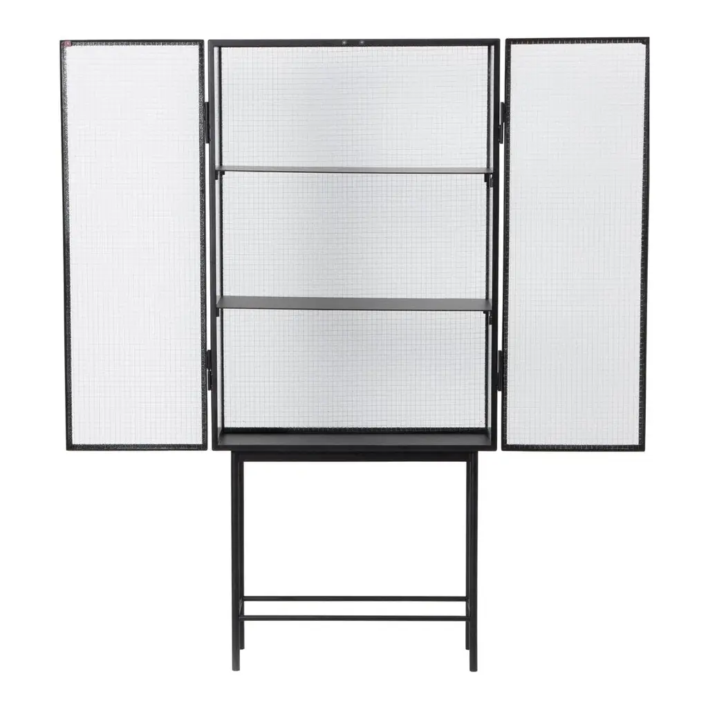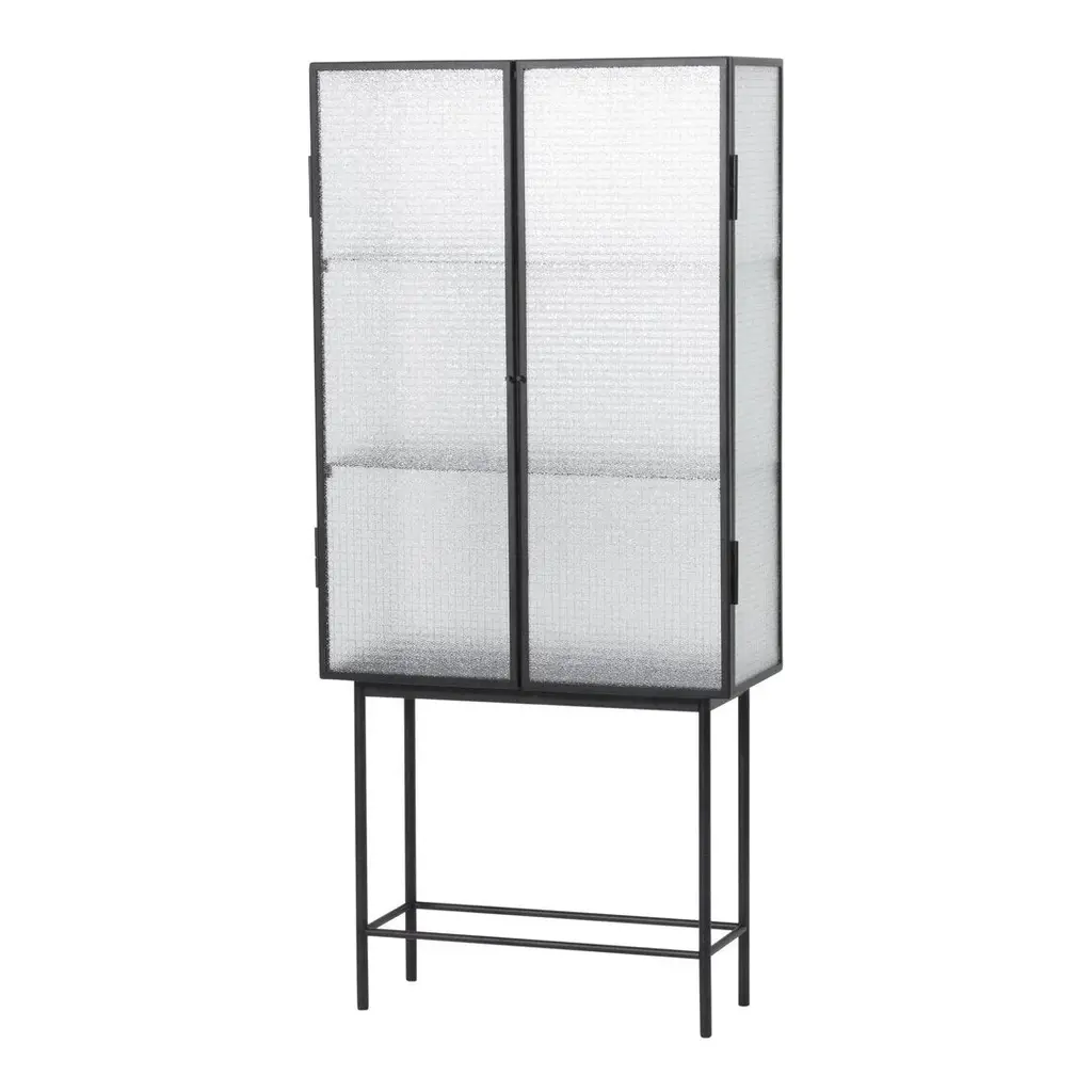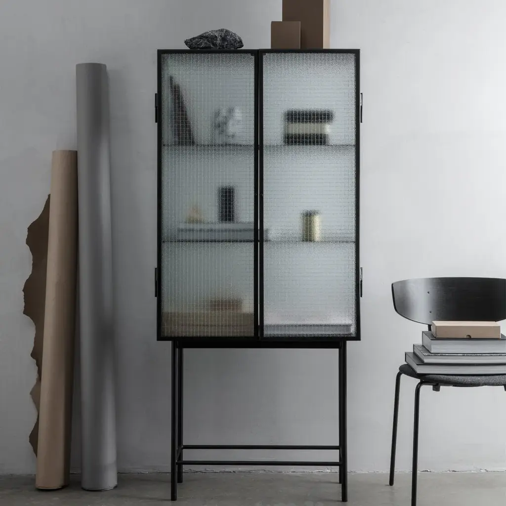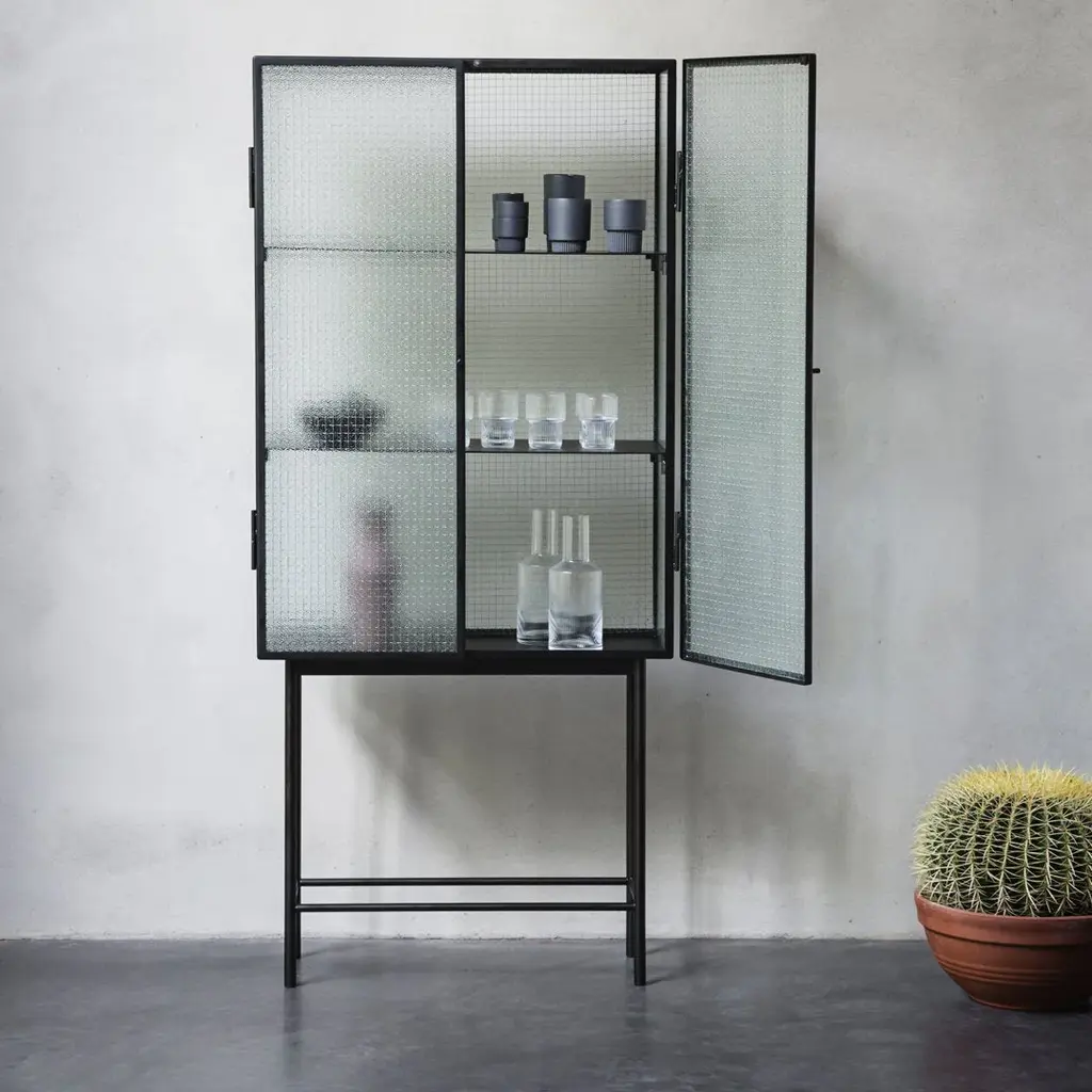 Opposites attract on this cabinet, crafted from sleek powder coated metal in soft, creamy color and corrugated glass. The glass doors close seamlessly and quietly thanks to magnets, and open to reveal two powder coated metal shelves. Use in the bathroom to stylishly store beauty essentials or as a modern focal point in your dining room to store dinnerware and more.