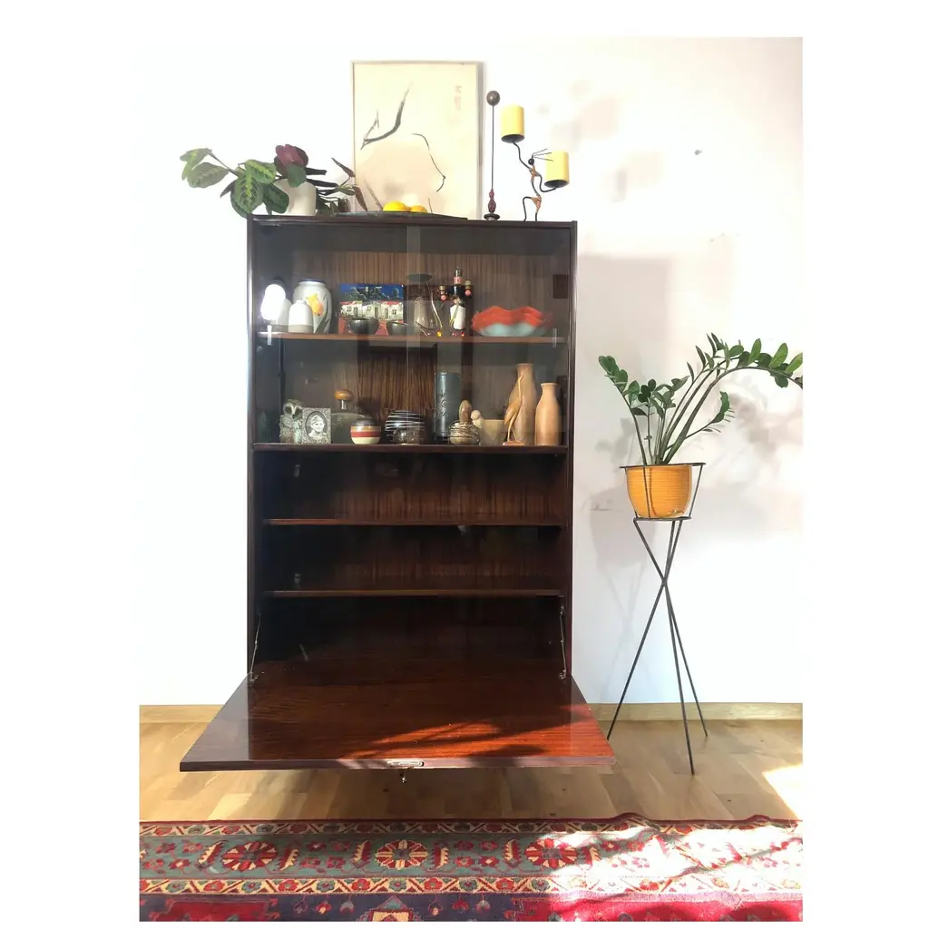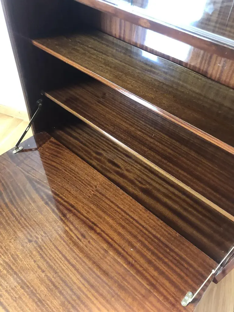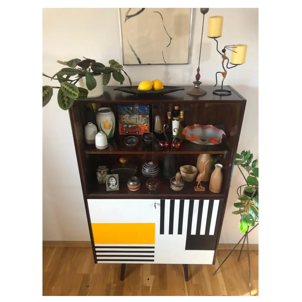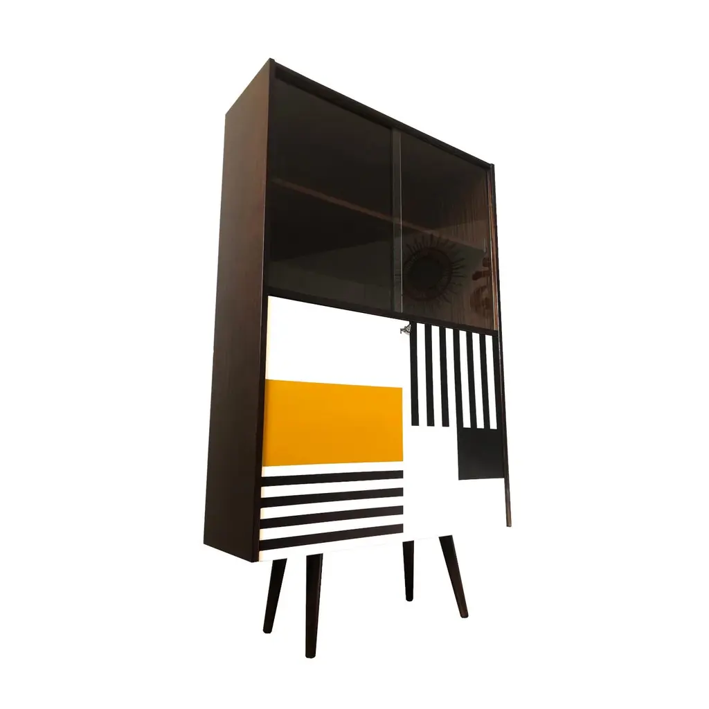 Bookcase with display case and bar, Poland, 1970s Bar with key lock, two wooden shelves inside, contemporatry hand-painted acrylic op’art motif on the front Dark brown veneer after renovation, semi matt Slanted cylindrical, slender, unscrewable legs Glass sliding doors in the upper part the bookcase has been partially renovated, finished in accordance with the rules of the upcycled vintage trend. the bookcase is from the 70s of the last century, but finally has been changed through artistic invetions. This piece has an attribution mark, I am sure that it is completely authentic and take full responsibility for any authenticity issues arising from misattribution