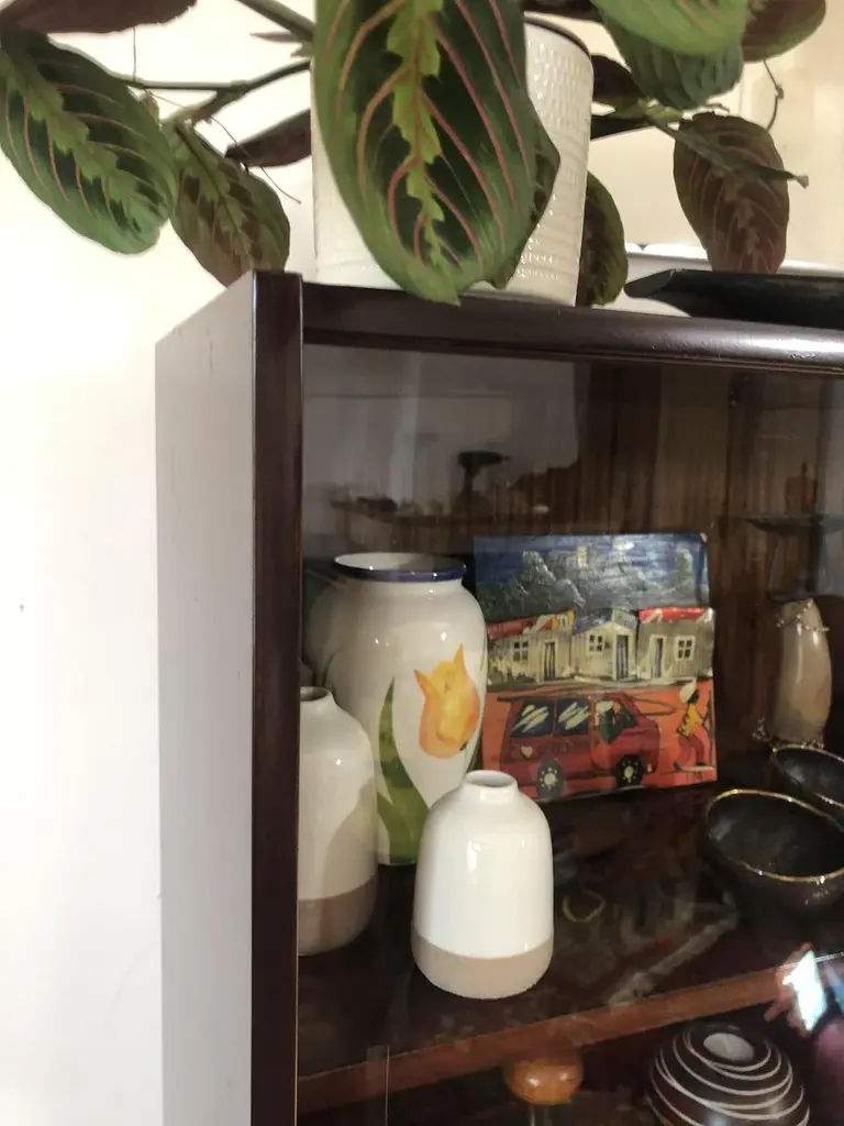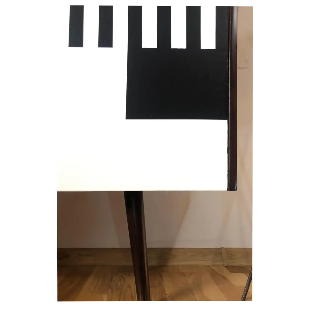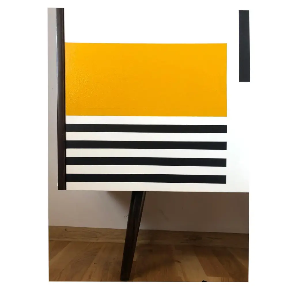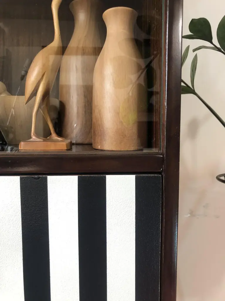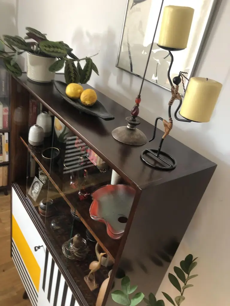 Bookcase with display case and bar, Poland, 1970s Bar with key lock, two wooden shelves inside, contemporatry hand-painted acrylic op’art motif on the front Dark brown veneer after renovation, semi matt Slanted cylindrical, slender, unscrewable legs Glass sliding doors in the upper part the bookcase has been partially renovated, finished in accordance with the rules of the upcycled vintage trend. the bookcase is from the 70s of the last century, but finally has been changed through artistic invetions. This piece has an attribution mark, I am sure that it is completely authentic and take full responsibility for any authenticity issues arising from misattribution