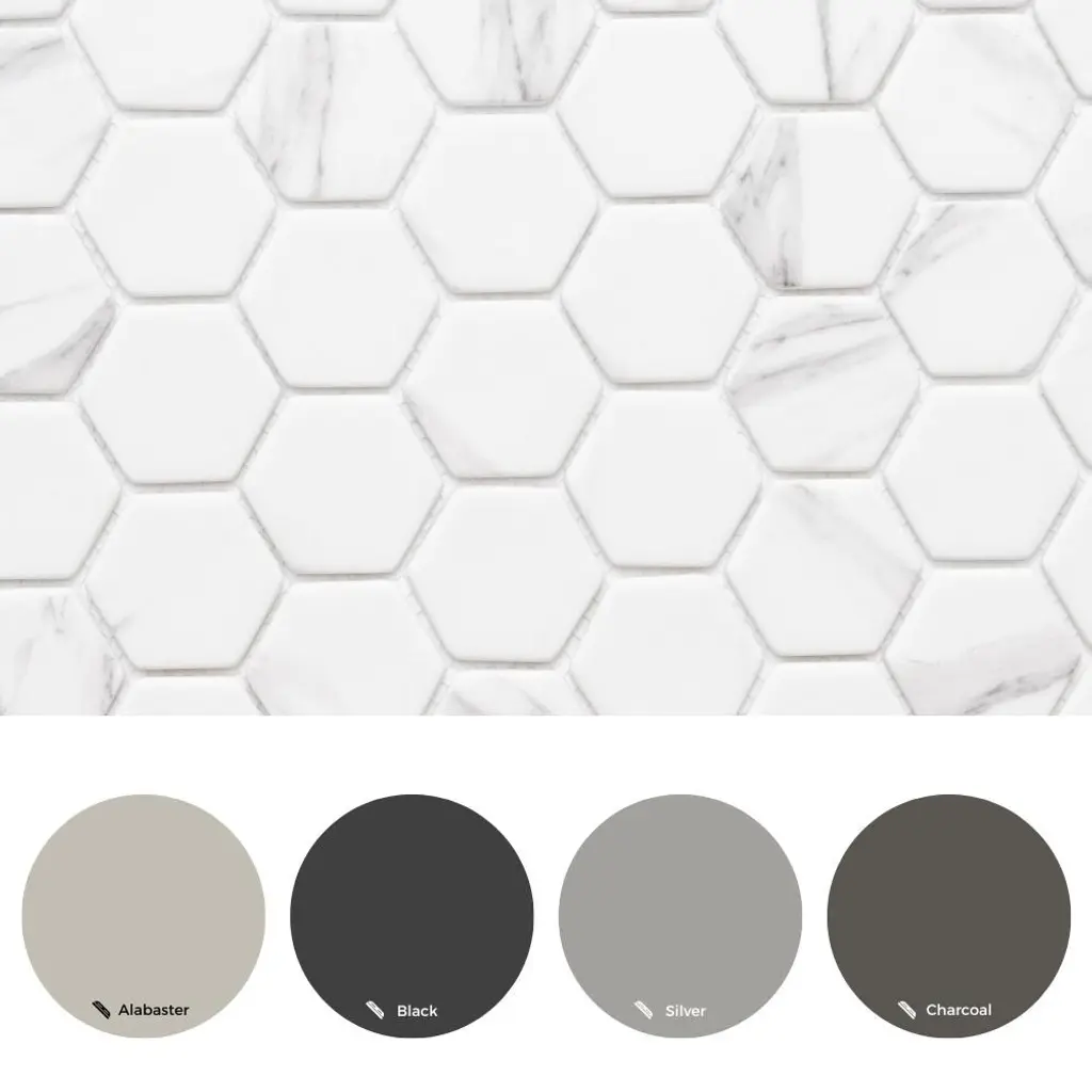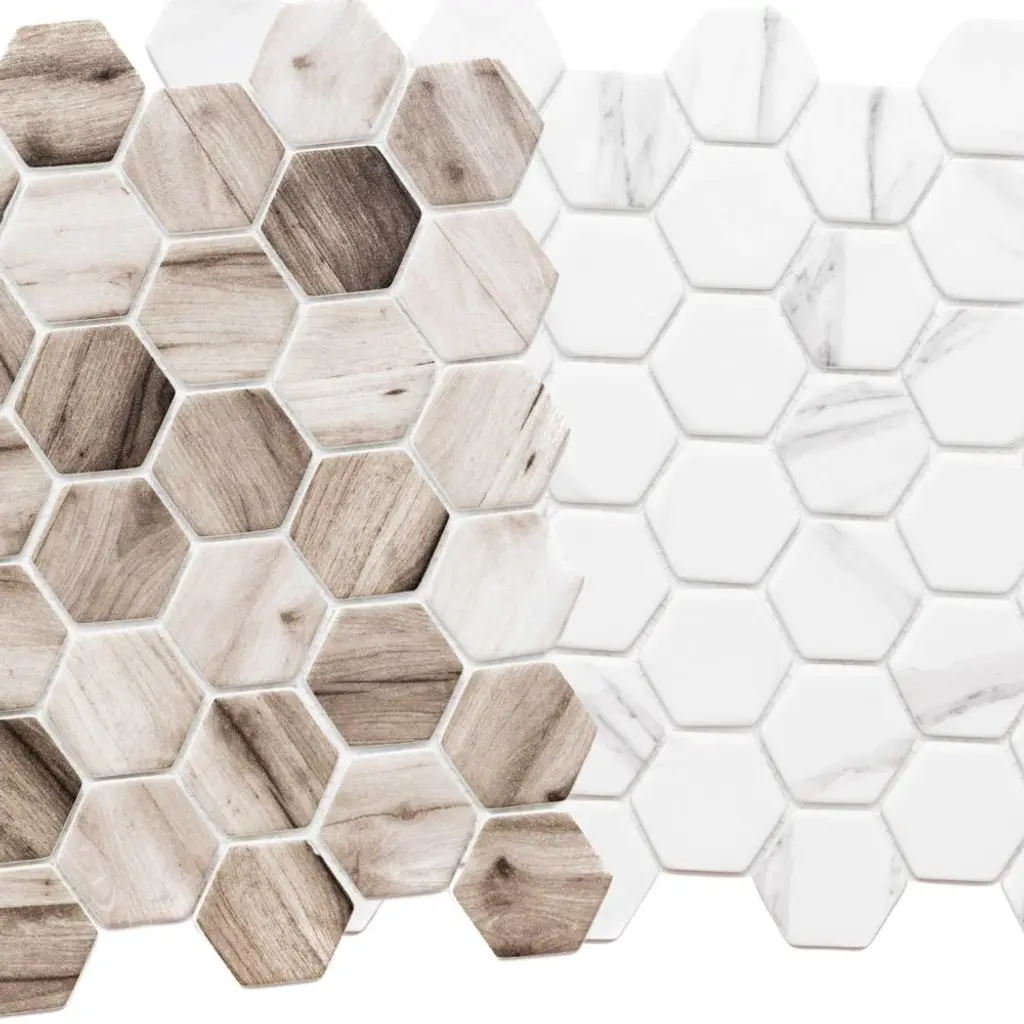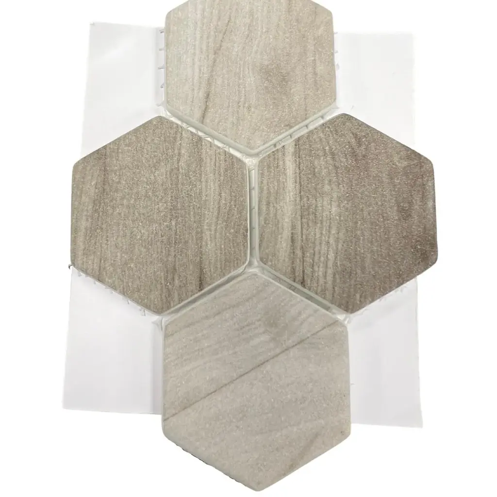 We love this beautiful recycled glass mosaic wall tile. With four eye-catching colors and a natural wood look, this hexagon glass mosaic tile is perfect for your next bathroom renovation! The Tile Life Recycled 2 inches x 2 inches Honeycomb Glass Mosaic Wall Tile features a unique wood grain look in a matte finish, combining eco-friendly design with natural style. Mesh-backed for easy installation and precision cutting, its rectified, straight-edge format is perfect for backsplashes, bathrooms, kitchens, and walls. Approved for residential and commercial indoor use, and available in five earthy tones: Ocean, Grey, Beige, Carrara, and Greige. Each case includes 14 mosaic sheets, covering approximately 15.68 square feet—perfect for kitchens, bathrooms, and accent walls. Each sheet covers 1.12 square feet and features a sample tile size of 4" x 4", making it easy to visualize and plan your layout. FEATURES:DIMENSIONS: