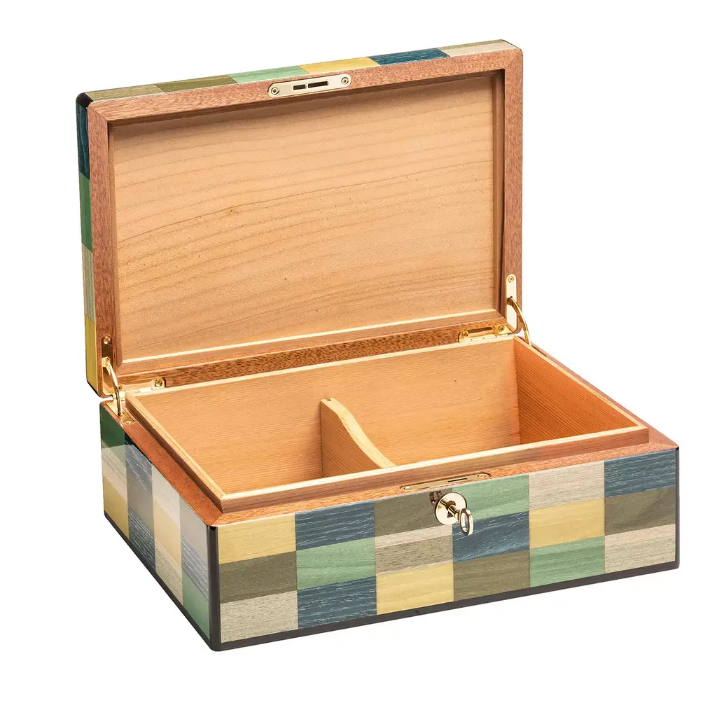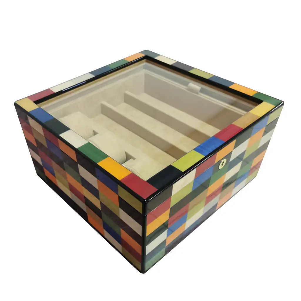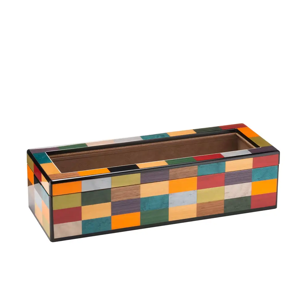 A superlative showcase of craftsmanship, this watch case will be an original addition to any bedroom vanity, especially when displayed with the Venezia Rialto Jewelry Box. Fashioned of mahogany enriched with an inlay veneering of colorful rectangles enhanced with a brushed and polished finish, it is lined with beige Alcantara and enriched with a mirrored glass on the inner top. Storing up to 6 watches, it is enriched with gold-finished metal details.