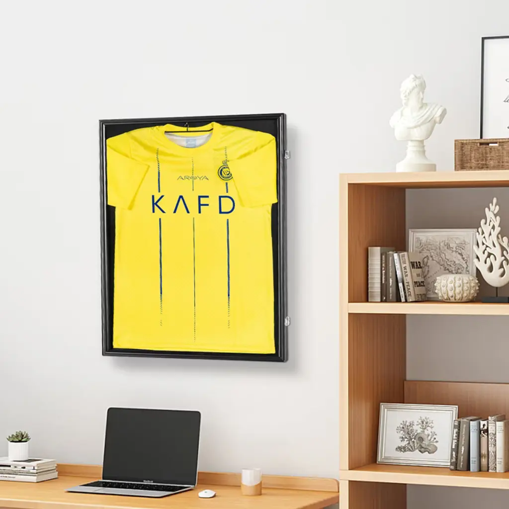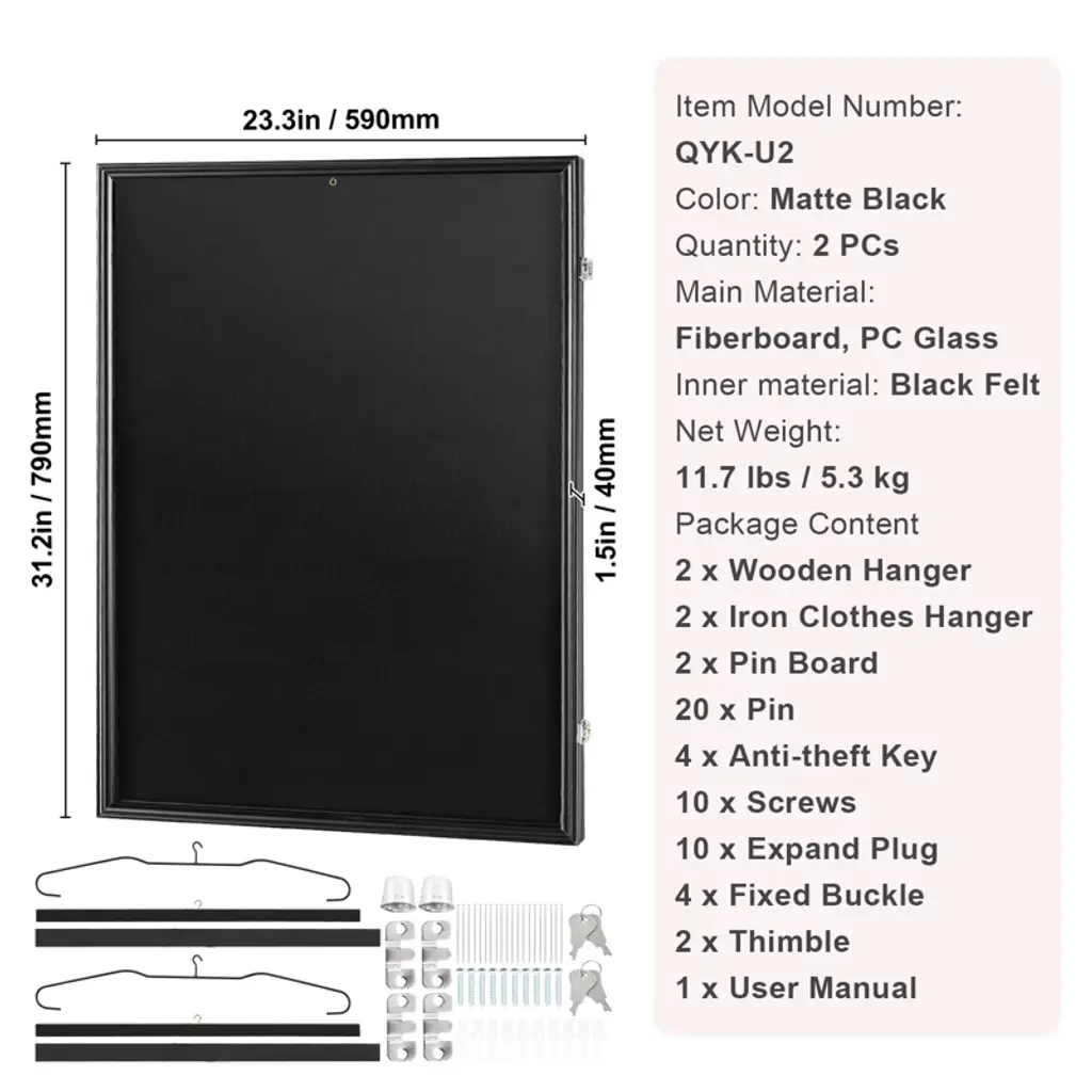 Feature: Matte Black Wood Frame: Perfect for showcasing your sports jerseys! Our set includes two sports jersey frame display cases, each measuring 23.3 x 31.2 x 1.5 inches (590 x 790 x 40 mm) and is tailor-made for displaying a variety of sports jerseys. Crafted from wood, the frame boasts a sleek matte black finish that's fade-resistant, ensuring your prized possessions stand out for years to come. (Jerseys not included) Ultimate Protection: On the exterior, two anti-theft locks deter unauthorized touching or movement by others. Elevate your showcasing experience with peace of mind. Experience Crystal-Clear Display: Our jersey frame display case features PC glass panels with exceptional transparency (over 92%) and UV protection (98% UV resistance), providing a high-definition viewing experience. Your jerseys stay vibrant and resist fading or discoloration, even under prolonged exposure to light. Invest in quality and protection for your memorabilia today! Versatile Display Options: We've got you covered with various accessories to showcase your jerseys! In addition to essential installation parts, we provide a wooden hanger, an iron hanger, and 10 fixed pins. The wooden hanger is perfect for sleeveless jerseys like basketball jerseys, while the iron hanger is ideal for smaller soccer jersey shirts. The fixed pins are best suited for long-sleeved jerseys like soccer and hockey jerseys, ensuring a wrinkle-free display. Fit for Various Various Surface: Elevate your space with our versatile jersey frame display case, which is perfect for mounting on various wall surfaces. Say goodbye to dull walls as our jersey display case adds aesthetic value and personalization to your space. Installation is a breeze—all you need is a drill to make holes. Transform your space effortlessly and showcase your memorabilia in style! Package Content 2 x Wooden Hanger 1 x User Manual