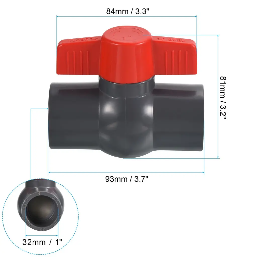 Color: Grey, Material: UPVC, Inner Diameter: 32mm / 1 Inch, Handle Length: 84mm / 3.3 Inch, Size: 93 x 81mm / 3.7 x 3.2 Inch (L*H), Packing List: 2 x UPVC Ball ValveAdvantage: Made of UPVC, the weight is lighter than metal fittings, the impact strength is high, it is not easy to rust and scale, and it is firmly installed; the butterfly handle with manual on/off control is easy to operate; the overall polishing treatment makes the pipe fittings beautiful and wear-resistant, and the water flow is smooth, The water pipe connection method is glued.INSTRUCTION: Made of UPVC material, smooth plastic tubes with corresponding outer diameters at both ends are bonded by glue.Application: UPVC Ball Valve Fittings is a straight-through valve connecting two pipes in the same direction, ball valves use a spherical disc to control flow between pipes, pipes, or hoses. Suitable for indoor and outdoor use such as sewer pipes, daily household, landscape and farmland irrigation, swimming pools, cold water, ventilation, waste applications, aquaculture, and agricultural irrigation systems.NOTE: Wear gloves to operate. The end of the casing should be smooth and tidy. Do not apply too much adhesive to the UPVC material. Regularly check during use, and replace it in time if it is aging.UPVC Ball Valve Fittings is a straight-through valve connecting two pipes in the same direction, ball valves use a spherical disc to control flow between pipes, pipes, or hoses. Suitable for indoor and outdoor use such as sewer pipes, daily household, landscape and farmland irrigation, swimming pools, cold water, ventilation, waste applications, aquaculture, and agricultural irrigation systems.Specification Color: GreyMaterial: UPVCInner Diameter: 32mm / 1 InchHandle Length: 84mm / 3.3 InchSize: 93 x 81mm / 3.7 x 3.2 Inch (L*H)Packing List: 2 x UPVC Ball ValveAdvantage Made of UPVC, the weight is lighter than metal fittings, the impact strength is high, it is not easy to rust and scale, and it is firmly installed; the butterfly handle with manual on/off control is easy to operate; the overall polishing treatment makes the pipe fittings beautiful and wear-resistant, and the water flow is smooth, The water pipe connection method is glued.Instruction Made of UPVC material, smooth plastic tubes with corresponding outer diameters at both ends are bonded by glue.NOTE Wear gloves to operate. The end of the casing should be smooth and tidy. Do not apply too much adhesive to the UPVC material. Regularly check during use, and replace it in time if it is aging.
