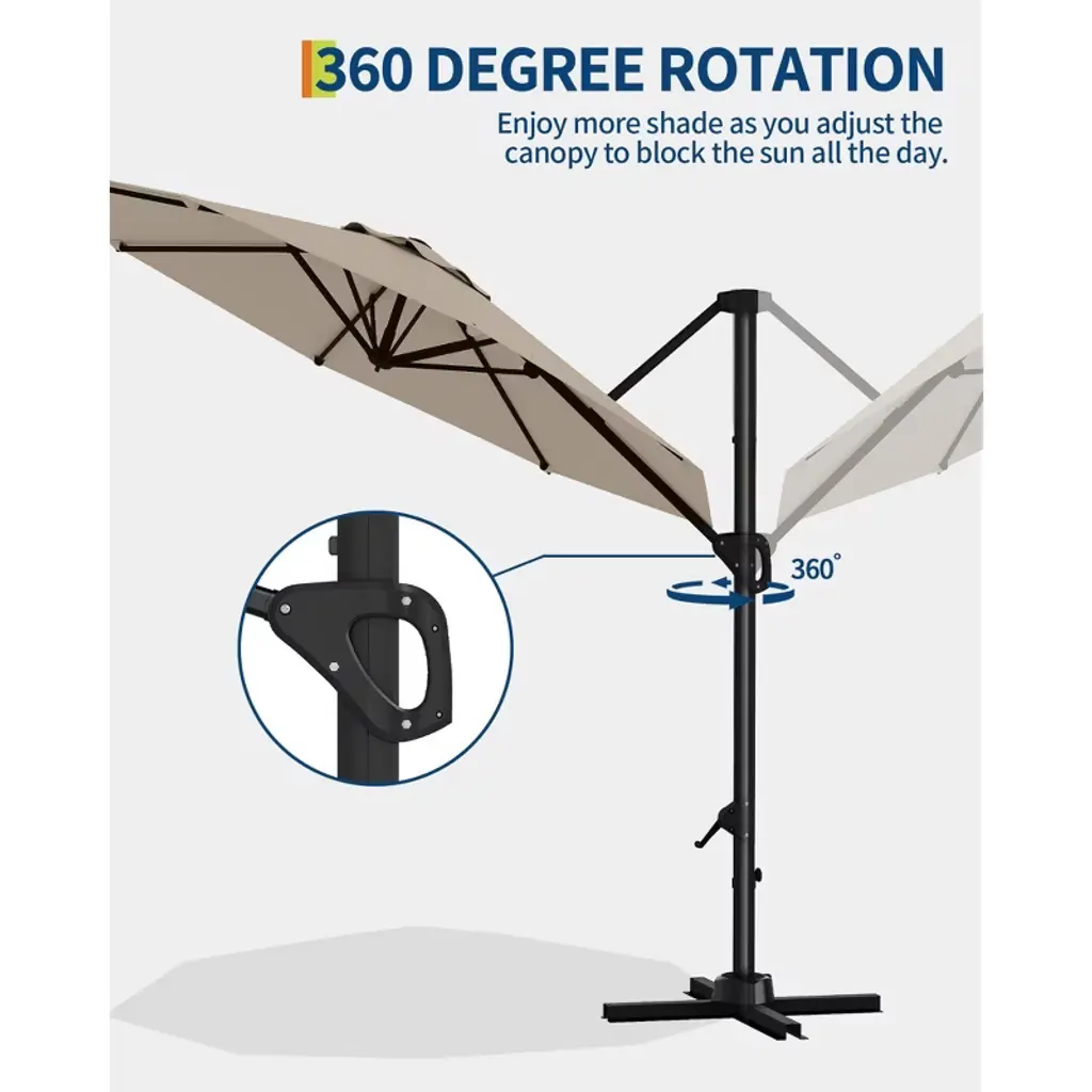 Effortless 360° Rotation: Simply step on the foot pedal to unlock and smoothly rotate the umbrella to the suitable angle, ensuring all-day shade wherever you need it in your outdoor space. Easy-Lock Handle, 100 Tilt Angles: Innovative EASY-LOCK sliding handle glides smoothly and securely into place, letting you easily adjust the canopy along 100 positions for ideal sun protection at any time. Durable Structure: Sturdy aluminum pole and strong steel ribs with rust-resistant powder coating offer lasting support and stability, giving you peace of mind even on breezy days. Premium Canopy: High-density polyester fabric offers superior UV protection and resists fading in the sun. Classic round design blends stylishly into patios, gardens, or poolside retreats. Quickly Setup: Main frame and canopy come pre-assembled, just attach the cross base and add weights (not included, 100lbs+ recommended). Perfect for patio, balcony, pool, or backyard gatherings.