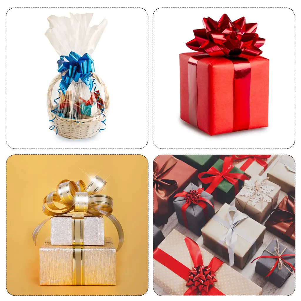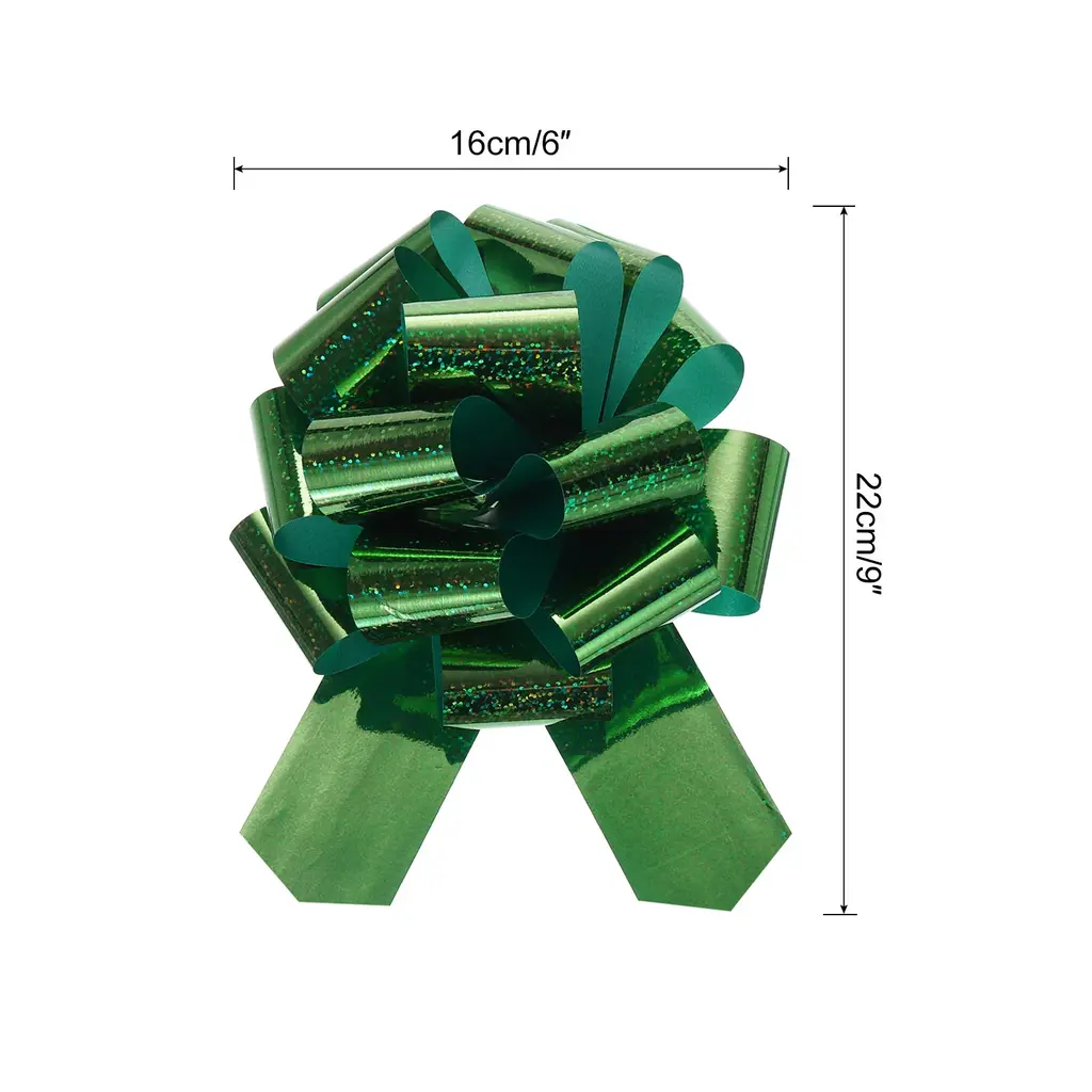 What is this?Iridescent bright colored organza pull bows with ribbons are suitable for wedding car decoration bows, gift wrapping bows, large present decorating bows, DIY crafts handicraft decoration, gift wrapping packaging, holiday decoration, wedding gift baskets decoration, flower design, party decoration, floral bouquet ribbon, scrapbooking, and can be used to decorate Valentine's Day, Christmas, Halloween, Thanksgiving, Teacher's Day, etc.What will I get?Gift wrapping bows, are in size of :16cm/6 inch width, 22cm/9 inch heightIn the package of: 10pcs x Gift wrapping bowsIs there any advantages of the product?Extra large glitter pull Bow, bright color, beautiful, which plays a good decorative role, especially suitable for holiday, wedding and party decoration, as ribbons and bows for gift wrapping; Sparkling gift big bows for presents, beautiful and elegant, soft, comfortable to the touch, and durableHow to use it?Steps of installation: 1. Select gift wrapping bows with appropriate specification; 2. For gift wrapping, holiday decorationWhat should I notice?Please pay attention to select the gift wrapping bows with suitable specifications