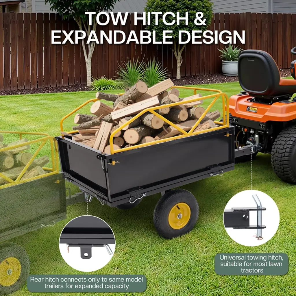 Make yard work faster and less tiring with the Garden Utility Trailer — a rugged 500 lb / 12 cu. ft. tow-behind cart built for real outdoor jobs. Its reinforced steel bed and removable side rails give you stable, flexible hauling for branches, mulch, tools, or firewood; the rear-mounted hitch lets you connect additional trailers of the same model to expand your load in minutes; a one-pull dump and handy front handle make solo unloading and hookup effortless; and 13" pneumatic all-terrain tires roll smoothly over grass, gravel, mud, or light snow. Durable, versatile, and easy to store — the perfect addition to your tractor, ATV, or lawn gear to get more done with less strain.