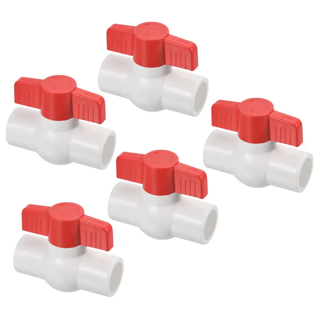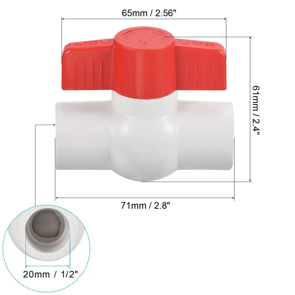 Color: White, Material: UPVC, Inner Diameter: 20mm / 1/2 Inch, Handle Length: 65mm / 2.56 Inch, Size: 71 x 61mm / 2.8 x 2.4 Inch (L*H), Packing List: 5 x UPVC Ball ValveAdvantage: Made of UPVC, the weight is lighter than metal fittings, the impact strength is high, it is not easy to rust and scale, and it is firmly installed; the butterfly handle with manual on/off control is easy to operate; the overall polishing treatment makes the pipe fittings beautiful and wear-resistant, and the water flow is smooth, The water pipe connection method is glued.INSTRUCTION: Made of UPVC material, smooth plastic tubes with corresponding outer diameters at both ends are bonded by glue.Application: UPVC Ball Valve Fittings is a straight-through valve connecting two pipes in the same direction, ball valves use a spherical disc to control flow between pipes, pipes, or hoses. Suitable for indoor and outdoor use such as sewer pipes, daily household, landscape and farmland irrigation, swimming pools, cold water, ventilation, waste applications, aquaculture, and agricultural irrigation systems.NOTE: Wear gloves to operate. The end of the casing should be smooth and tidy. Do not apply too much adhesive to the UPVC material. Regularly check during use, and replace it in time if it is aging.UPVC Ball Valve Fittings is a straight-through valve connecting two pipes in the same direction, ball valves use a spherical disc to control flow between pipes, pipes, or hoses. Suitable for indoor and outdoor use such as sewer pipes, daily household, landscape and farmland irrigation, swimming pools, cold water, ventilation, waste applications, aquaculture, and agricultural irrigation systems.Specification Color: WhiteMaterial: UPVCInner Diameter: 20mm / 1/2 InchHandle Length: 65mm / 2.56 InchSize: 71 x 61mm / 2.8 x 2.4 Inch (L*H)Packing List: 5 x UPVC Ball ValveAdvantage Made of UPVC, the weight is lighter than metal fittings, the impact strength is high, it is not easy to rust and scale, and it is firmly installed; the butterfly handle with manual on/off control is easy to operate; the overall polishing treatment makes the pipe fittings beautiful and wear-resistant, and the water flow is smooth, The water pipe connection method is glued.Instruction Made of UPVC material, smooth plastic tubes with corresponding outer diameters at both ends are bonded by glue.NOTE Wear gloves to operate. The end of the casing should be smooth and tidy. Do not apply too much adhesive to the UPVC material. Regularly check during use, and replace it in time if it is aging.