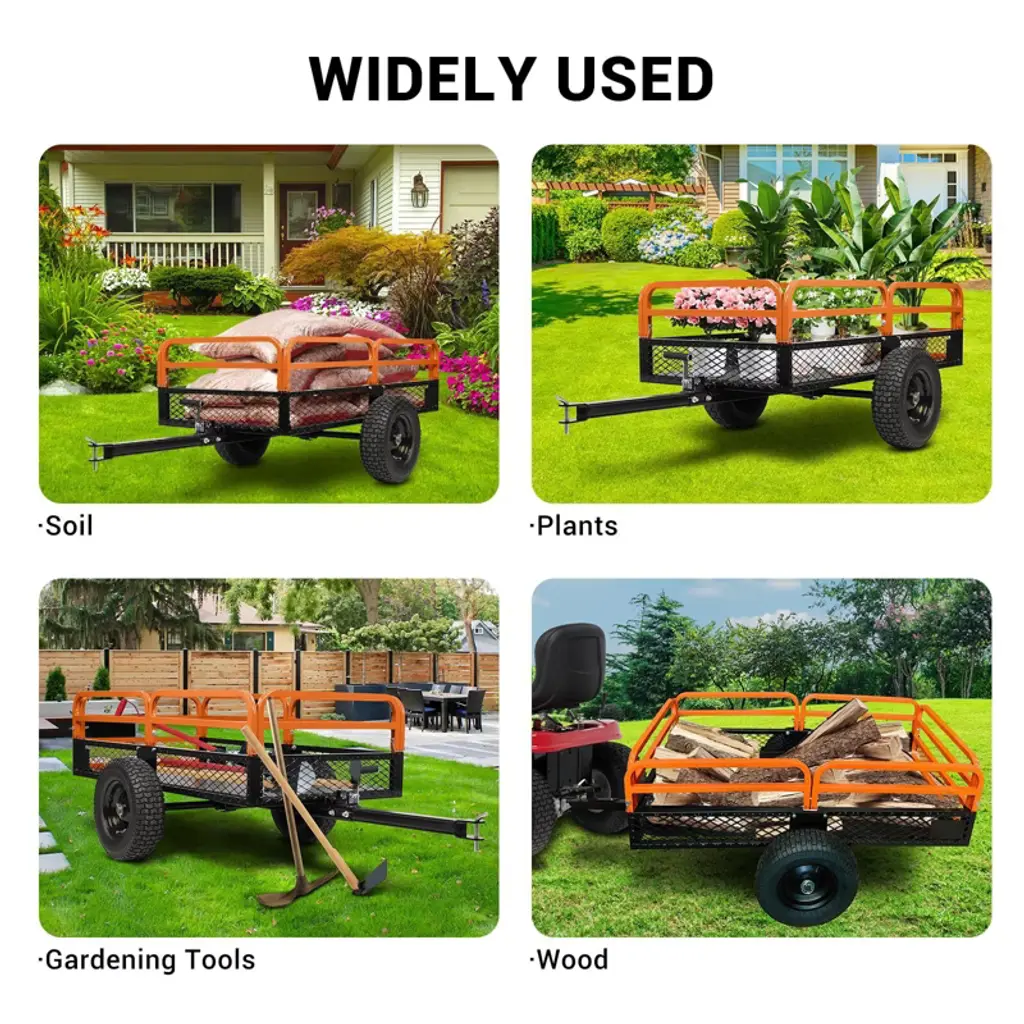 Steel Utility Trailer: Connects to tractors, lawnmowers, ATVs, or UTVs for versatile hauling. Features four-sided railings to contain materials like soil or yard debris. The reinforced steel frame provides durability for demanding outdoor tasks. Dumping is simplified with hand-pull or foot-step release mechanisms and a quick-opening rear gate. Large pneumatic tires support transport over varied terrain. Designed for cargo transport only.